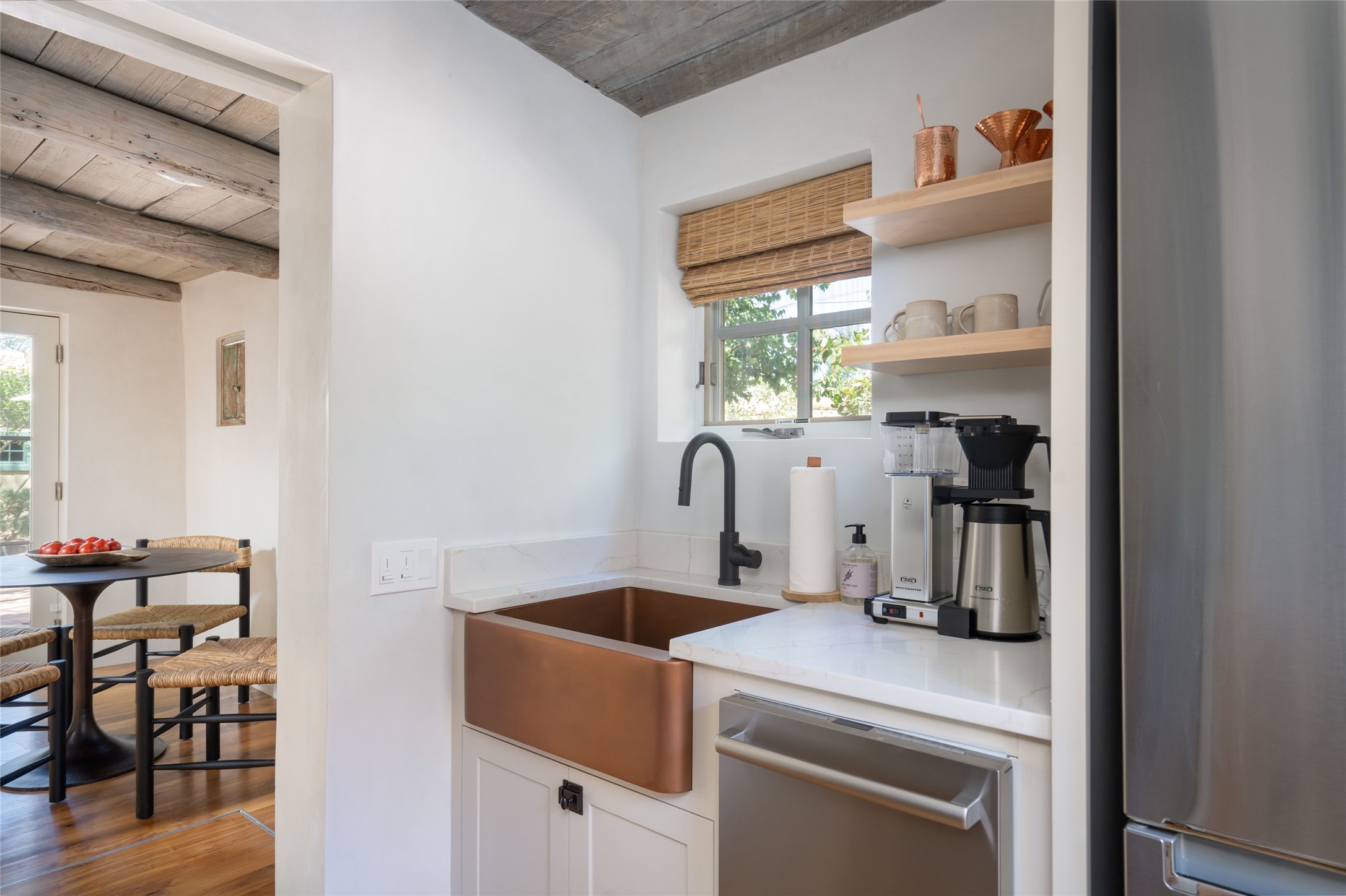 Recently renovated Pueblo-style compound that captures the spirit of Santa Fe in the heart of the coveted Historic Eastside. As you enter this enchanting property, you are greeted by a beautifully landscaped courtyard, a tranquil escape with multiple seating areas, perfect for indulging in quiet moments or lively gatherings. The property exudes old-world charm, featuring five wood-burning fireplaces, traditional vigas and beams, and a delightful mix of brick, tile, and wood floors that create a warm and welcoming atmosphere. The 1,521 sq. ft. main house offers 2 spacious bedrooms and 2.5 elegantly appointed baths. 2 dedicated parking spots lead to a private entrance. The thoughtfully remodeled interior showcases a redesigned kitchen that is both functional and exquisite, featuring custom cabinetry and high-end appliances. New primary suite is adorned with reclaimed terracotta Giallo-style tile, a chic wet bar, and a sophisticated Domingue waterproof plaster bath. Additionally, there is a rare finished 554 sq. ft. basement. Complementing the main residence is a charming 1,216 sq. ft. guesthouse. This newly renovated space features two parking spots and a gated entrance. With its open-concept design and skylights, the guesthouse is bathed in natural light, creating a bright and airy ambiance. Ideally located, just moments away from Downtown Subscription, a local coffee house and gathering spot, as well as Canyon Road, Kakawa Chocolate, and Kaune's Neighborhood Market