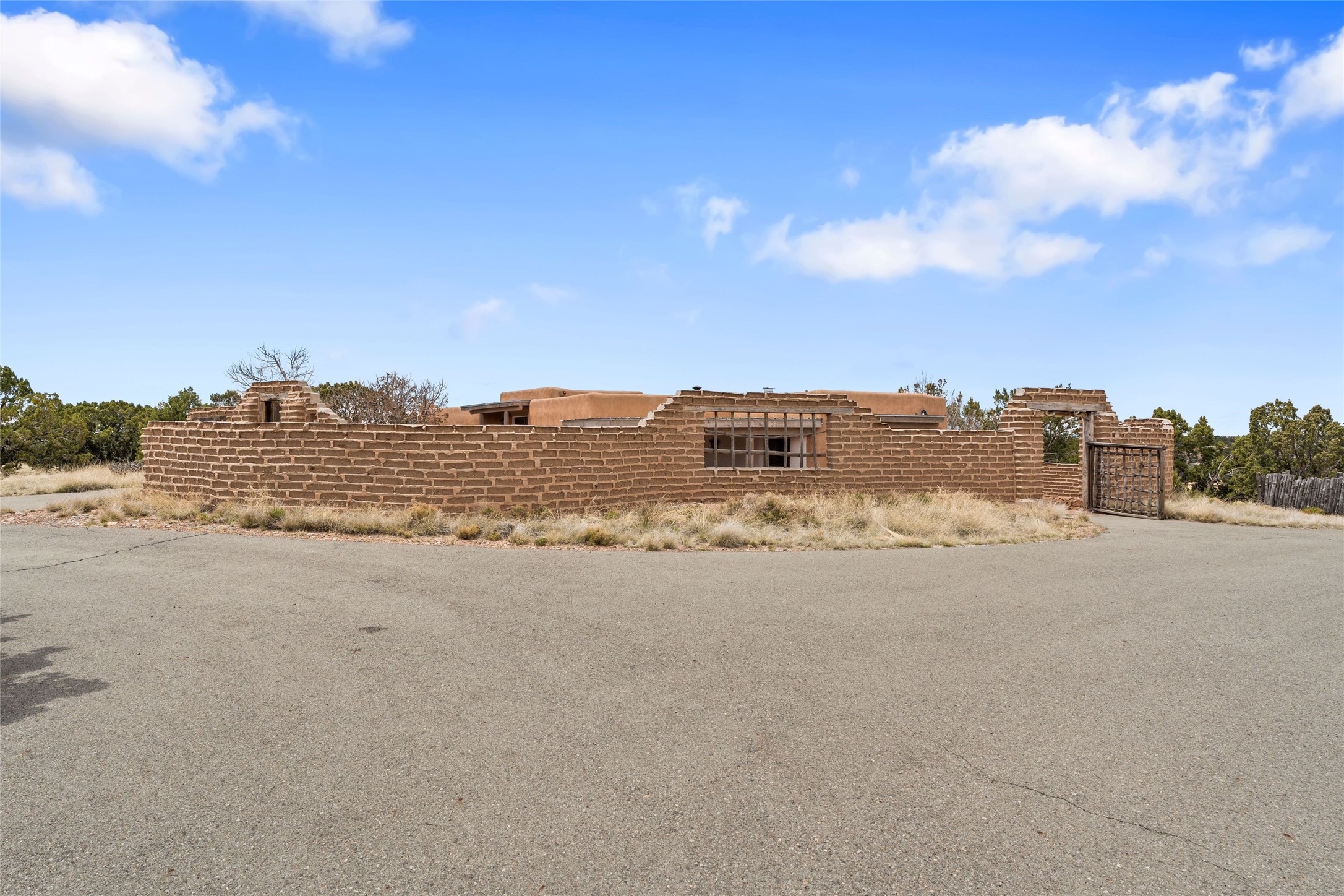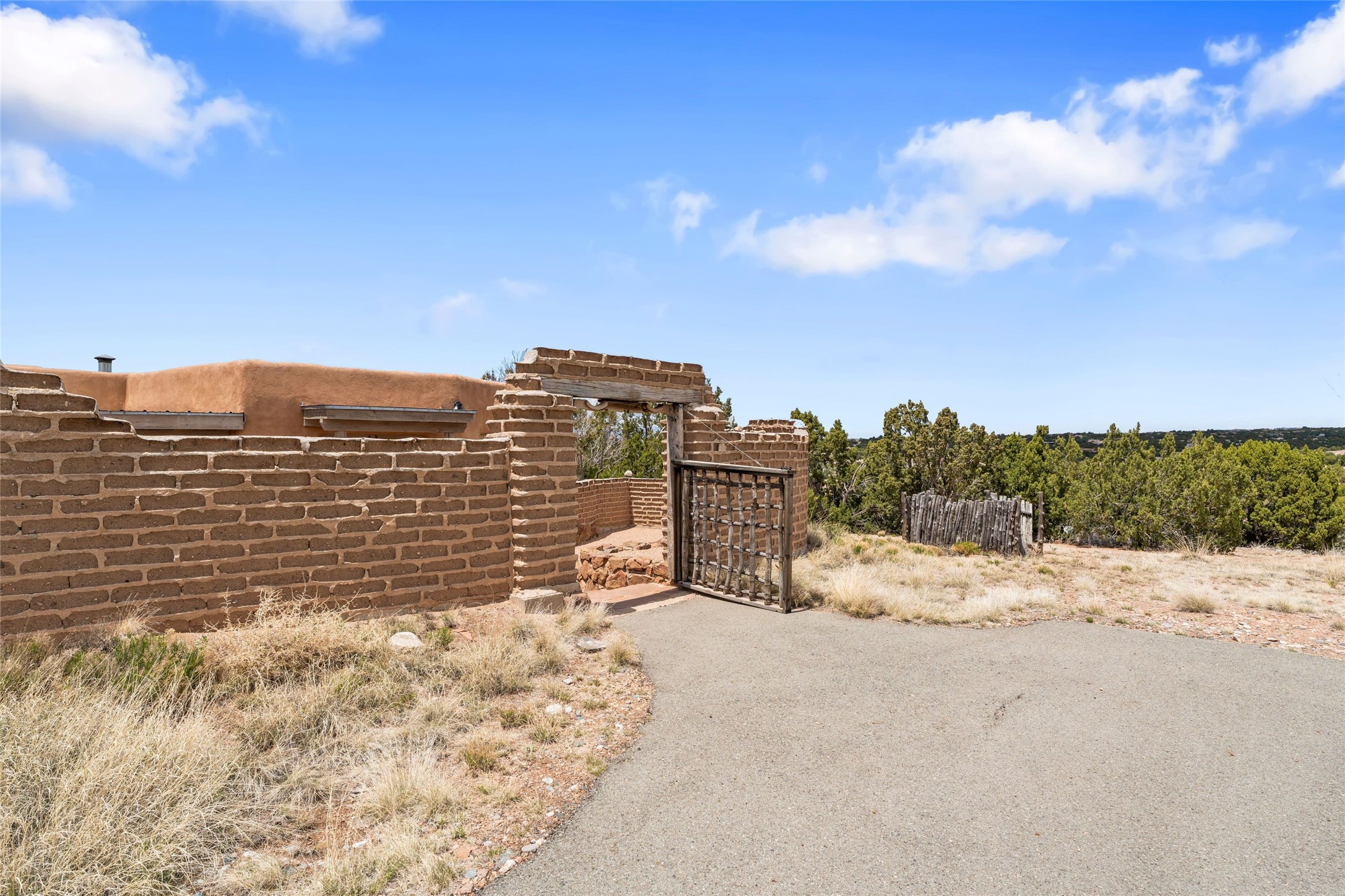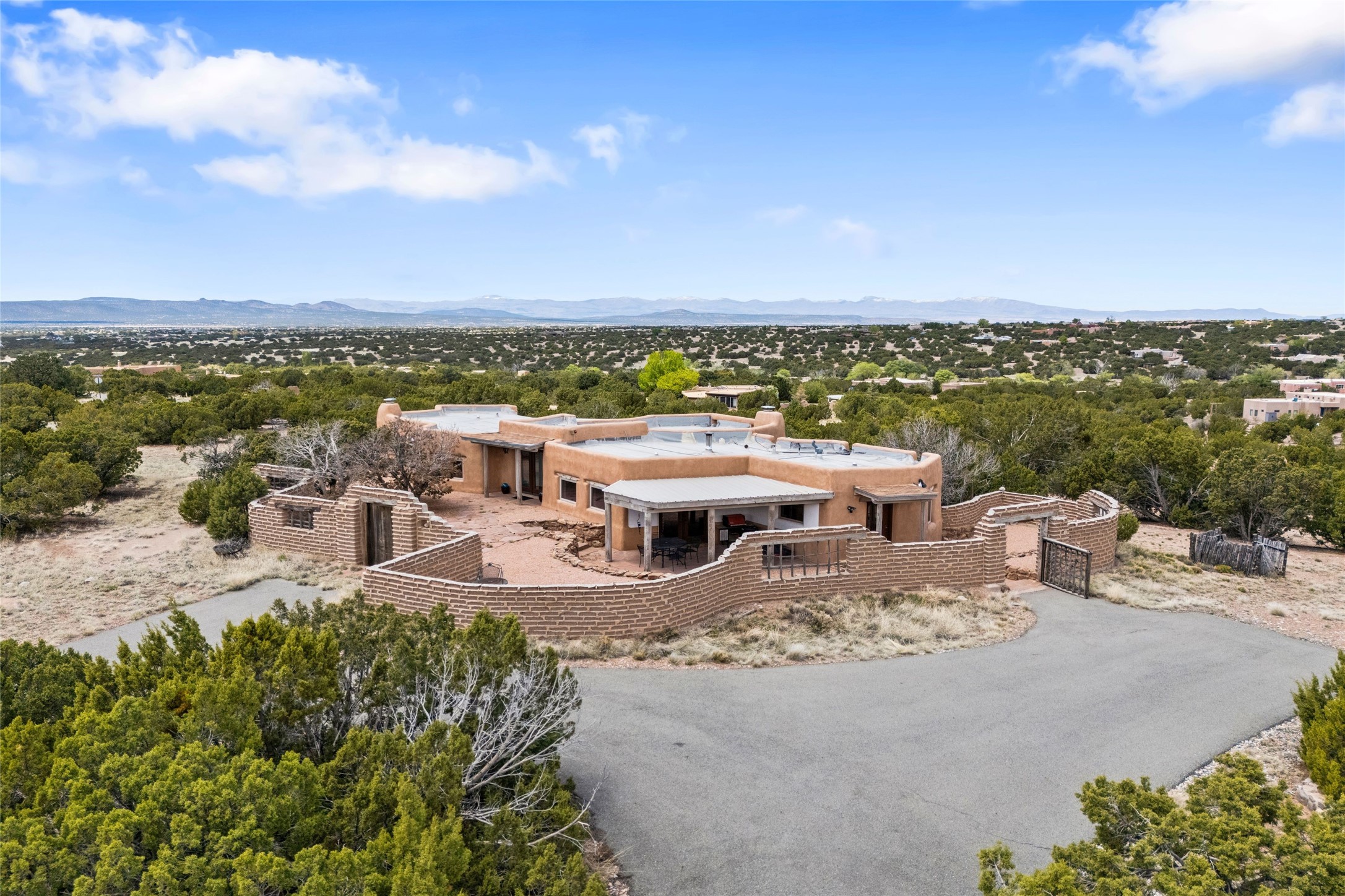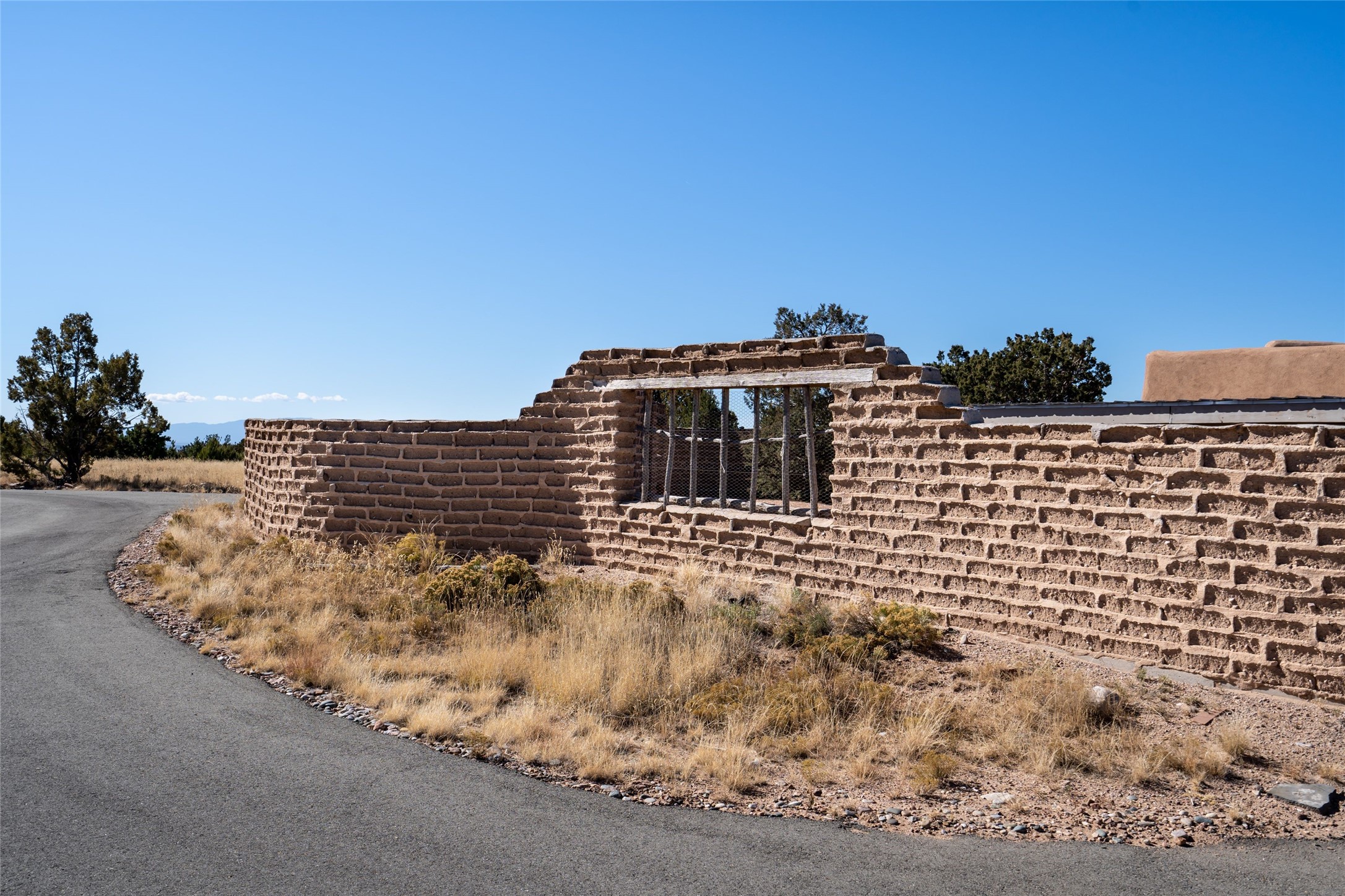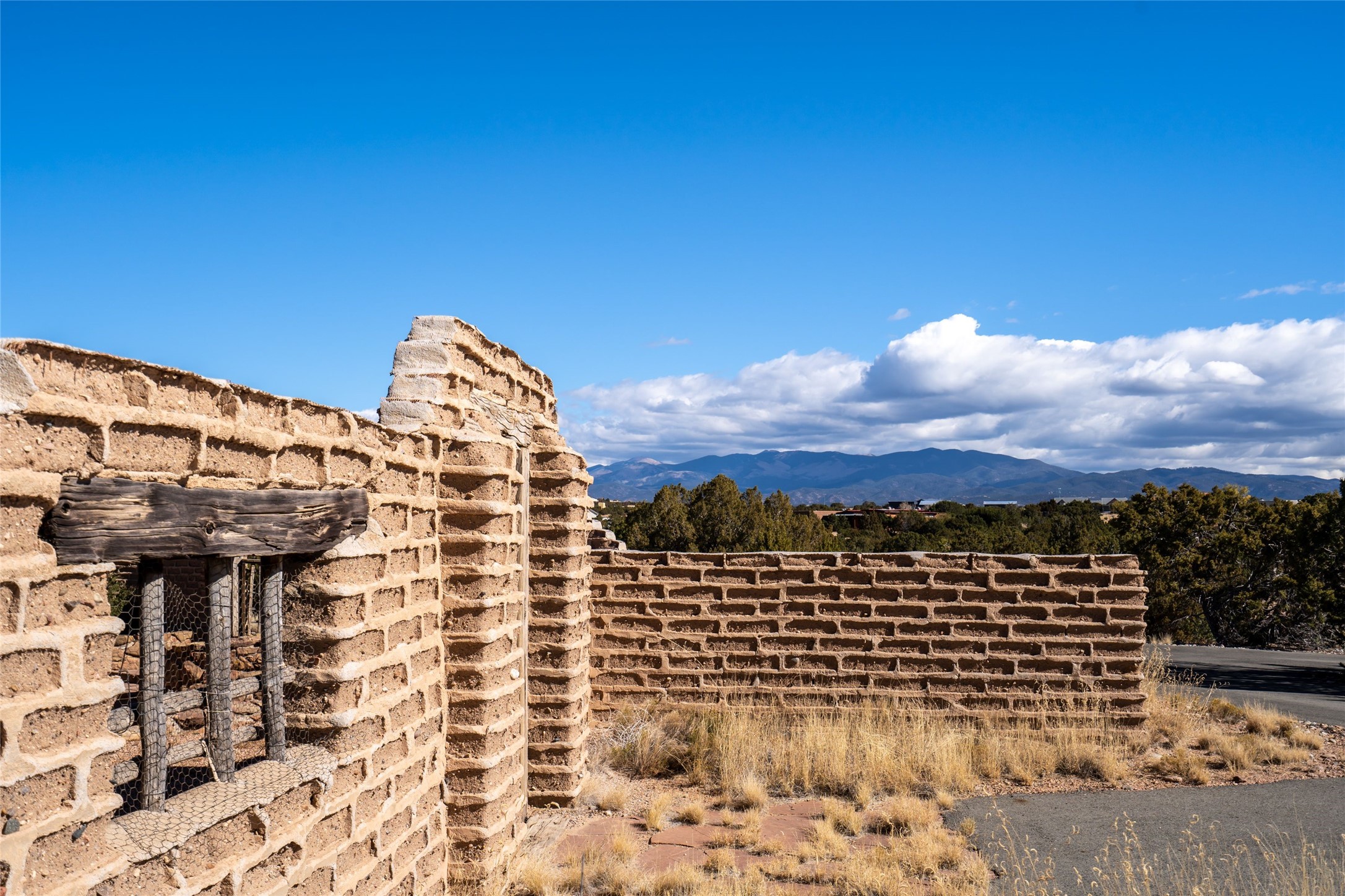 Presenting an extraordinary opportunity to own a 3-bedroom, 2-bath real adobe home on 3.04 acres. This property sits at the highest elevation in the Puesta Del Sol subdivision, offering breathtaking views of four mountain ranges, the Jemez, Ortiz, Sandia and Sangre de Christo Mountains and the twinkling lights of Los Alamos. A wonderful location for exploring the neighborhood and enjoying the spectacular views. The residence is securely surrounded by a butter brick wall, providing both privacy and a sense of enclosure. With a favorable north-south exposure, sunlight fills the interior throughout the day. The primary suite features a full ensuite bath, ensuring comfort and convenience. Recent upgrades include most plumbing updated, along with new stucco, Pella windows, and new doors. A brand-new washer/dryer and dishwasher enhances functionality. Additional features include a pellet stove in the dining room for warmth, and fireplaces in the primary bedroom and living/media room, creating inviting spaces for relaxation or work. Conveniently located with easy access to NM-599, this home is just a short drive from the Santa Fe Plaza and the Santa Fe Regional Airport.