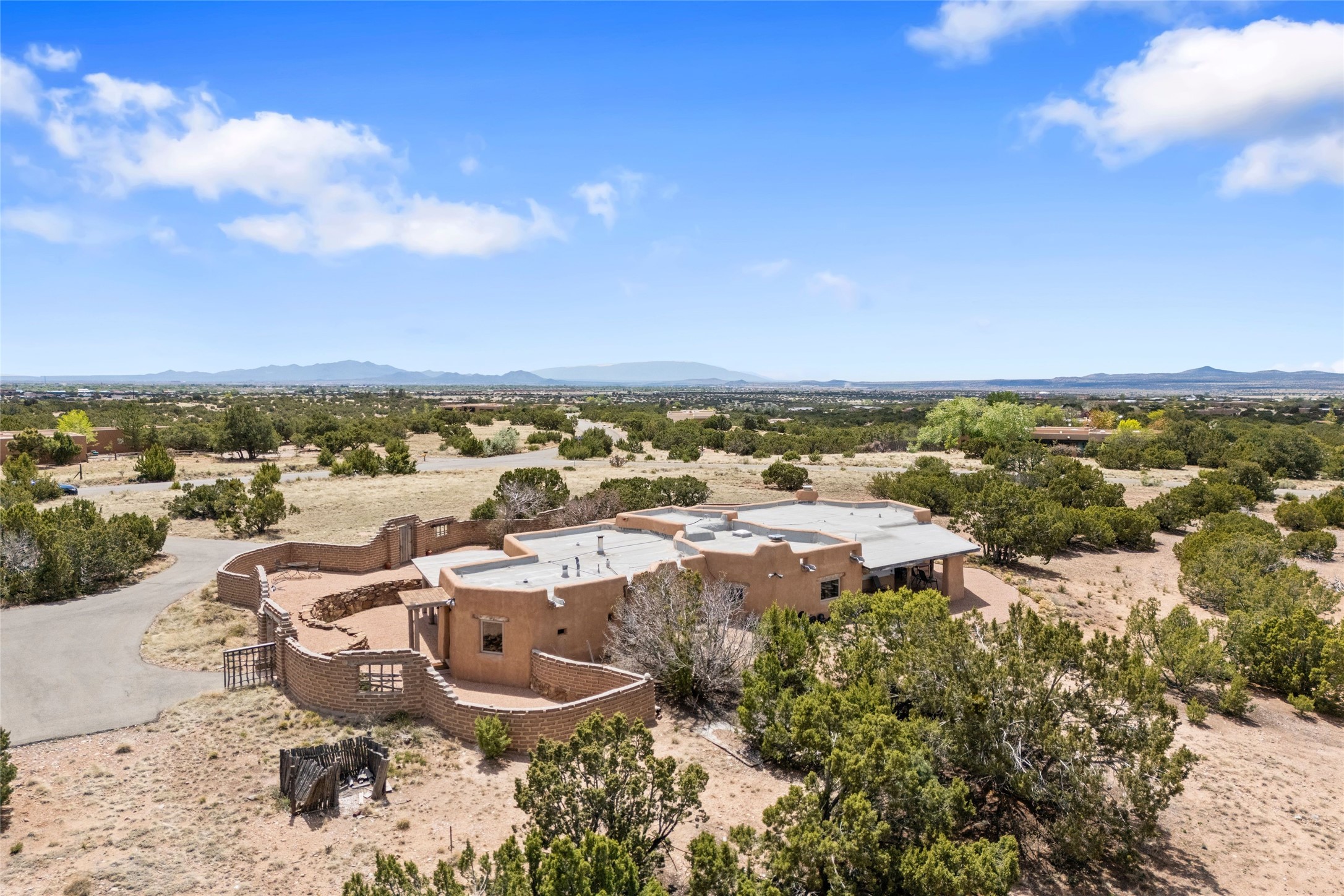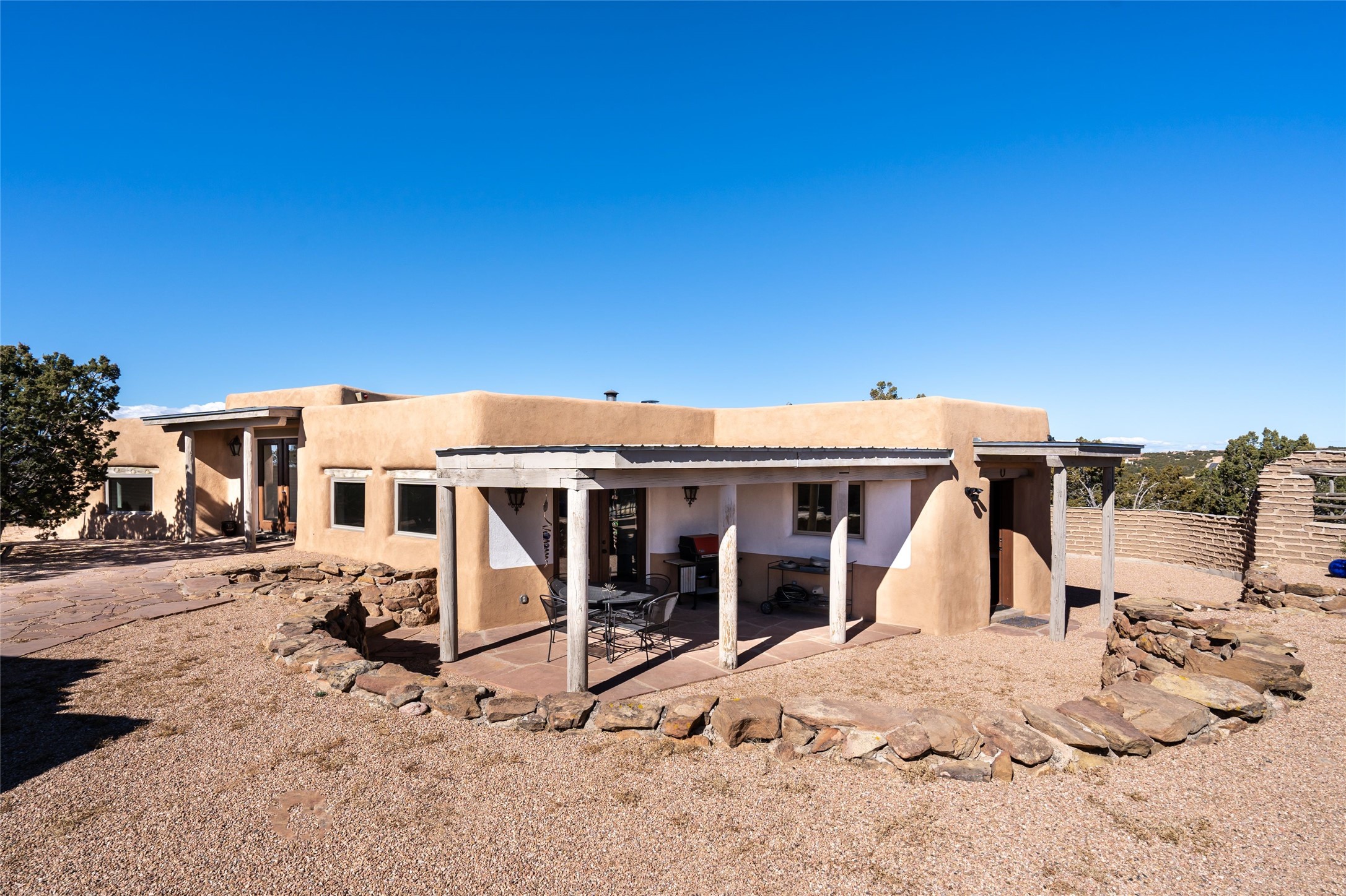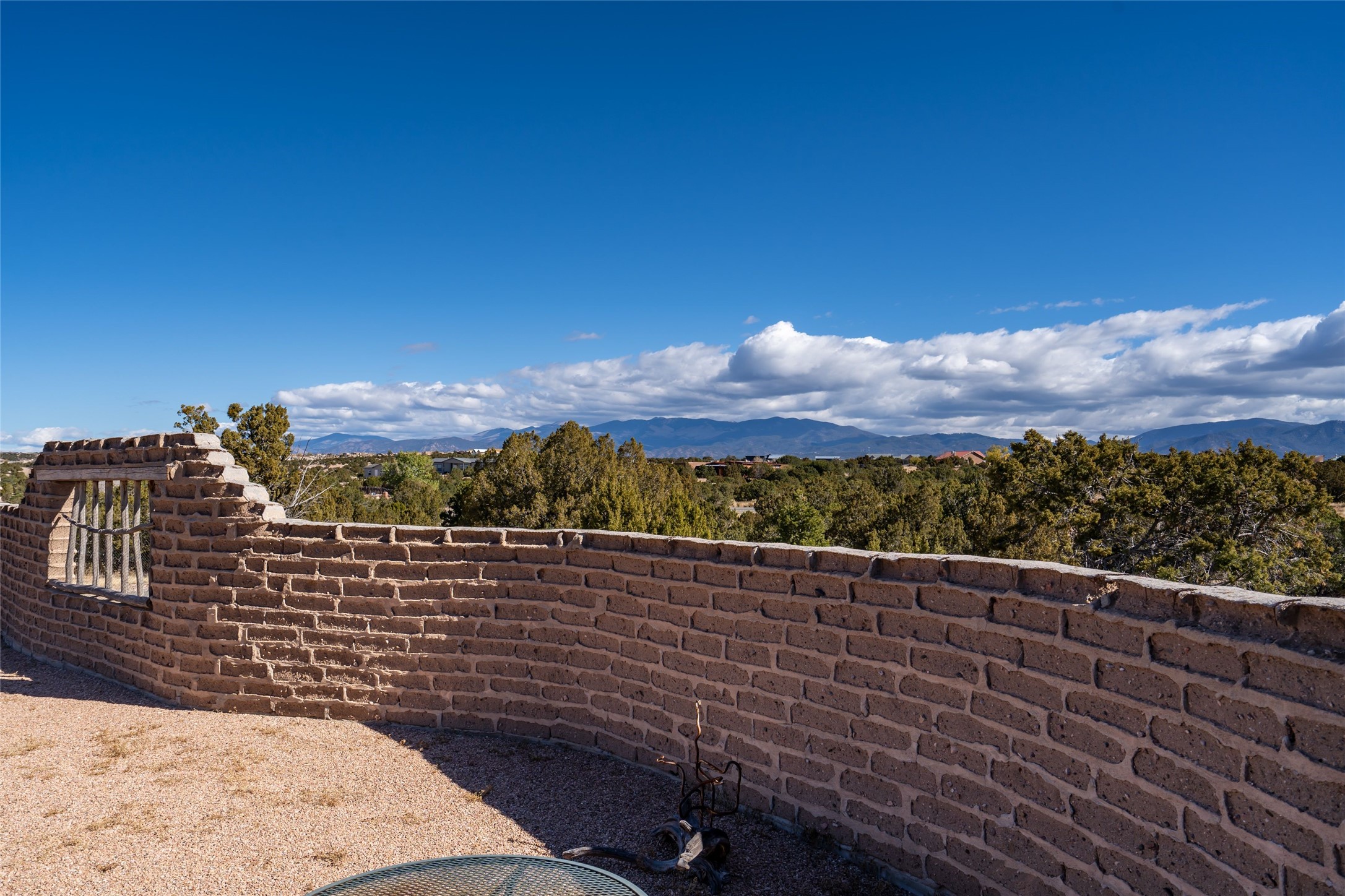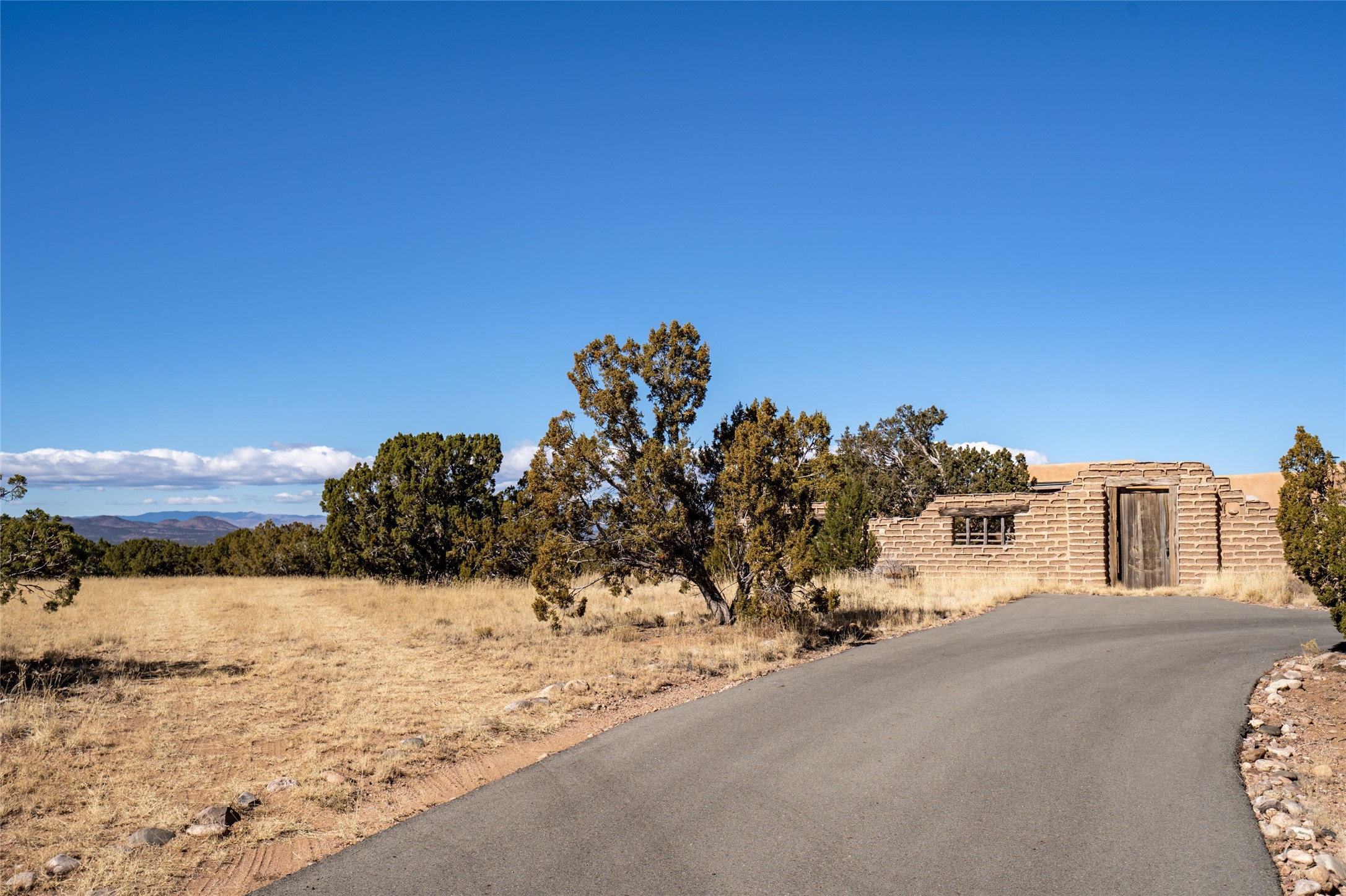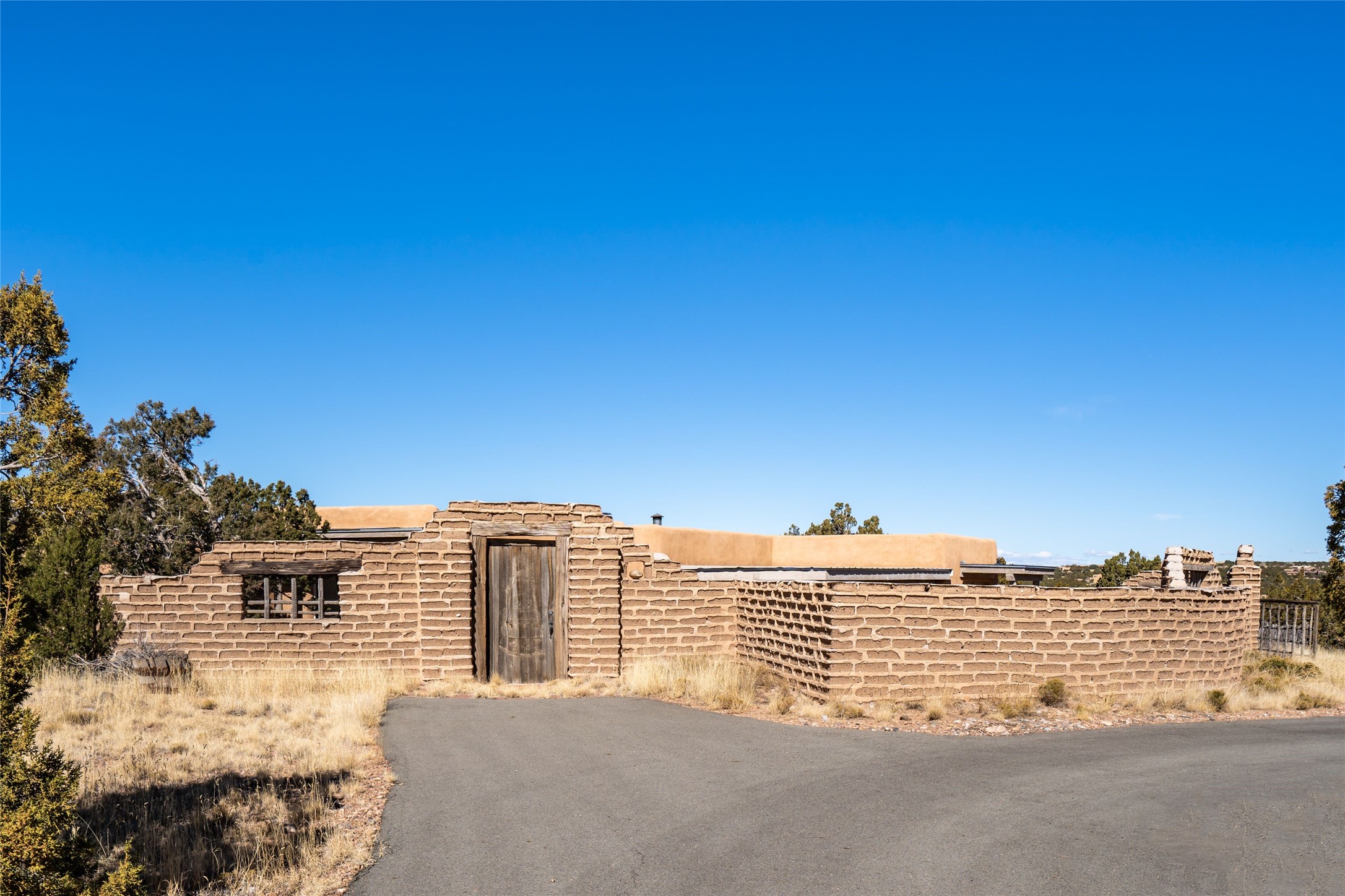 Presenting an extraordinary opportunity to own a 3-bedroom, 2-bath real adobe home on 3.04 acres. This property sits at the highest elevation in the Puesta Del Sol subdivision, offering breathtaking views of four mountain ranges, the Jemez, Ortiz, Sandia and Sangre de Christo Mountains and the twinkling lights of Los Alamos. A wonderful location for exploring the neighborhood and enjoying the spectacular views. The residence is securely surrounded by a butter brick wall, providing both privacy and a sense of enclosure. With a favorable north-south exposure, sunlight fills the interior throughout the day. The primary suite features a full ensuite bath, ensuring comfort and convenience. Recent upgrades include most plumbing updated, along with new stucco, Pella windows, and new doors. A brand-new washer/dryer and dishwasher enhances functionality. Additional features include a pellet stove in the dining room for warmth, and fireplaces in the primary bedroom and living/media room, creating inviting spaces for relaxation or work. Conveniently located with easy access to NM-599, this home is just a short drive from the Santa Fe Plaza and the Santa Fe Regional Airport.