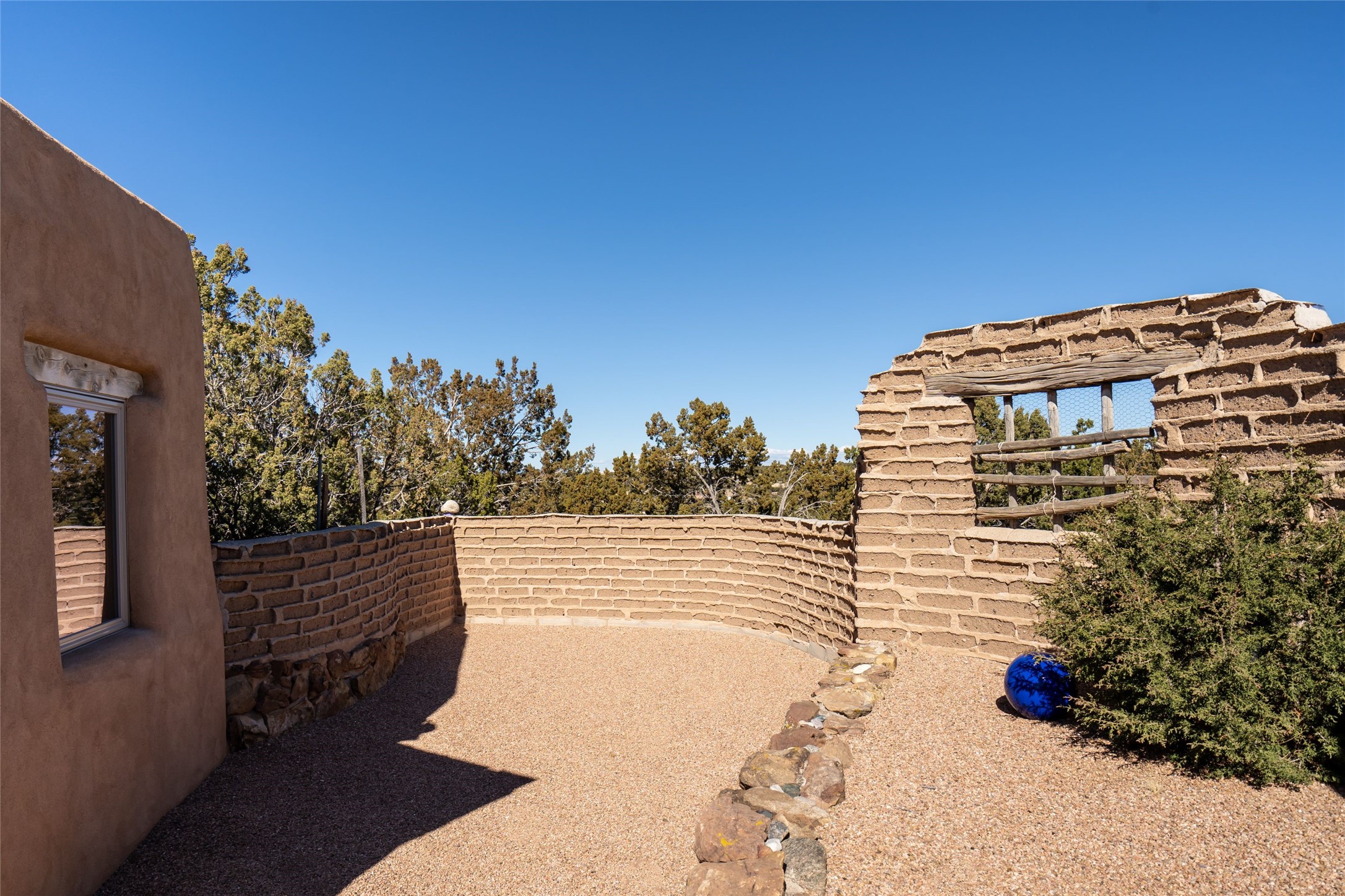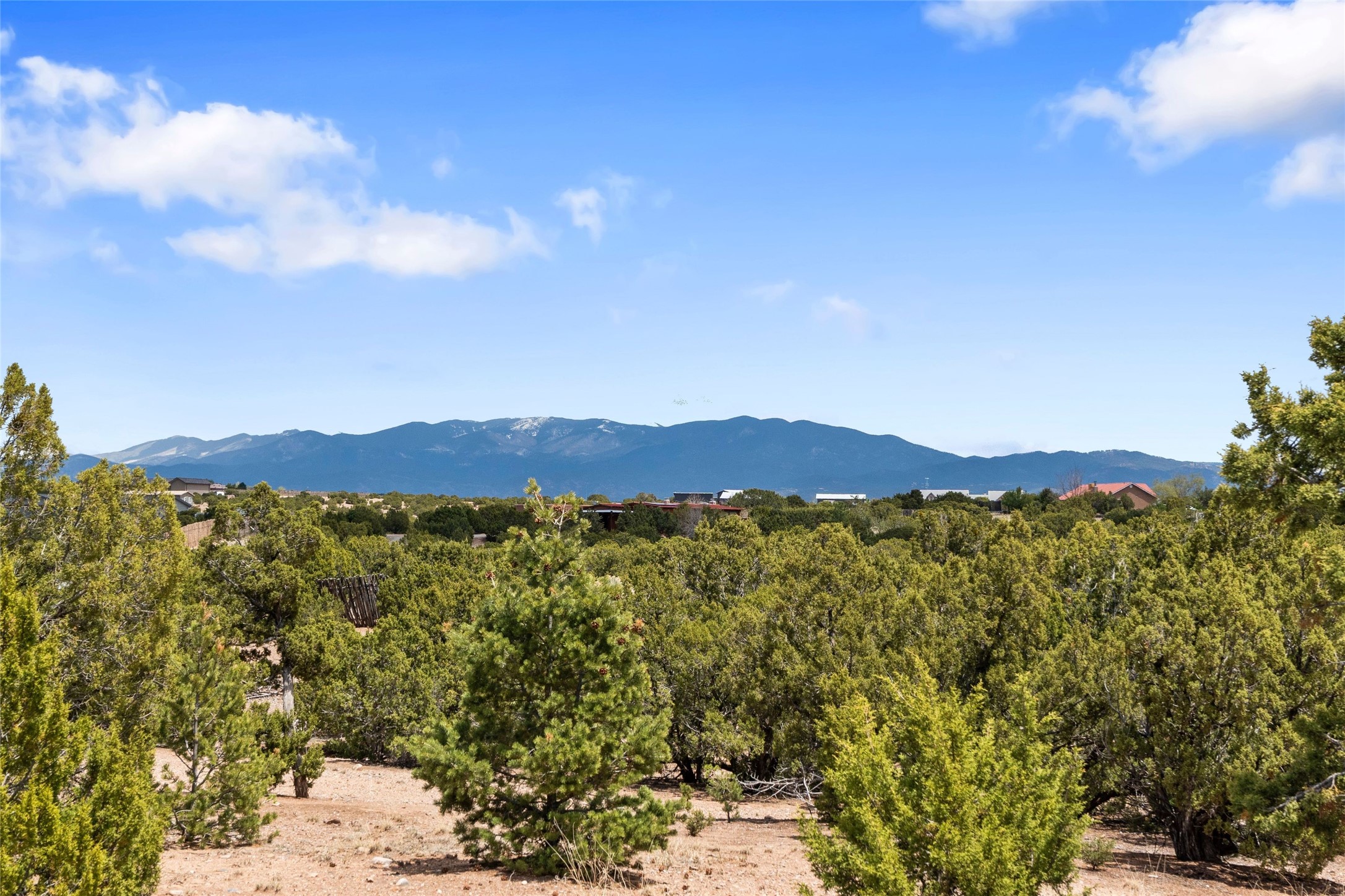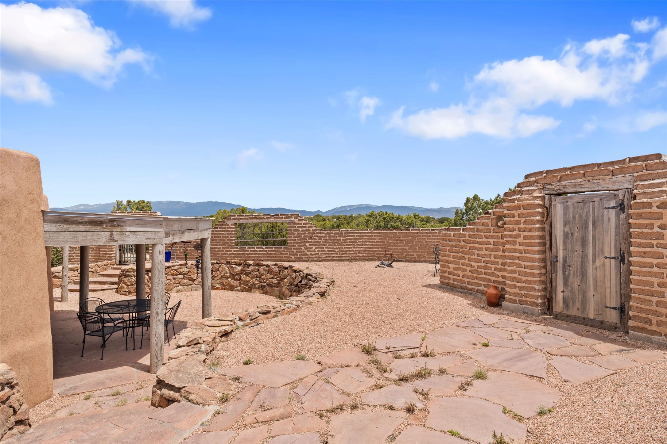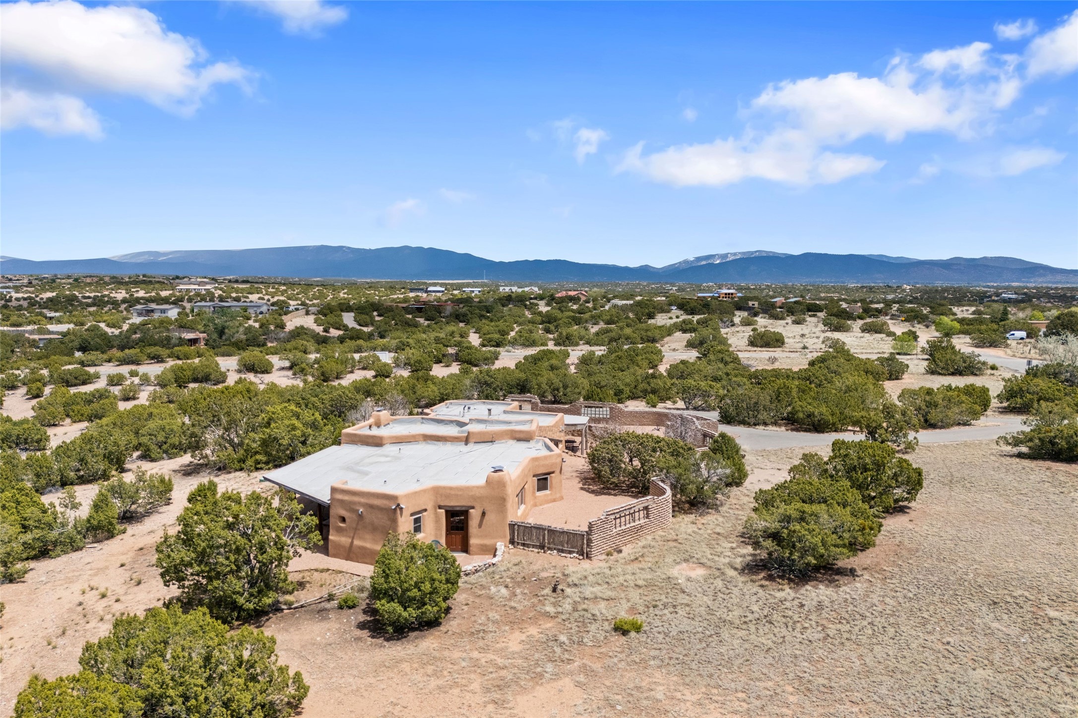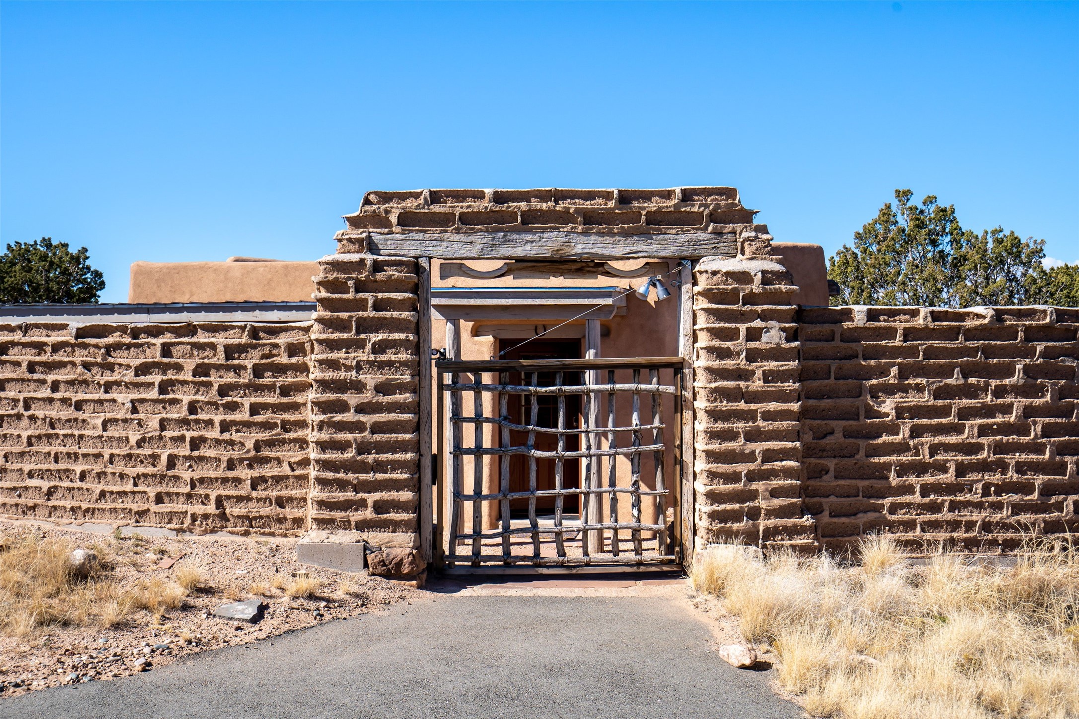 Presenting an extraordinary opportunity to own a 3-bedroom, 2-bath real adobe home on 3.04 acres. This property sits at the highest elevation in the Puesta Del Sol subdivision, offering breathtaking views of four mountain ranges, the Jemez, Ortiz, Sandia and Sangre de Christo Mountains and the twinkling lights of Los Alamos. A wonderful location for exploring the neighborhood and enjoying the spectacular views. The residence is securely surrounded by a butter brick wall, providing both privacy and a sense of enclosure. With a favorable north-south exposure, sunlight fills the interior throughout the day. The primary suite features a full ensuite bath, ensuring comfort and convenience. Recent upgrades include most plumbing updated, along with new stucco, Pella windows, and new doors. A brand-new washer/dryer and dishwasher enhances functionality. Additional features include a pellet stove in the dining room for warmth, and fireplaces in the primary bedroom and living/media room, creating inviting spaces for relaxation or work. Conveniently located with easy access to NM-599, this home is just a short drive from the Santa Fe Plaza and the Santa Fe Regional Airport.