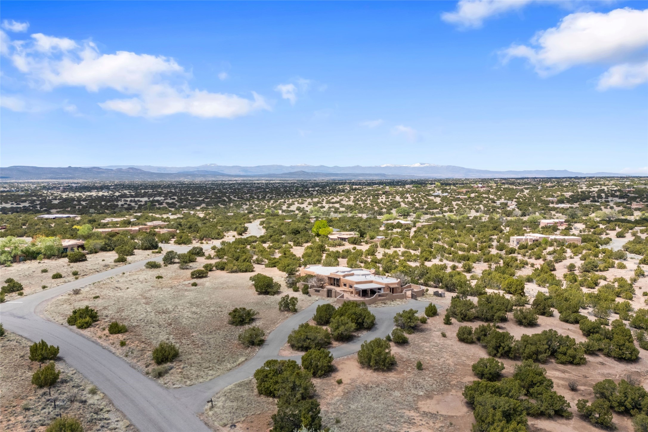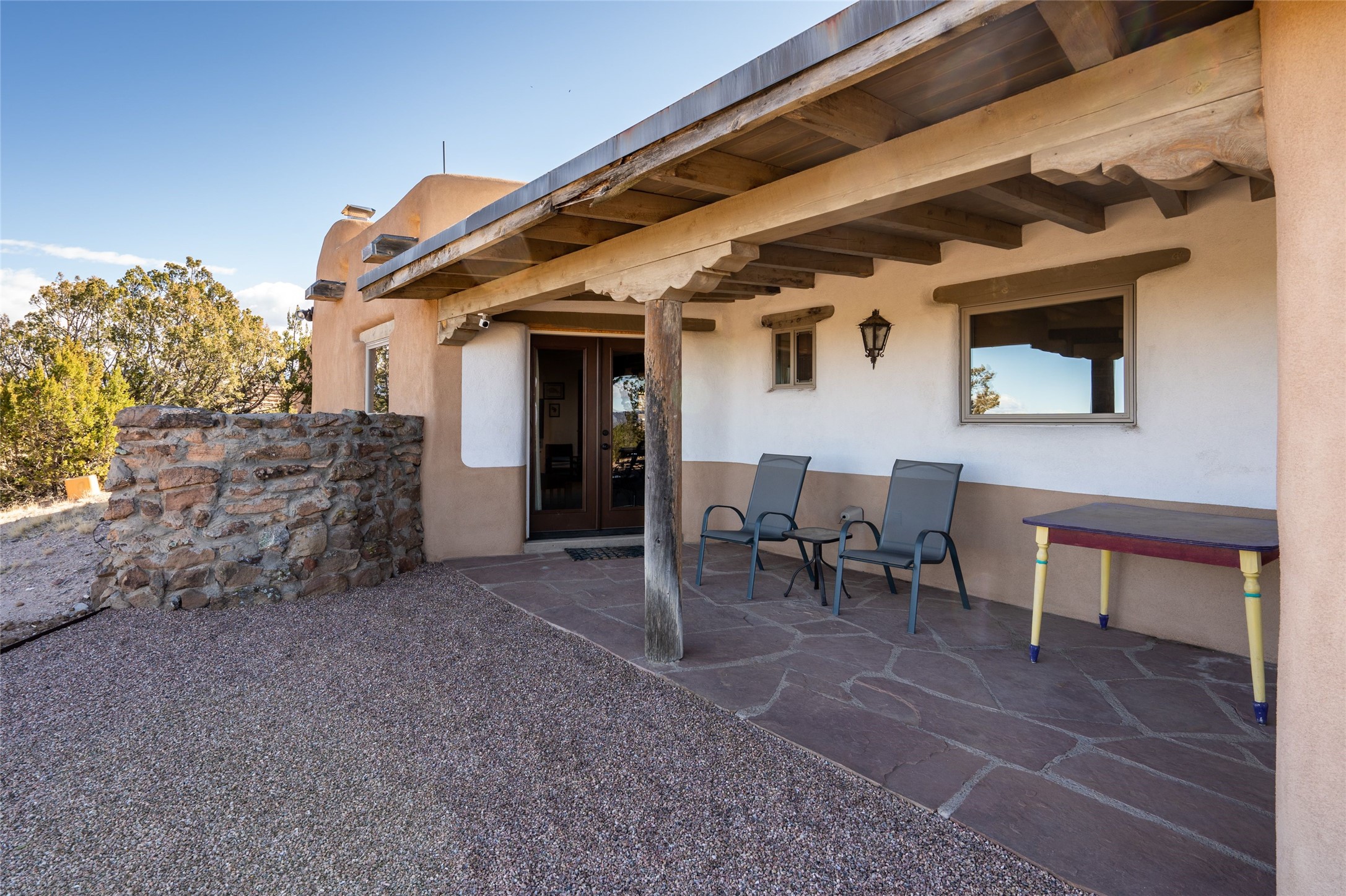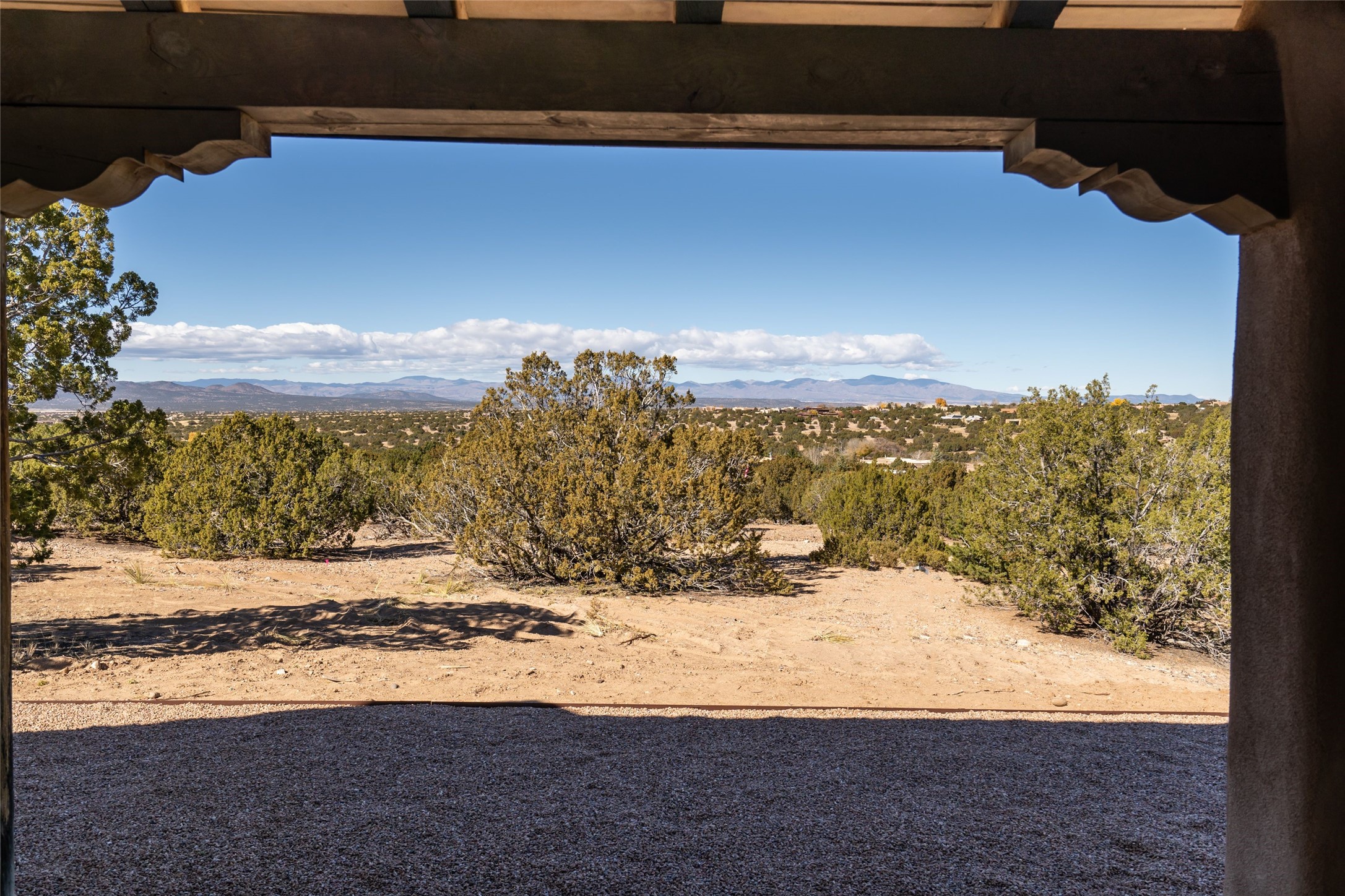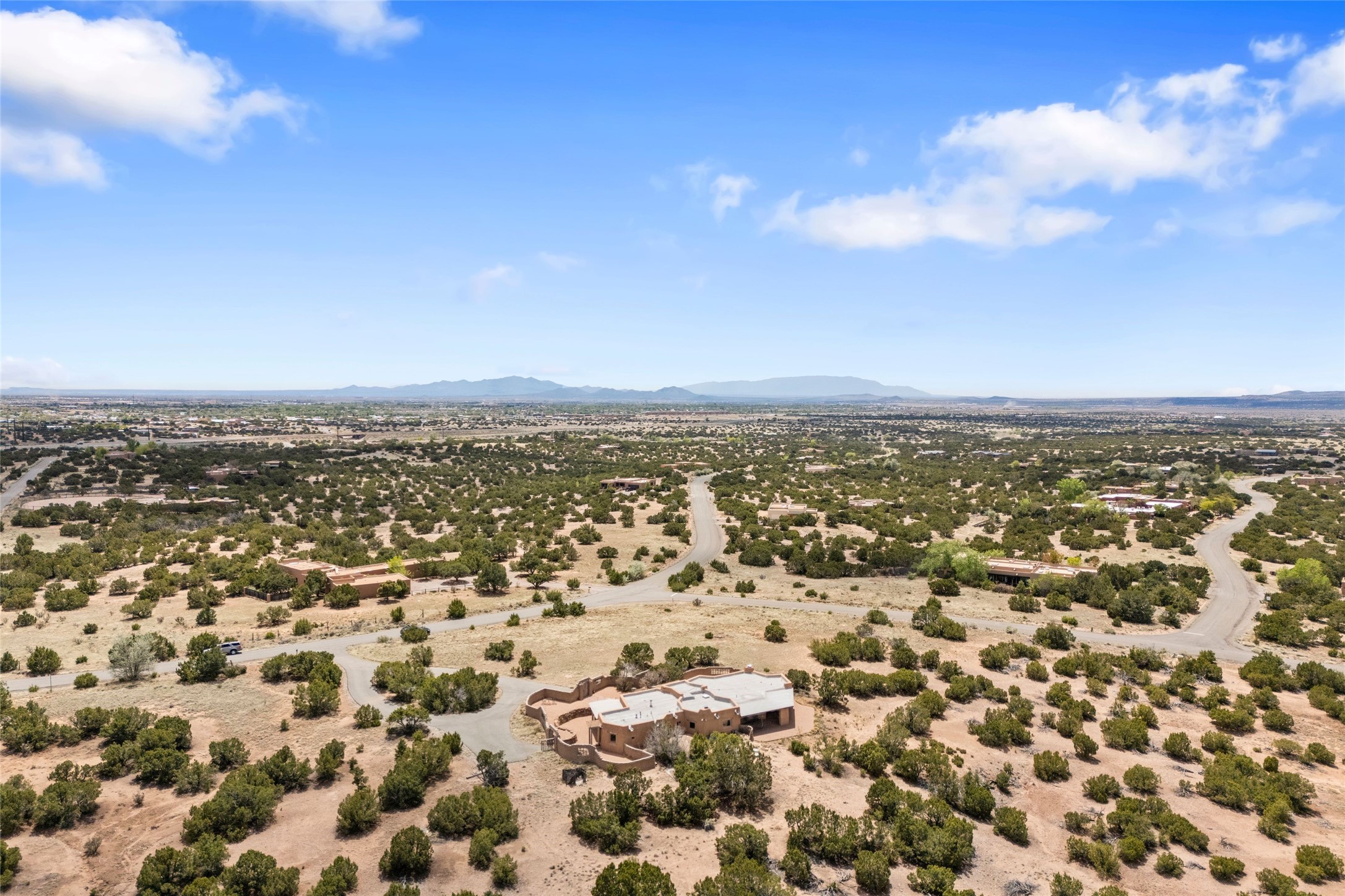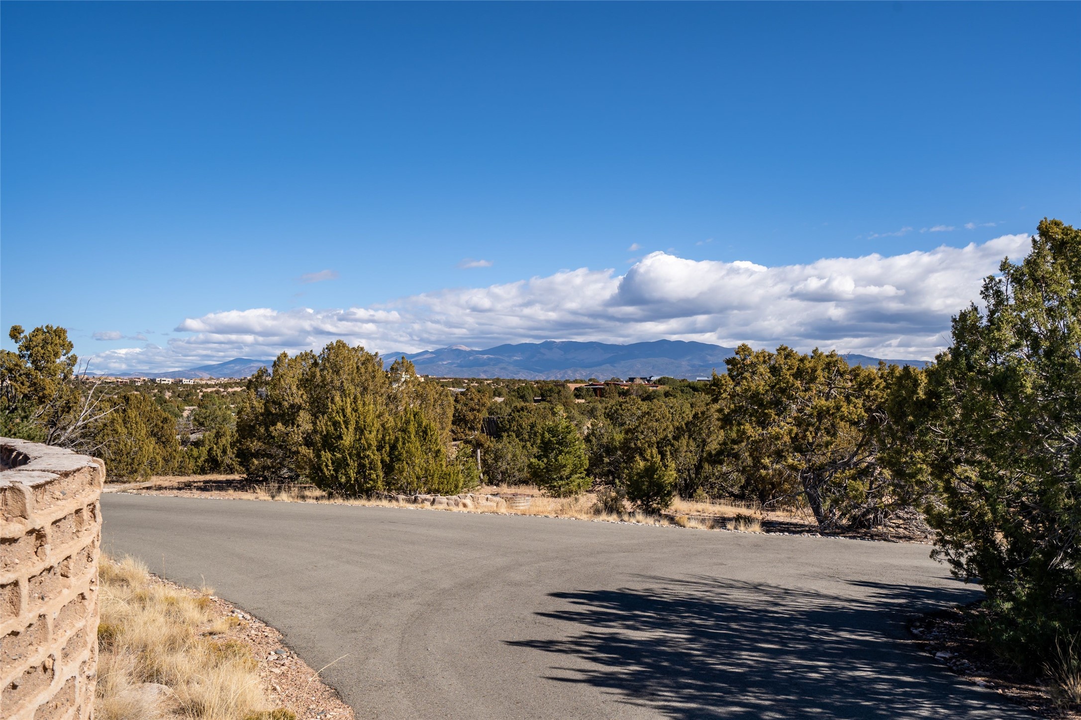 Presenting an extraordinary opportunity to own a 3-bedroom, 2-bath real adobe home on 3.04 acres. This property sits at the highest elevation in the Puesta Del Sol subdivision, offering breathtaking views of four mountain ranges, the Jemez, Ortiz, Sandia and Sangre de Christo Mountains and the twinkling lights of Los Alamos. A wonderful location for exploring the neighborhood and enjoying the spectacular views. The residence is securely surrounded by a butter brick wall, providing both privacy and a sense of enclosure. With a favorable north-south exposure, sunlight fills the interior throughout the day. The primary suite features a full ensuite bath, ensuring comfort and convenience. Recent upgrades include most plumbing updated, along with new stucco, Pella windows, and new doors. A brand-new washer/dryer and dishwasher enhances functionality. Additional features include a pellet stove in the dining room for warmth, and fireplaces in the primary bedroom and living/media room, creating inviting spaces for relaxation or work. Conveniently located with easy access to NM-599, this home is just a short drive from the Santa Fe Plaza and the Santa Fe Regional Airport.