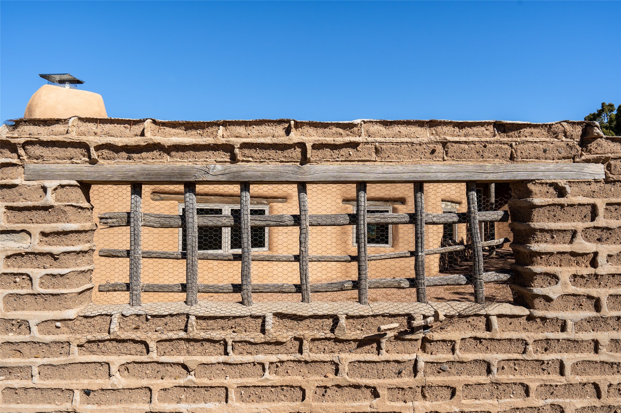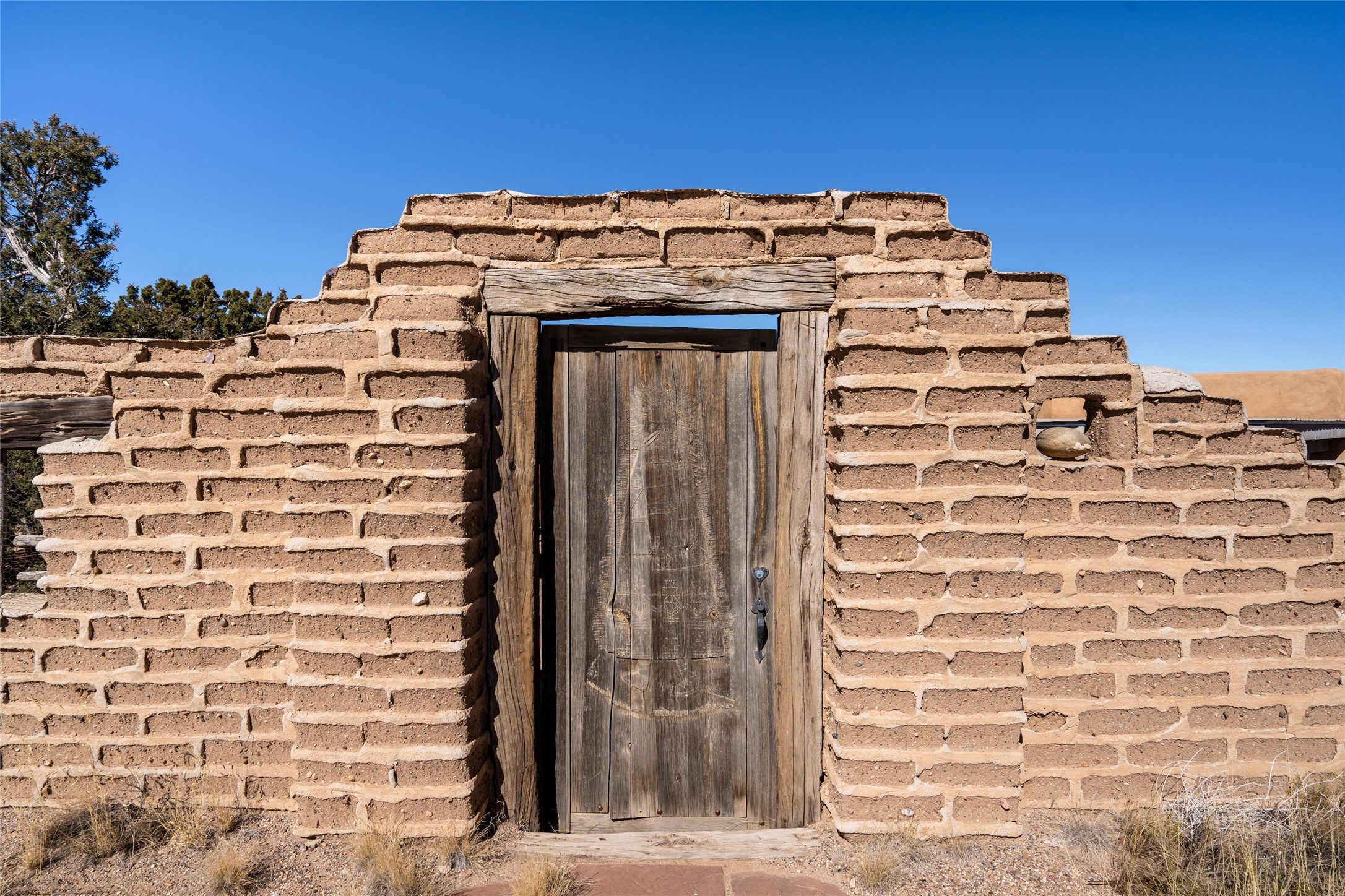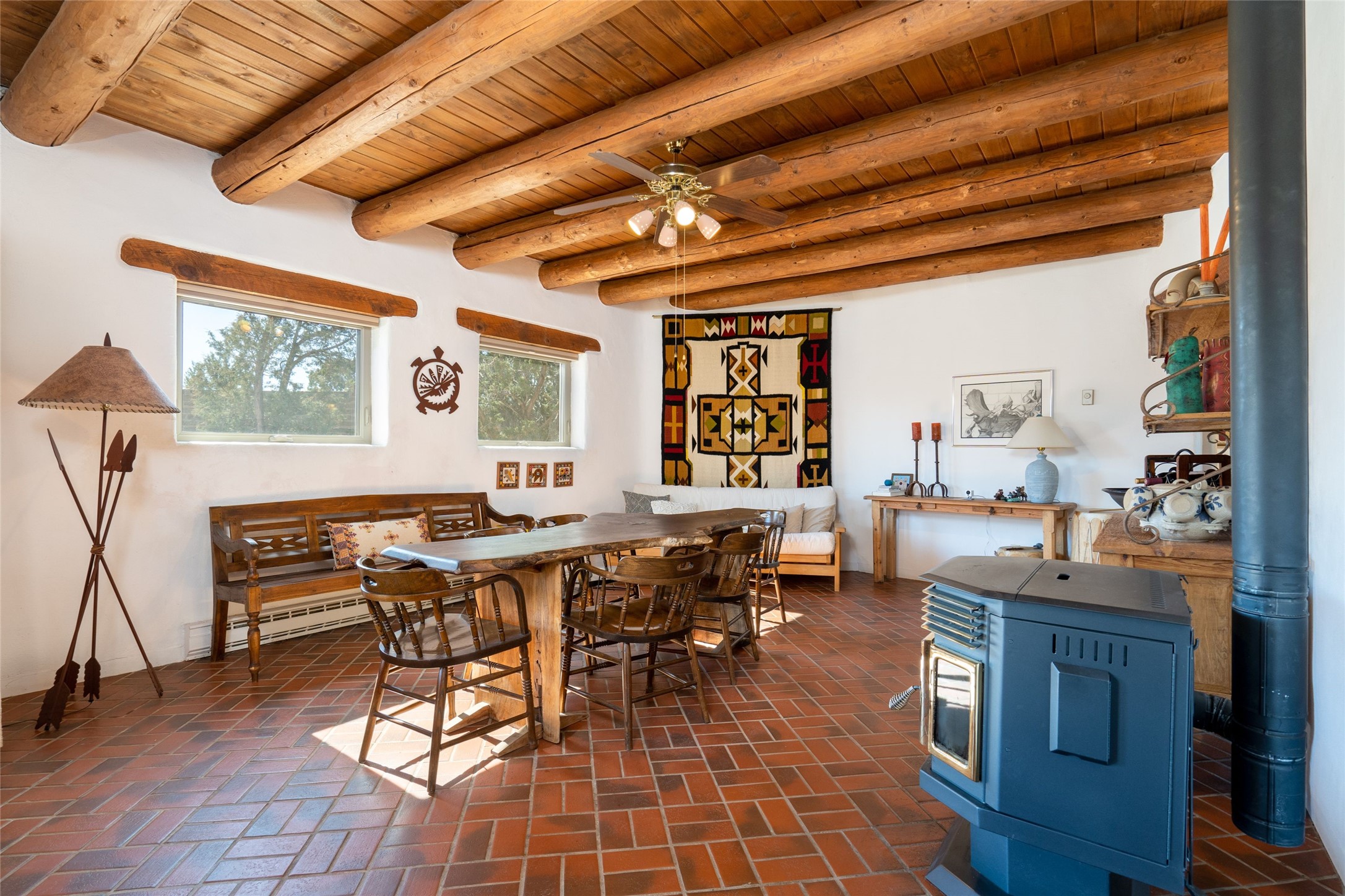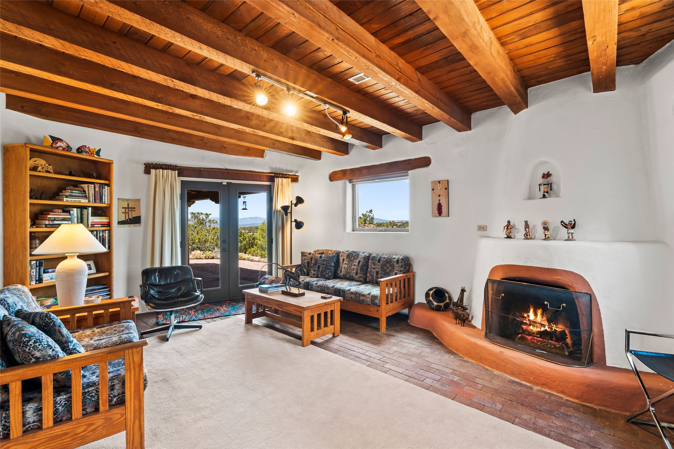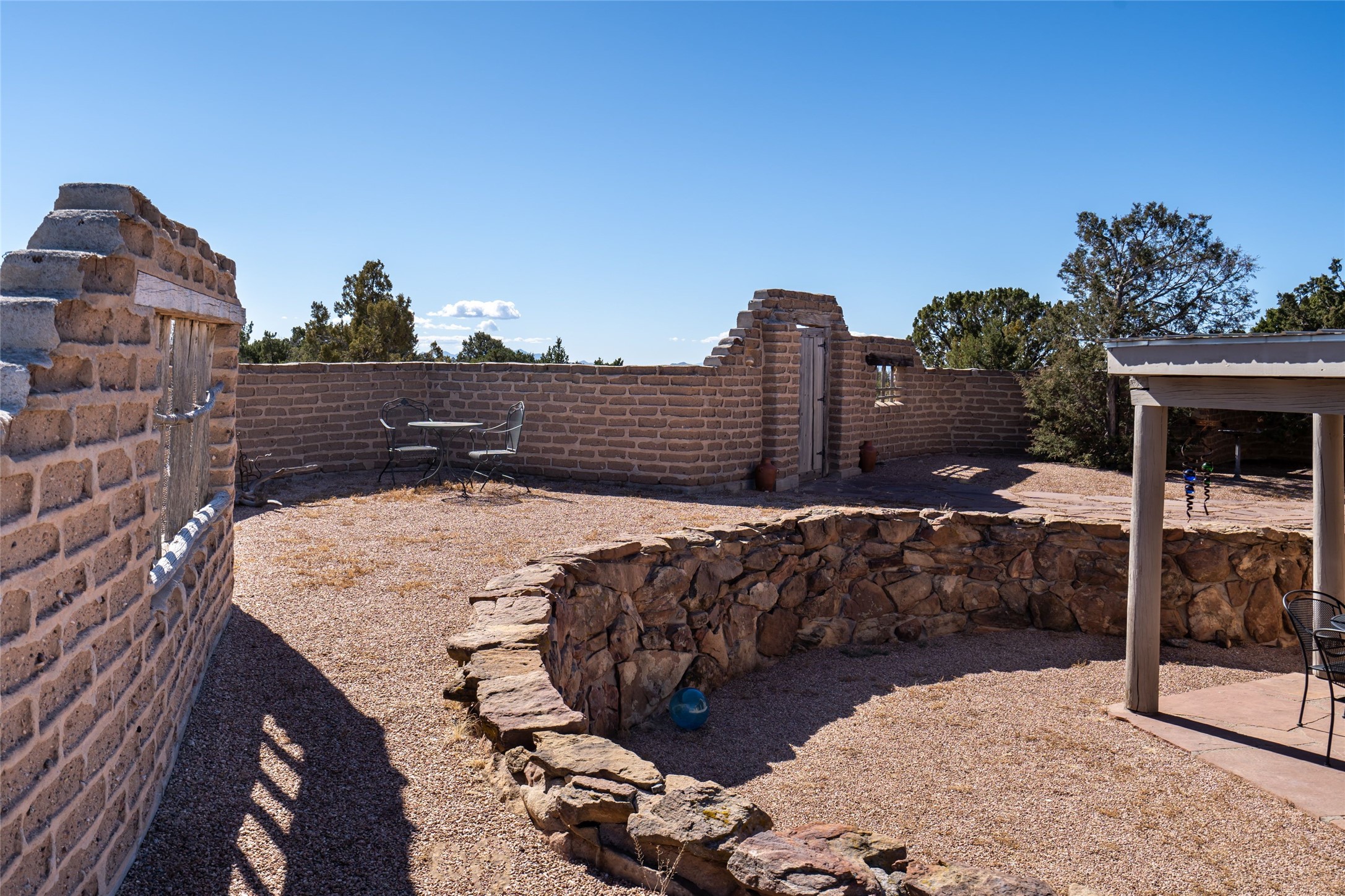 Presenting an extraordinary opportunity to own a 3-bedroom, 2-bath real adobe home on 3.04 acres. This property sits at the highest elevation in the Puesta Del Sol subdivision, offering breathtaking views of four mountain ranges, the Jemez, Ortiz, Sandia and Sangre de Christo Mountains and the twinkling lights of Los Alamos. A wonderful location for exploring the neighborhood and enjoying the spectacular views. The residence is securely surrounded by a butter brick wall, providing both privacy and a sense of enclosure. With a favorable north-south exposure, sunlight fills the interior throughout the day. The primary suite features a full ensuite bath, ensuring comfort and convenience. Recent upgrades include most plumbing updated, along with new stucco, Pella windows, and new doors. A brand-new washer/dryer and dishwasher enhances functionality. Additional features include a pellet stove in the dining room for warmth, and fireplaces in the primary bedroom and living/media room, creating inviting spaces for relaxation or work. Conveniently located with easy access to NM-599, this home is just a short drive from the Santa Fe Plaza and the Santa Fe Regional Airport.