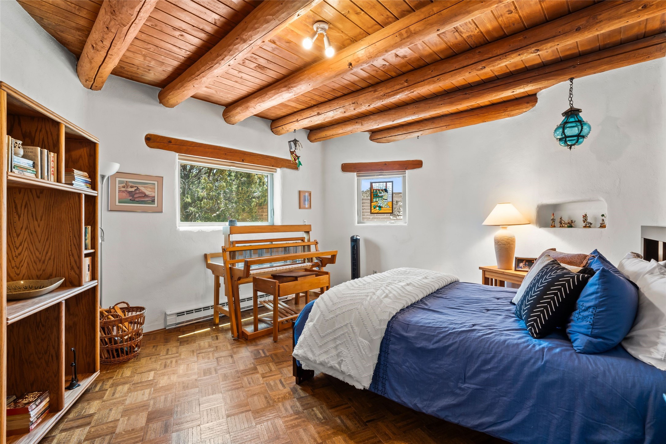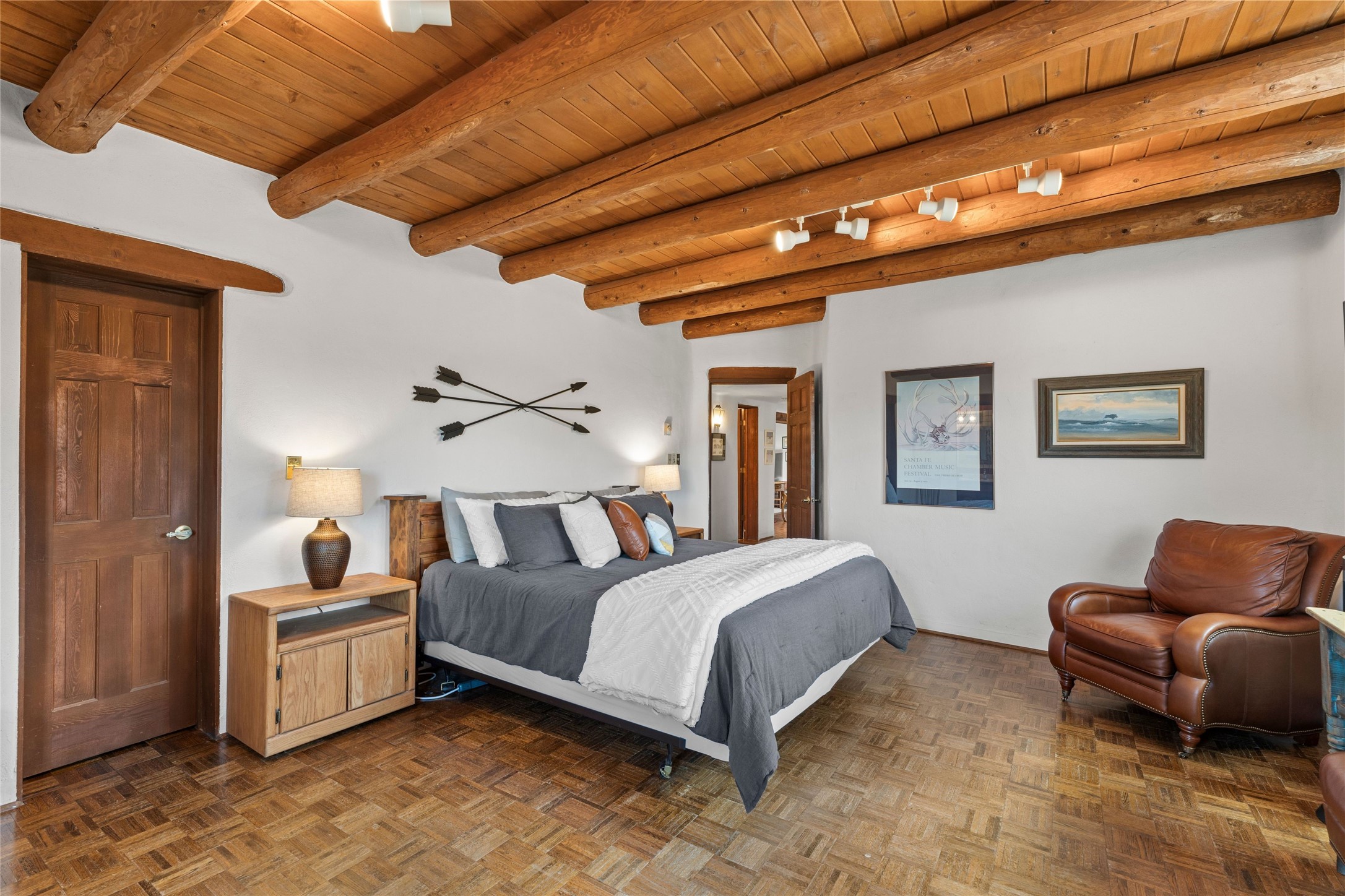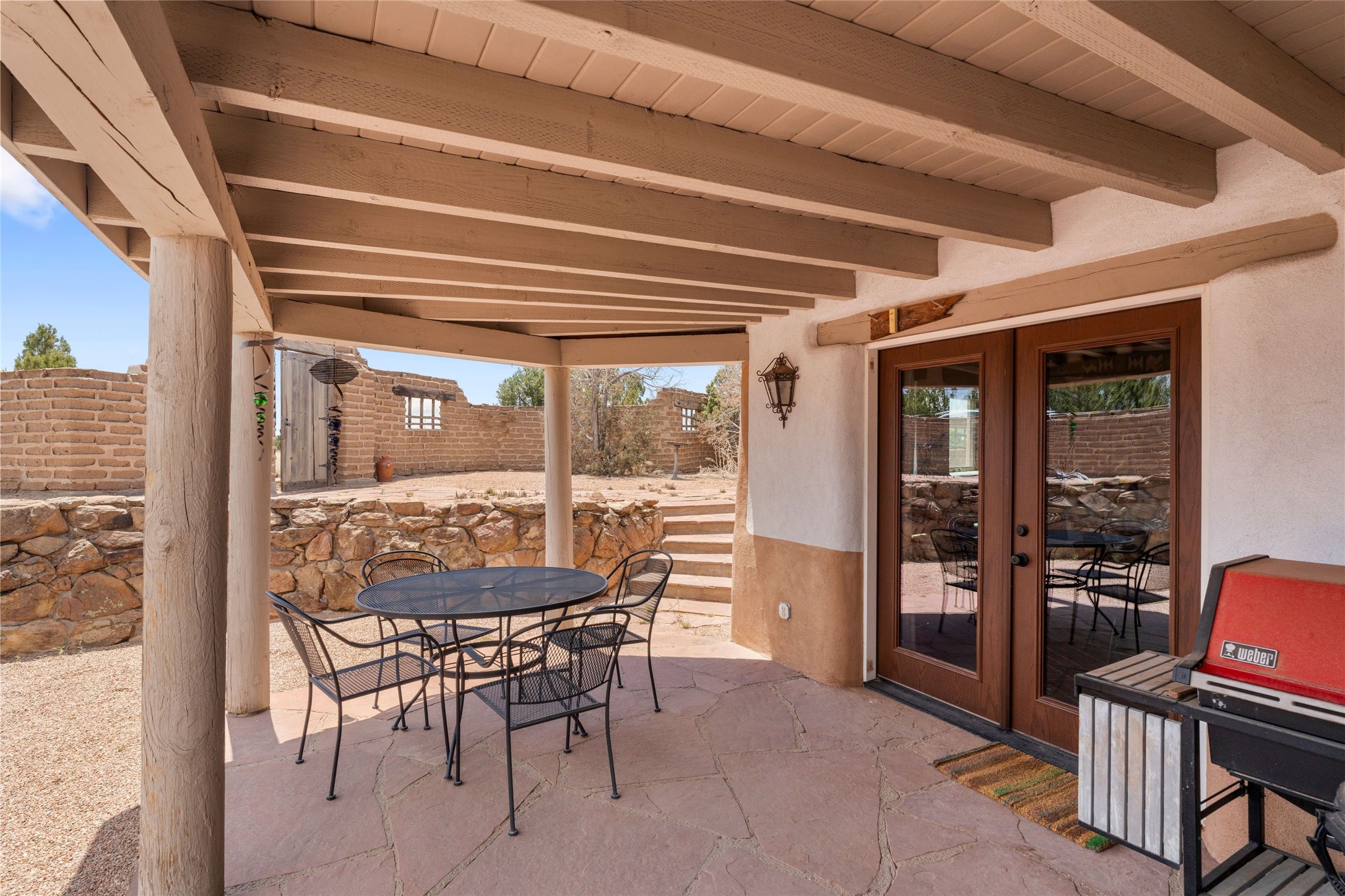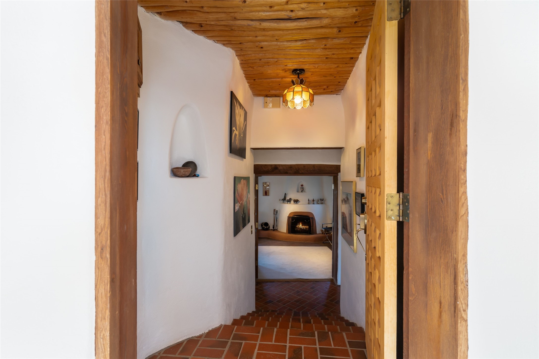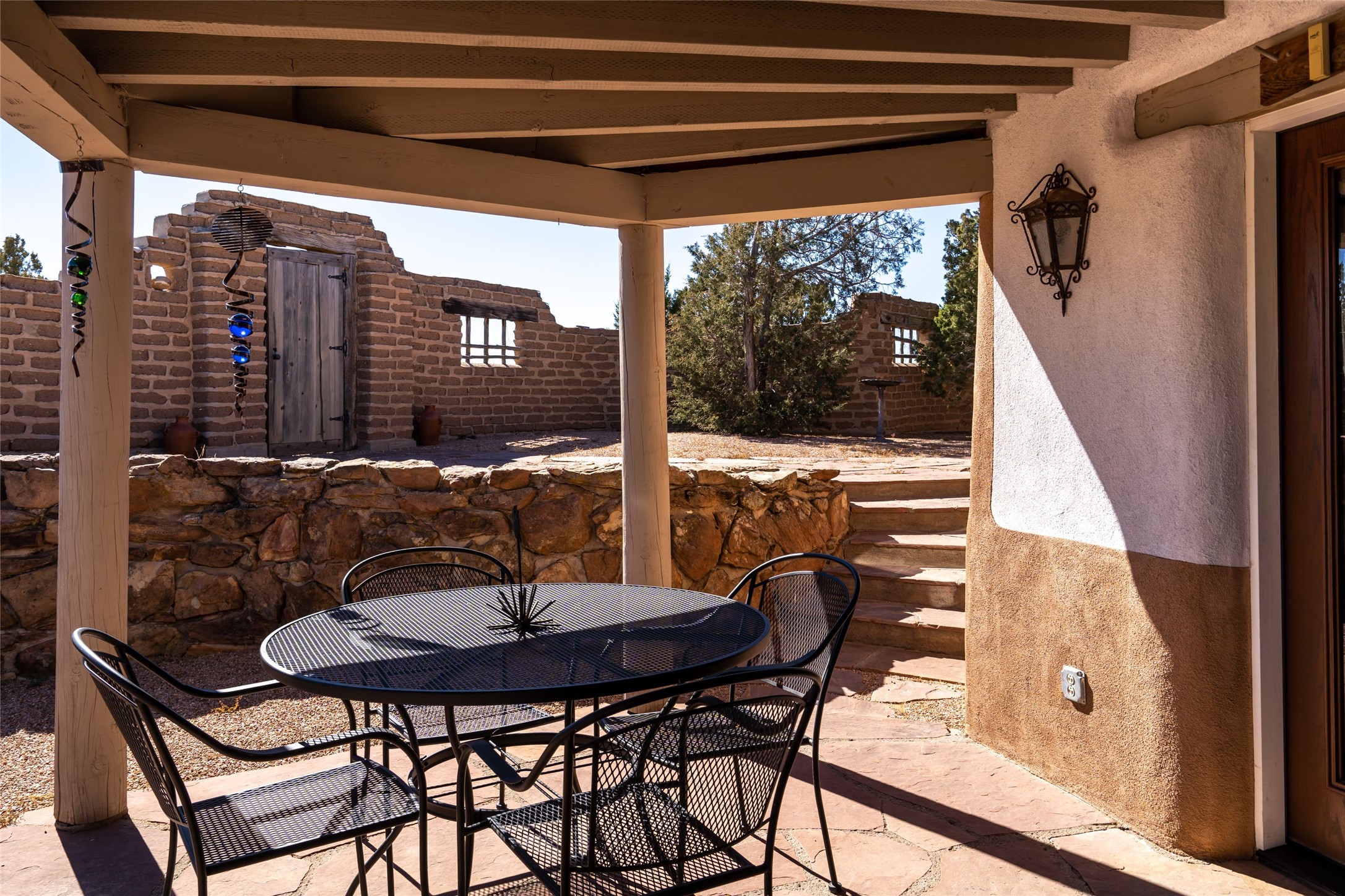 Presenting an extraordinary opportunity to own a 3-bedroom, 2-bath real adobe home on 3.04 acres. This property sits at the highest elevation in the Puesta Del Sol subdivision, offering breathtaking views of four mountain ranges, the Jemez, Ortiz, Sandia and Sangre de Christo Mountains and the twinkling lights of Los Alamos. A wonderful location for exploring the neighborhood and enjoying the spectacular views. The residence is securely surrounded by a butter brick wall, providing both privacy and a sense of enclosure. With a favorable north-south exposure, sunlight fills the interior throughout the day. The primary suite features a full ensuite bath, ensuring comfort and convenience. Recent upgrades include most plumbing updated, along with new stucco, Pella windows, and new doors. A brand-new washer/dryer and dishwasher enhances functionality. Additional features include a pellet stove in the dining room for warmth, and fireplaces in the primary bedroom and living/media room, creating inviting spaces for relaxation or work. Conveniently located with easy access to NM-599, this home is just a short drive from the Santa Fe Plaza and the Santa Fe Regional Airport.