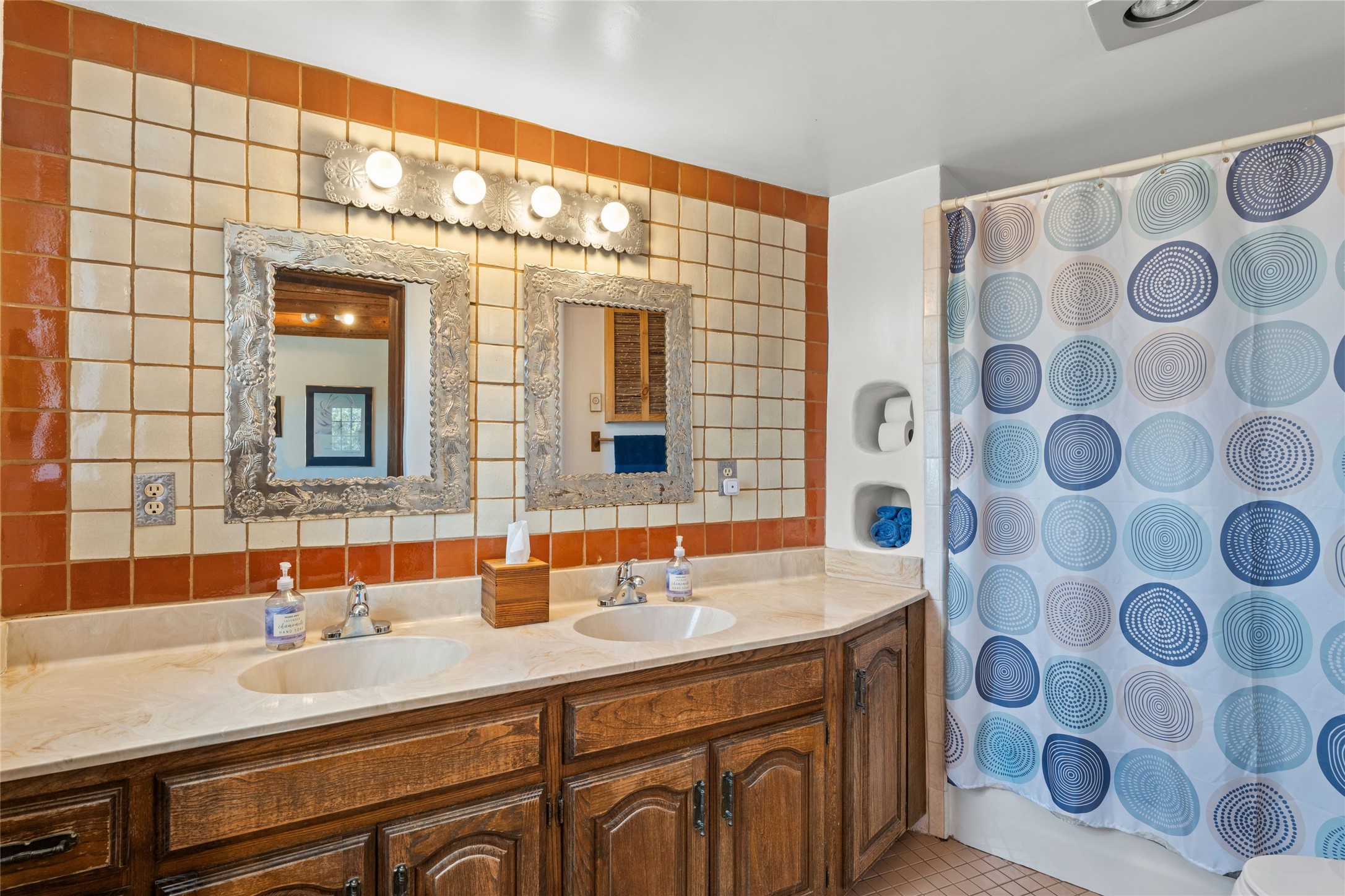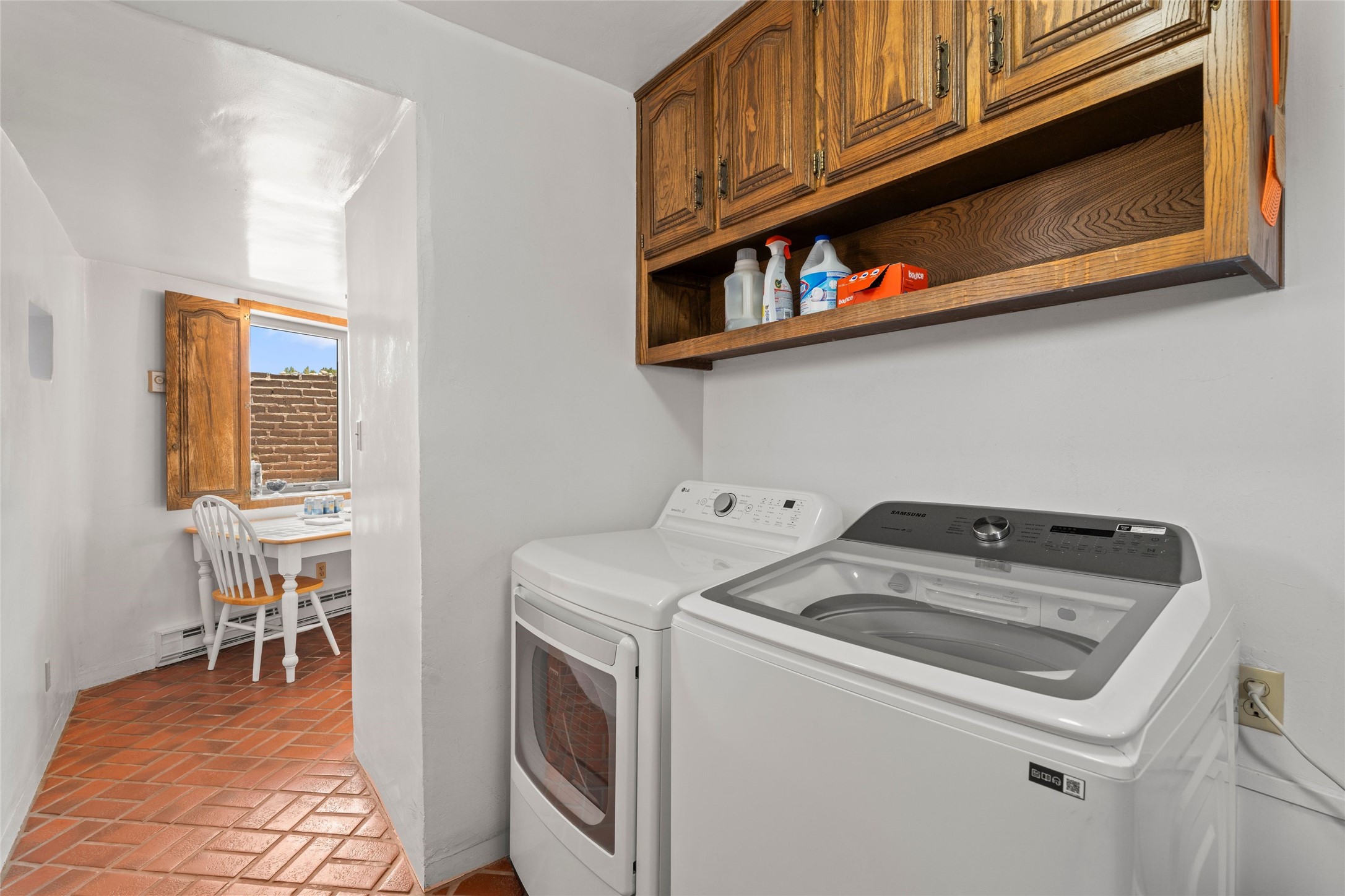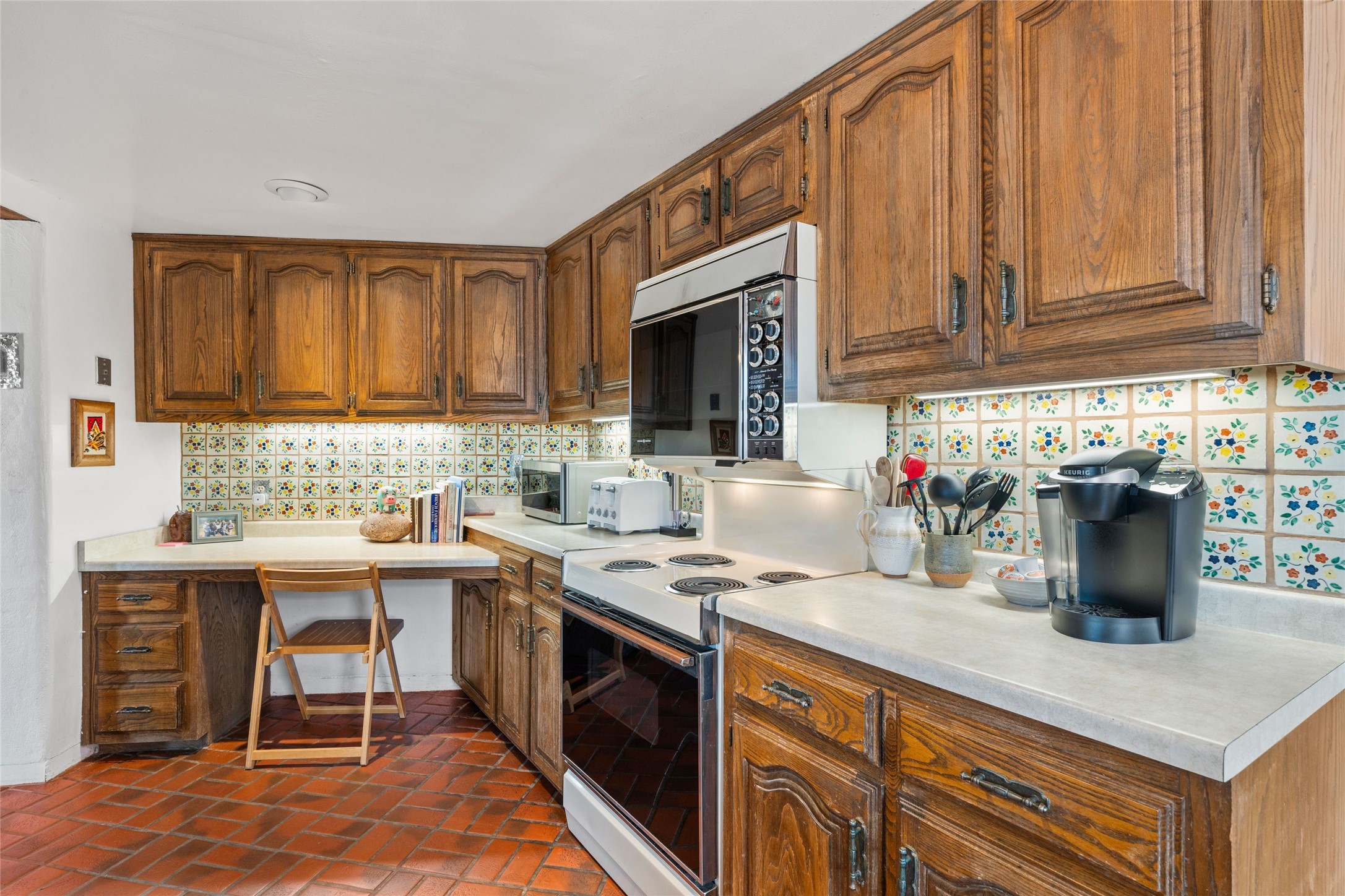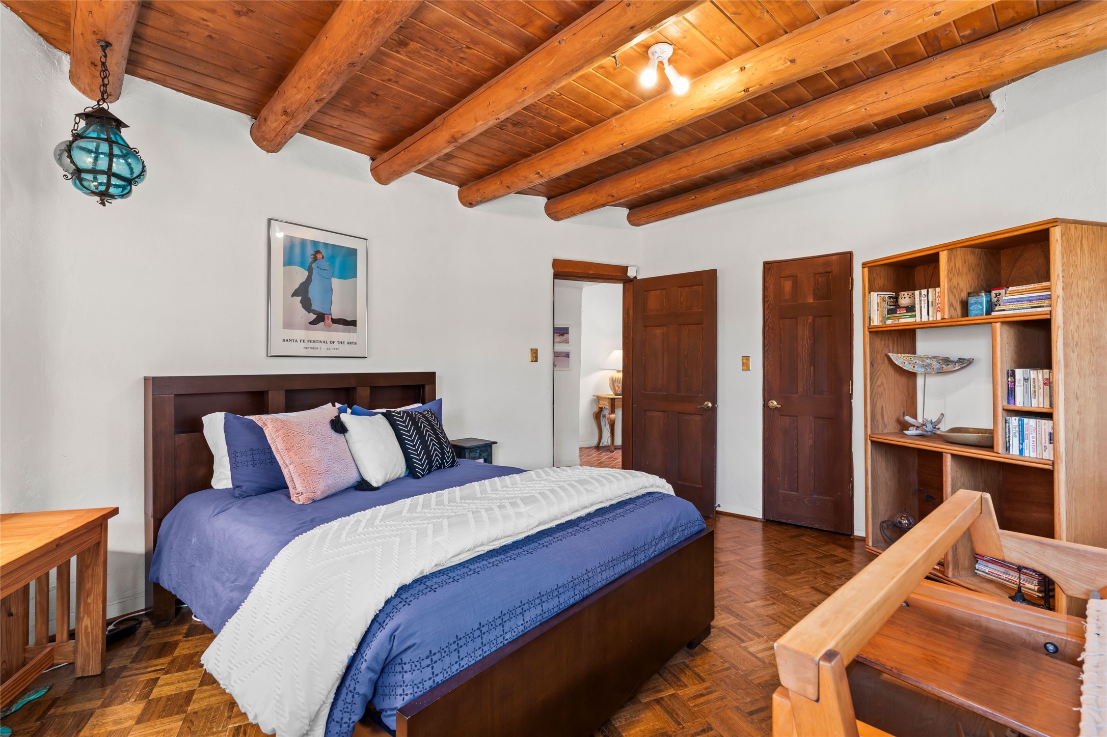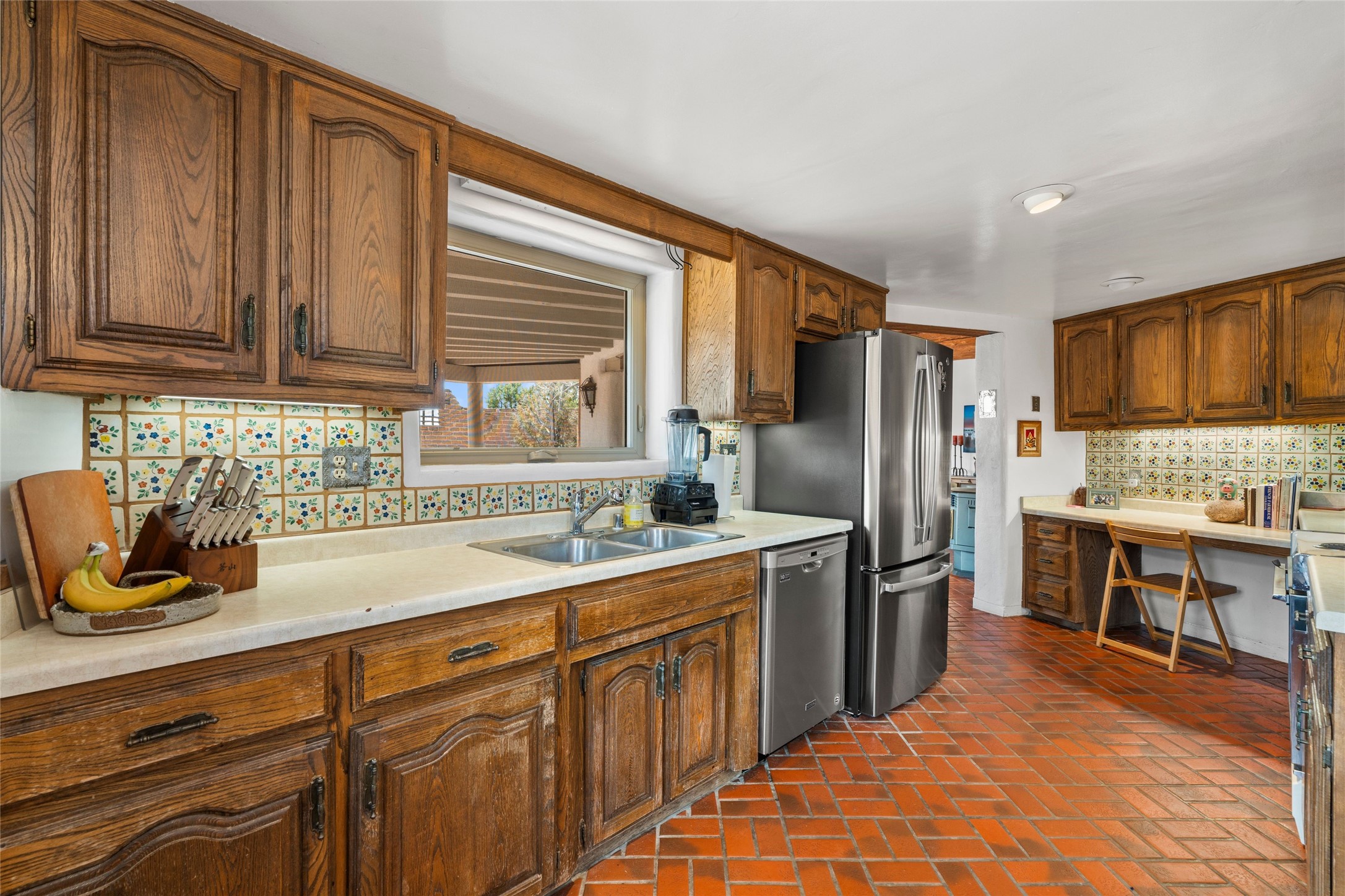 Presenting an extraordinary opportunity to own a 3-bedroom, 2-bath real adobe home on 3.04 acres. This property sits at the highest elevation in the Puesta Del Sol subdivision, offering breathtaking views of four mountain ranges, the Jemez, Ortiz, Sandia and Sangre de Christo Mountains and the twinkling lights of Los Alamos. A wonderful location for exploring the neighborhood and enjoying the spectacular views. The residence is securely surrounded by a butter brick wall, providing both privacy and a sense of enclosure. With a favorable north-south exposure, sunlight fills the interior throughout the day. The primary suite features a full ensuite bath, ensuring comfort and convenience. Recent upgrades include most plumbing updated, along with new stucco, Pella windows, and new doors. A brand-new washer/dryer and dishwasher enhances functionality. Additional features include a pellet stove in the dining room for warmth, and fireplaces in the primary bedroom and living/media room, creating inviting spaces for relaxation or work. Conveniently located with easy access to NM-599, this home is just a short drive from the Santa Fe Plaza and the Santa Fe Regional Airport.