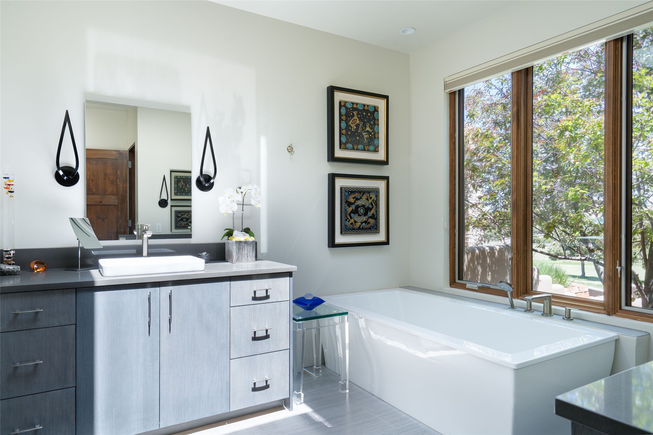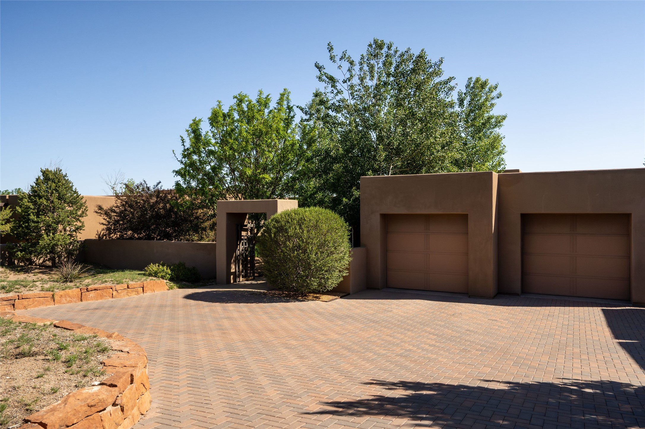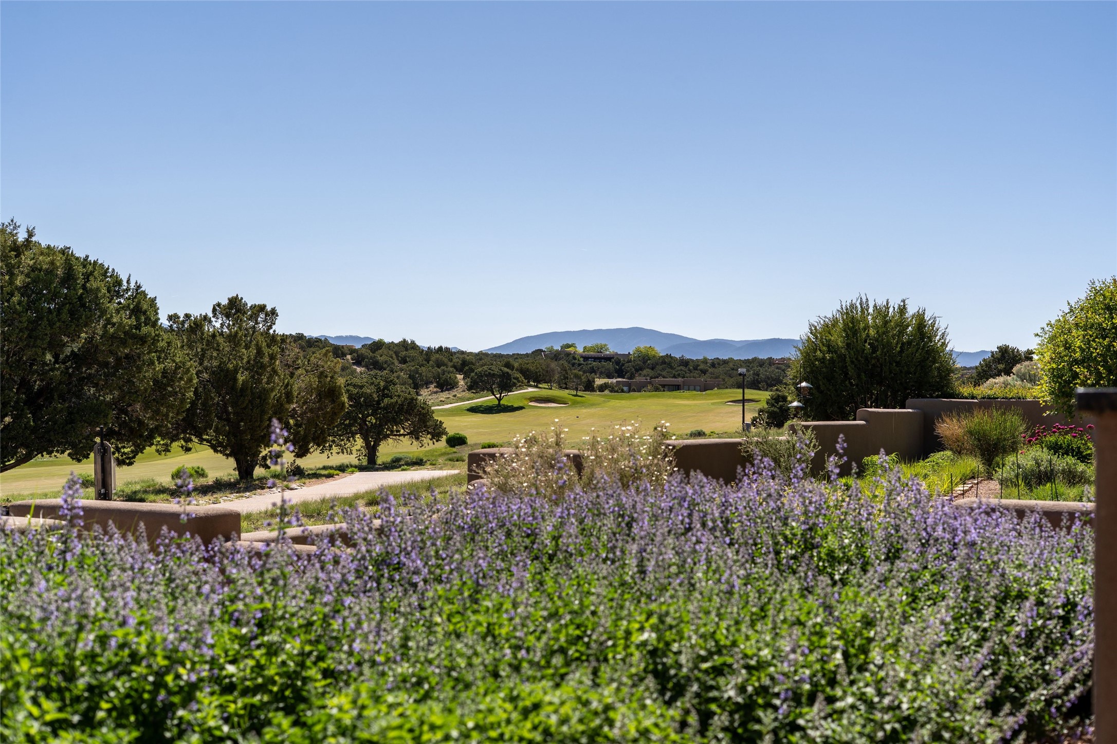 Step into this extraordinary home in Las Campanas, where modern design and natural beauty converge. Stunning 3-bedroom, 3-bath residence offers breathtaking views of the mountains and golf course, creating a picturesque backdrop for your everyday life. Crafted by the award-winning Tierra Concepts, this home exemplifies sophistication and style. The design seamlessly merges indoor and outdoor living with large disappearing window walls and oversized windows. Interior spaces have been thoughtfully curated by Santa Fe designer J. Douglas of J. Douglas Design, showcasing distinctive finishes that elevate the living experience. From the inviting wood ceilings with solid wood beams to the elegant hard-troweled diamond plaster walls and high-quality white oak flooring, every element reflects a commitment to quality and aesthetics. Gourmet kitchen is appointed a Wolf oven and range, Subzero refrigerator, and Asko dishwasher. Spacious primary bedroom features a fireplace, expansive walk-in closet, and a luxury bathroom with separated dual sinks, a soaking tub, and a walk-in shower. Entertaining is effortless with brick patios designed for outdoor dining and leisure, all framed by courtyard walls. Sustainable landscaping with a timed irrigation system that utilizes buried roof water harvesting cisterns alongside community water. 2-car garage equipped with an EV charging station. Experience the perfect blend of luxury and nature where every detail is designed for a lifestyle of elegance and ease.