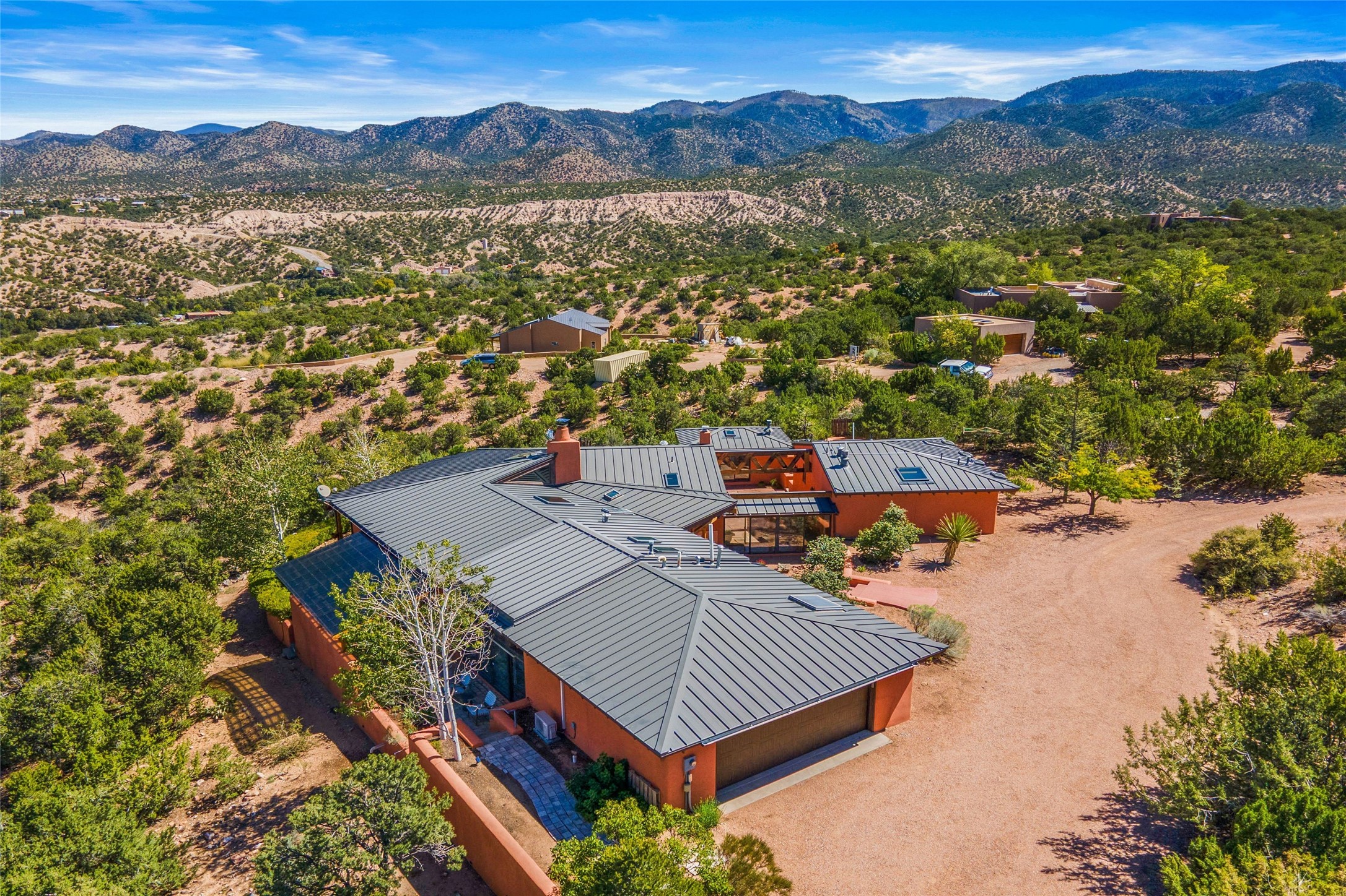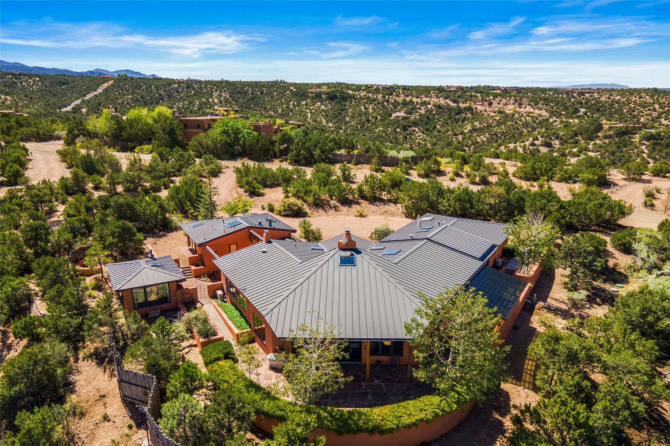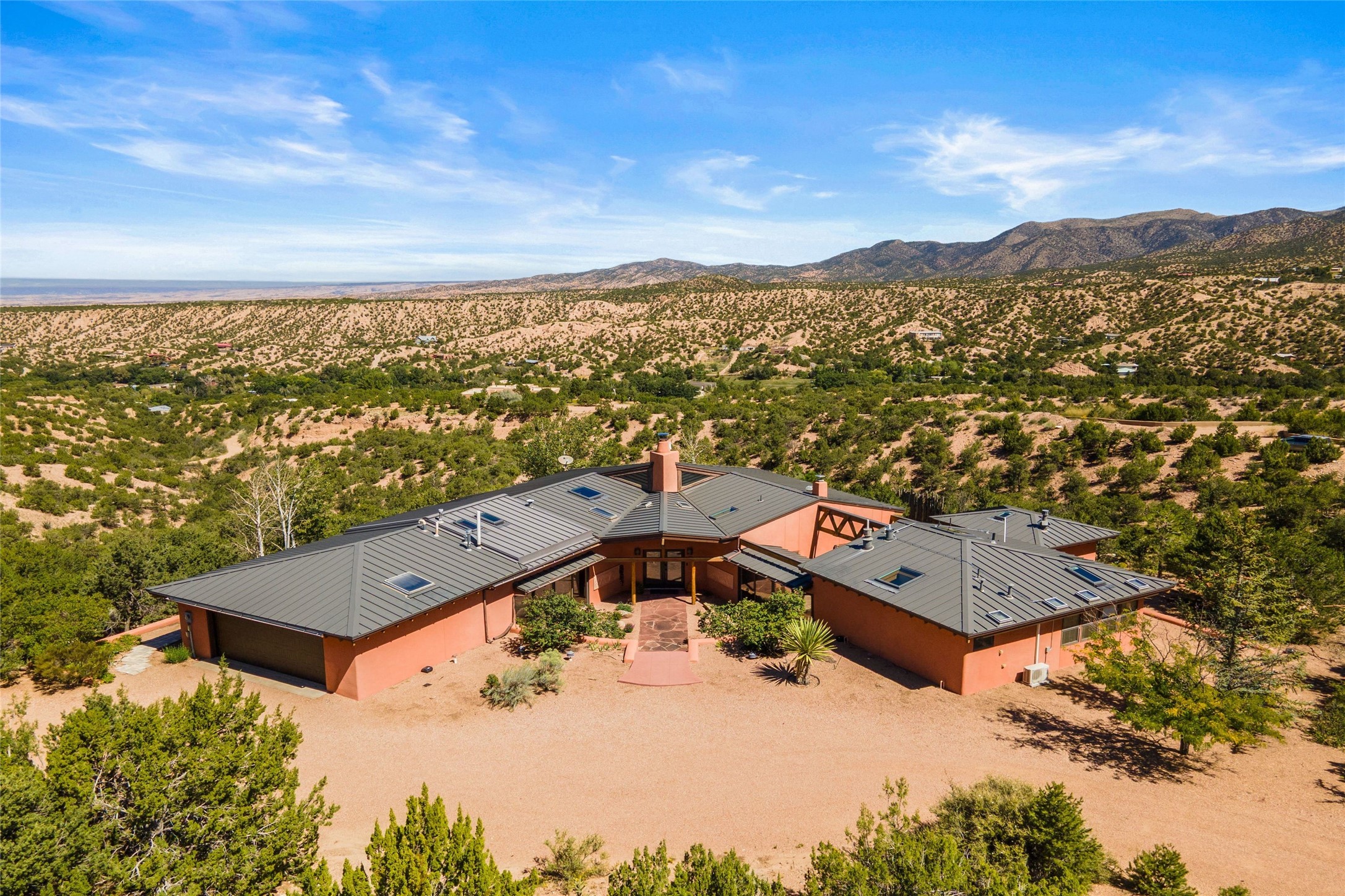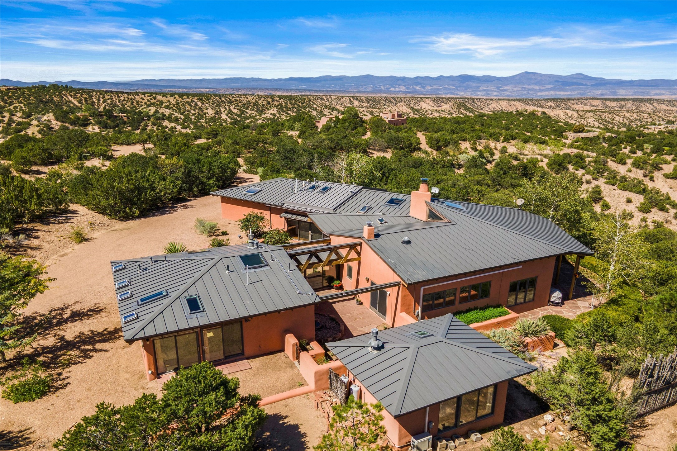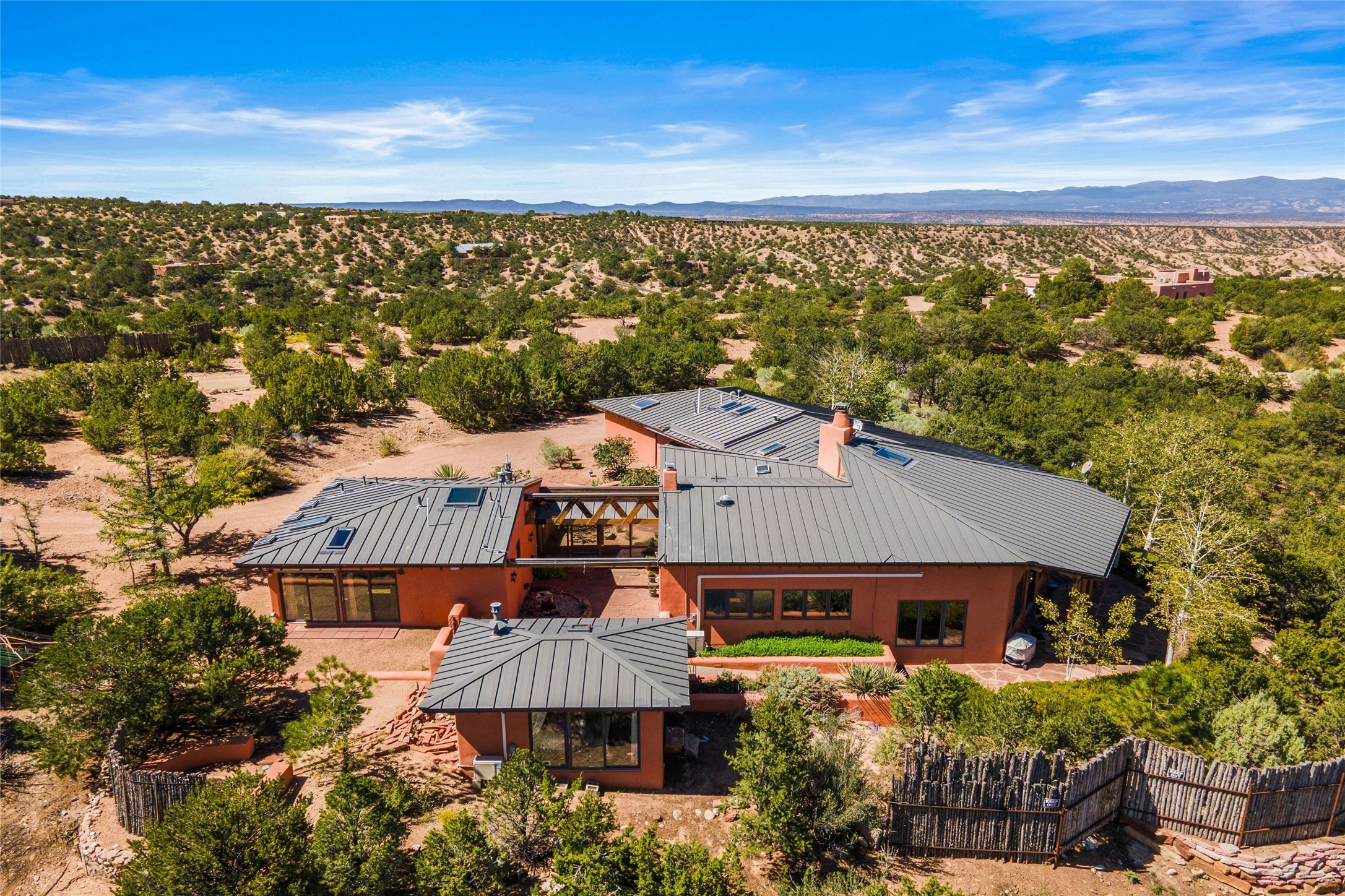 Stunning 3-bedroom, 3.5-bath home in Vista Redonda professionally sited on 5 ridge-top acres of pinon trees and breathtaking views of the Sangre de Cristo and Jemez Mountains. Constructed by renowned builder Dennis Sayer, this residence showcases exceptional workmanship and reflective design. The pitched roof and soaring beamed ceilings create an airy, inviting atmosphere, while the hard plaster walls and polished Saltillo tiles add timeless elegance. Upon entering, you'll find a spacious great room that flows into a dining area and a well-appointed eat-in kitchen. The office, complete with built-in desk and bookcases, provides a quiet retreat, while the kiva fireplace adds warmth and character to the space. The home features two en-suite bedrooms in each wing, ensuring privacy and comfort for guests.. In addition, there is a detached 196 sq. ft. studio/casita. Multiple outdoor areas invite you to enjoy al fresco dining and entertaining, including a delightful sunrise breakfast patio where you can soak in the morning sun with a cup of coffee. Natural light floods the home through plentiful skylights, windows, and glass doors, begetting a bright and welcoming environment. Additional highlights include a heated 2-car garage and newer boiler and water heaters. Just south of Vista Redonda is the Village of Tesuque, its neighborhood gathering spot Tesuque Village Market and the contemporary restaurant and bar, El Nido. Easy access to The Santa Fe Opera and downtown Santa Fe.