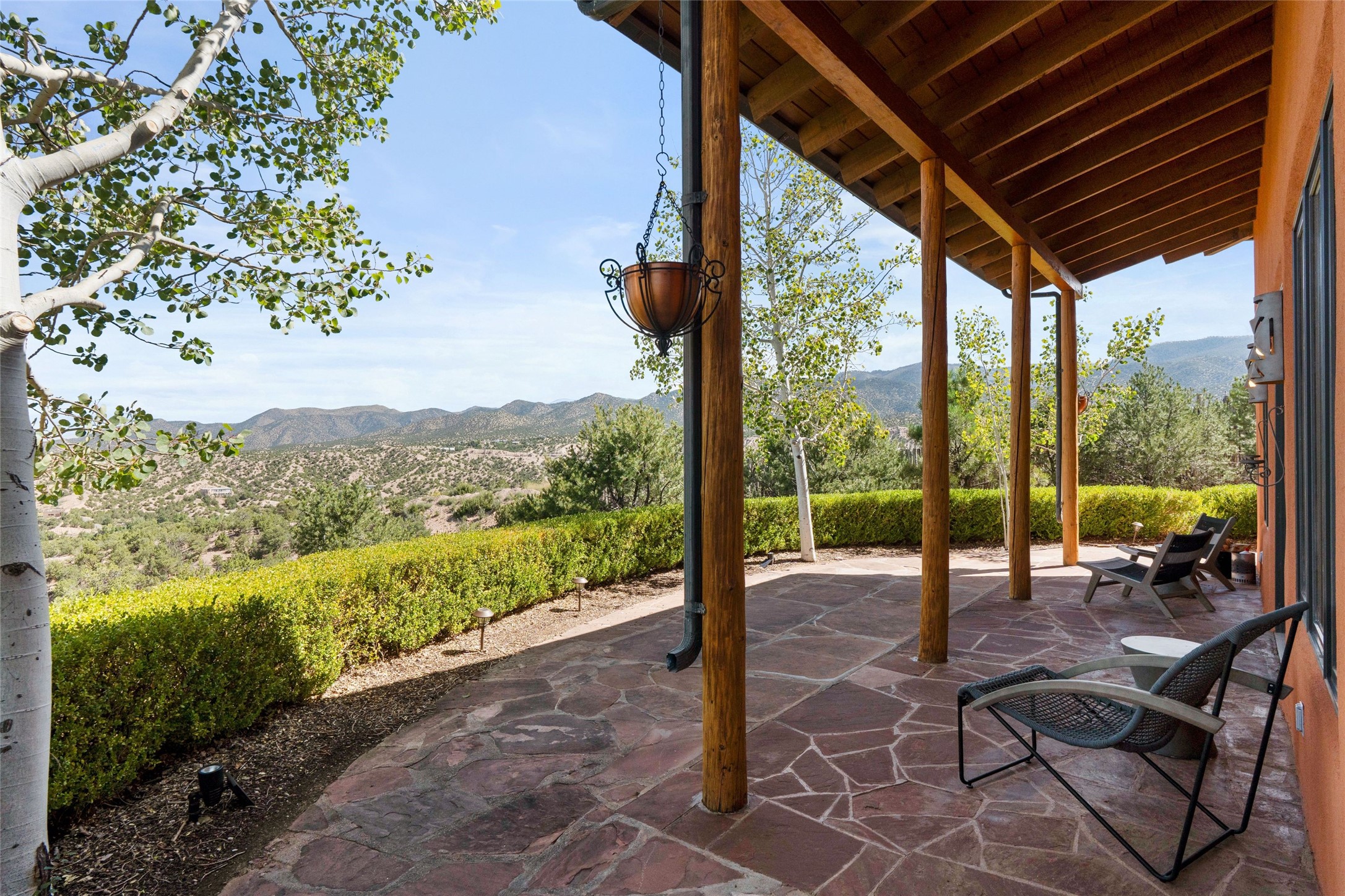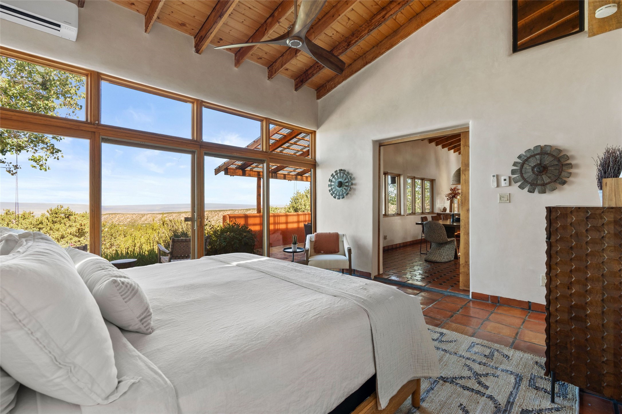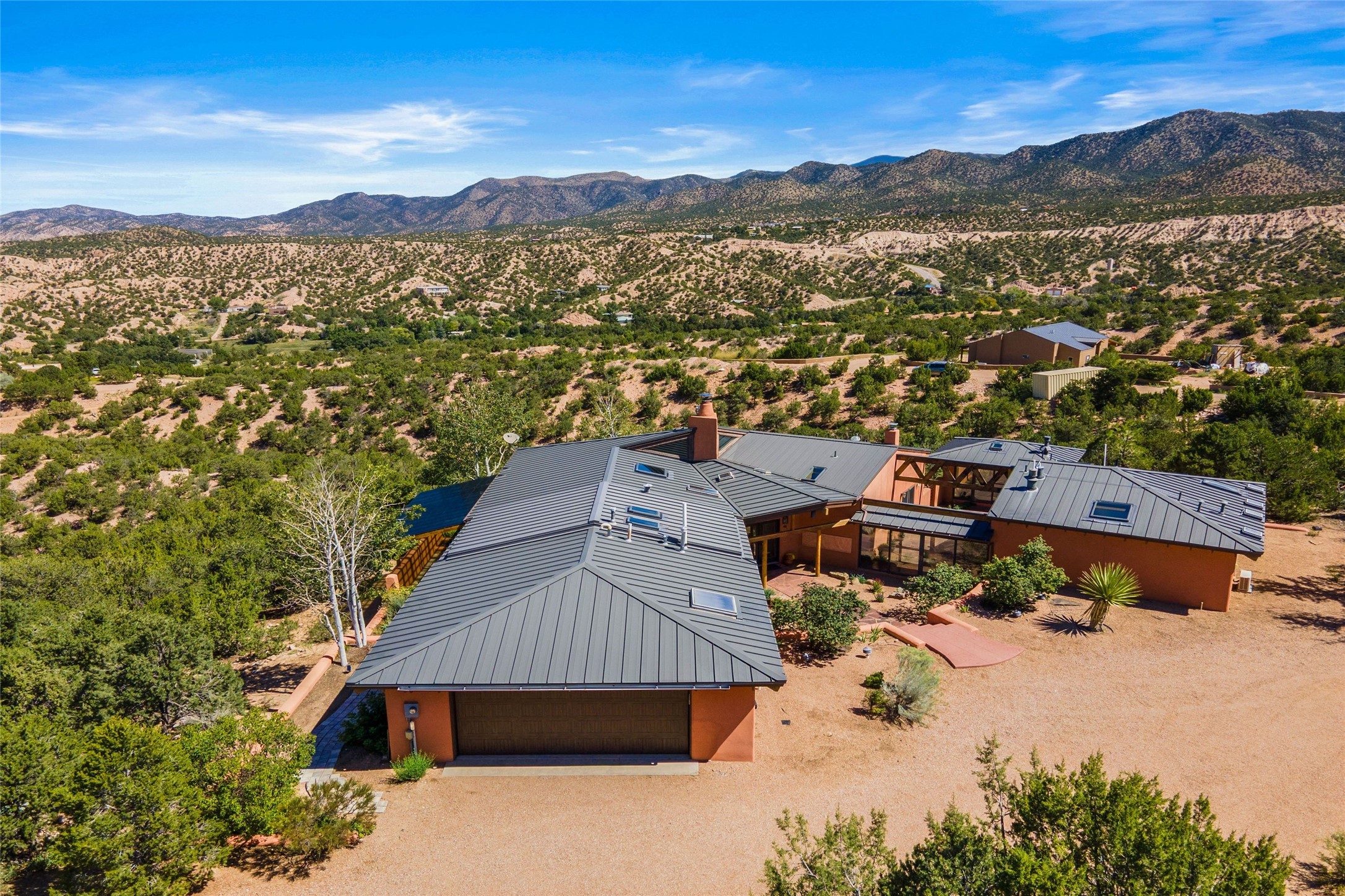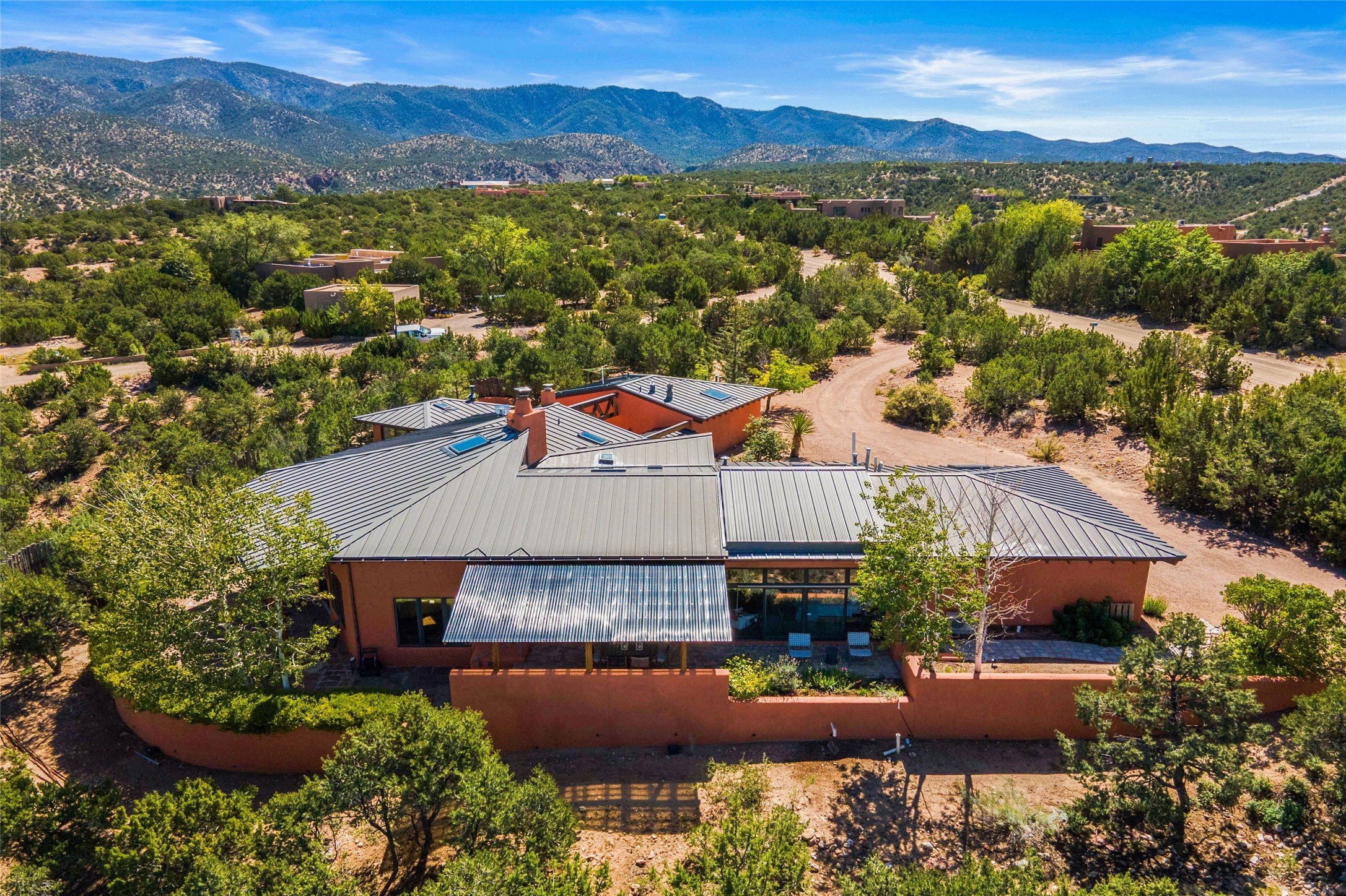 Stunning 3-bedroom, 3.5-bath home in Vista Redonda professionally sited on 5 ridge-top acres of pinon trees and breathtaking views of the Sangre de Cristo and Jemez Mountains. Constructed by renowned builder Dennis Sayer, this residence showcases exceptional workmanship and reflective design. The pitched roof and soaring beamed ceilings create an airy, inviting atmosphere, while the hard plaster walls and polished Saltillo tiles add timeless elegance. Upon entering, you'll find a spacious great room that flows into a dining area and a well-appointed eat-in kitchen. The office, complete with built-in desk and bookcases, provides a quiet retreat, while the kiva fireplace adds warmth and character to the space. The home features two en-suite bedrooms in each wing, ensuring privacy and comfort for guests.. In addition, there is a detached 196 sq. ft. studio/casita. Multiple outdoor areas invite you to enjoy al fresco dining and entertaining, including a delightful sunrise breakfast patio where you can soak in the morning sun with a cup of coffee. Natural light floods the home through plentiful skylights, windows, and glass doors, begetting a bright and welcoming environment. Additional highlights include a heated 2-car garage and newer boiler and water heaters. Just south of Vista Redonda is the Village of Tesuque, its neighborhood gathering spot Tesuque Village Market and the contemporary restaurant and bar, El Nido. Easy access to The Santa Fe Opera and downtown Santa Fe.