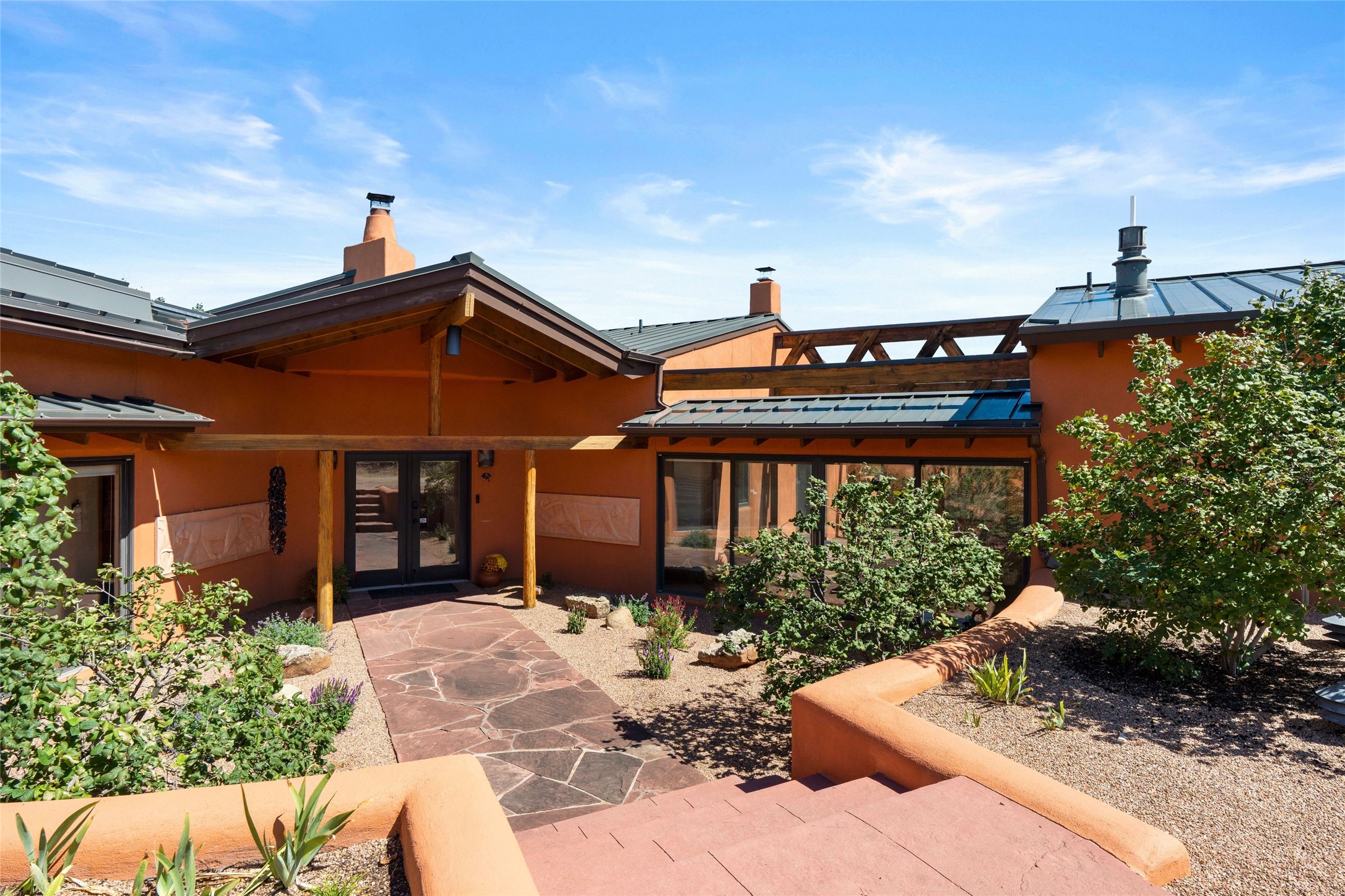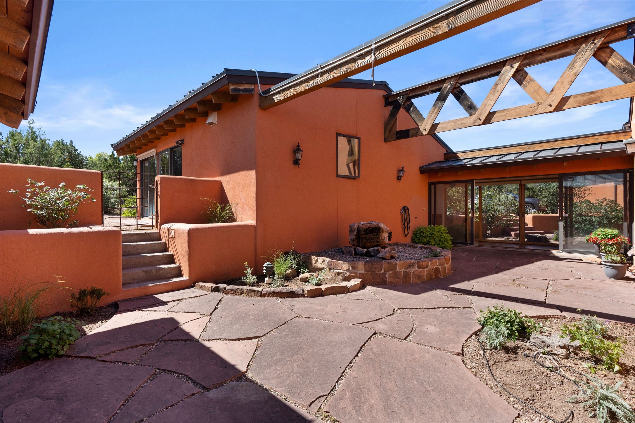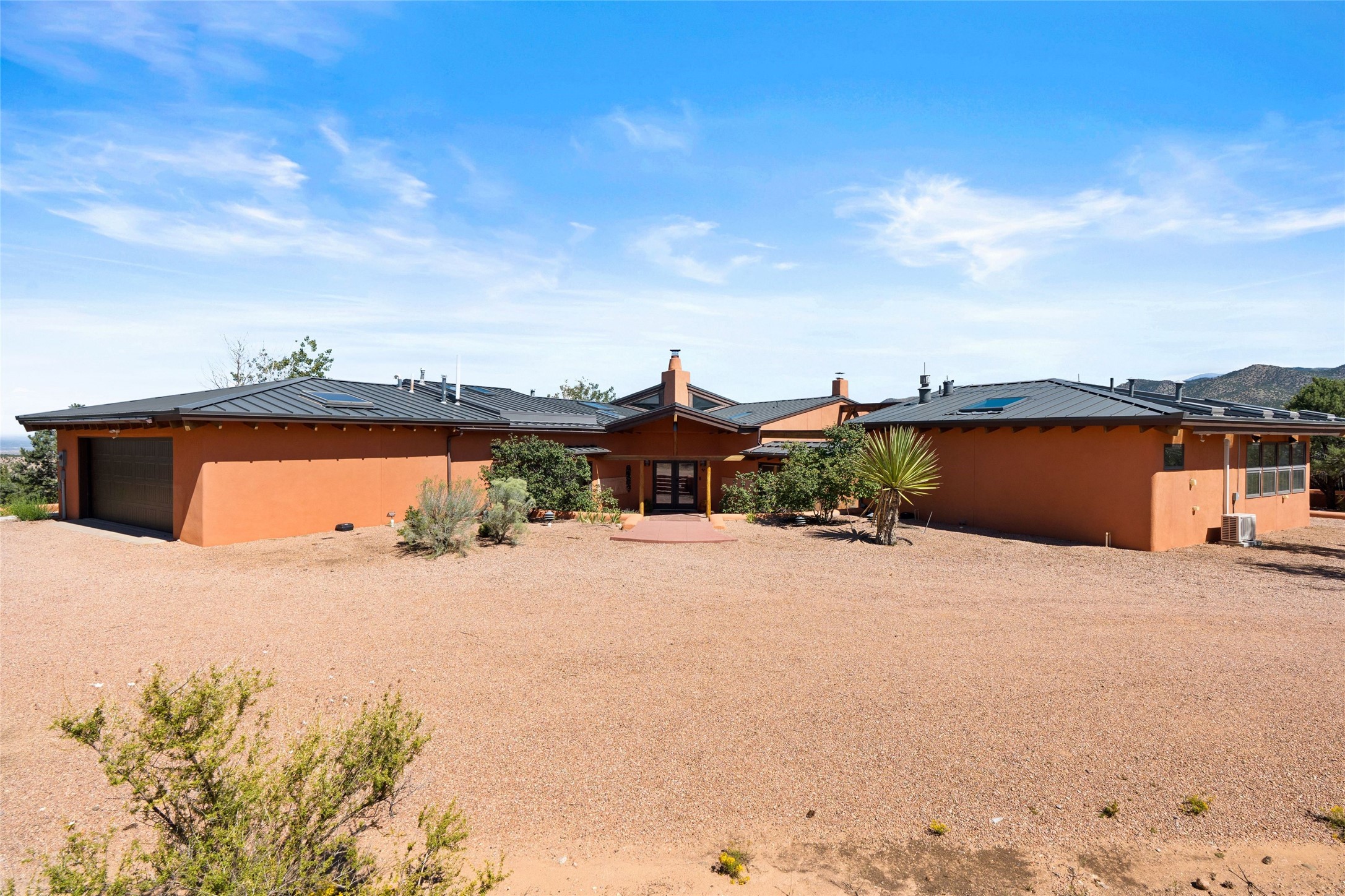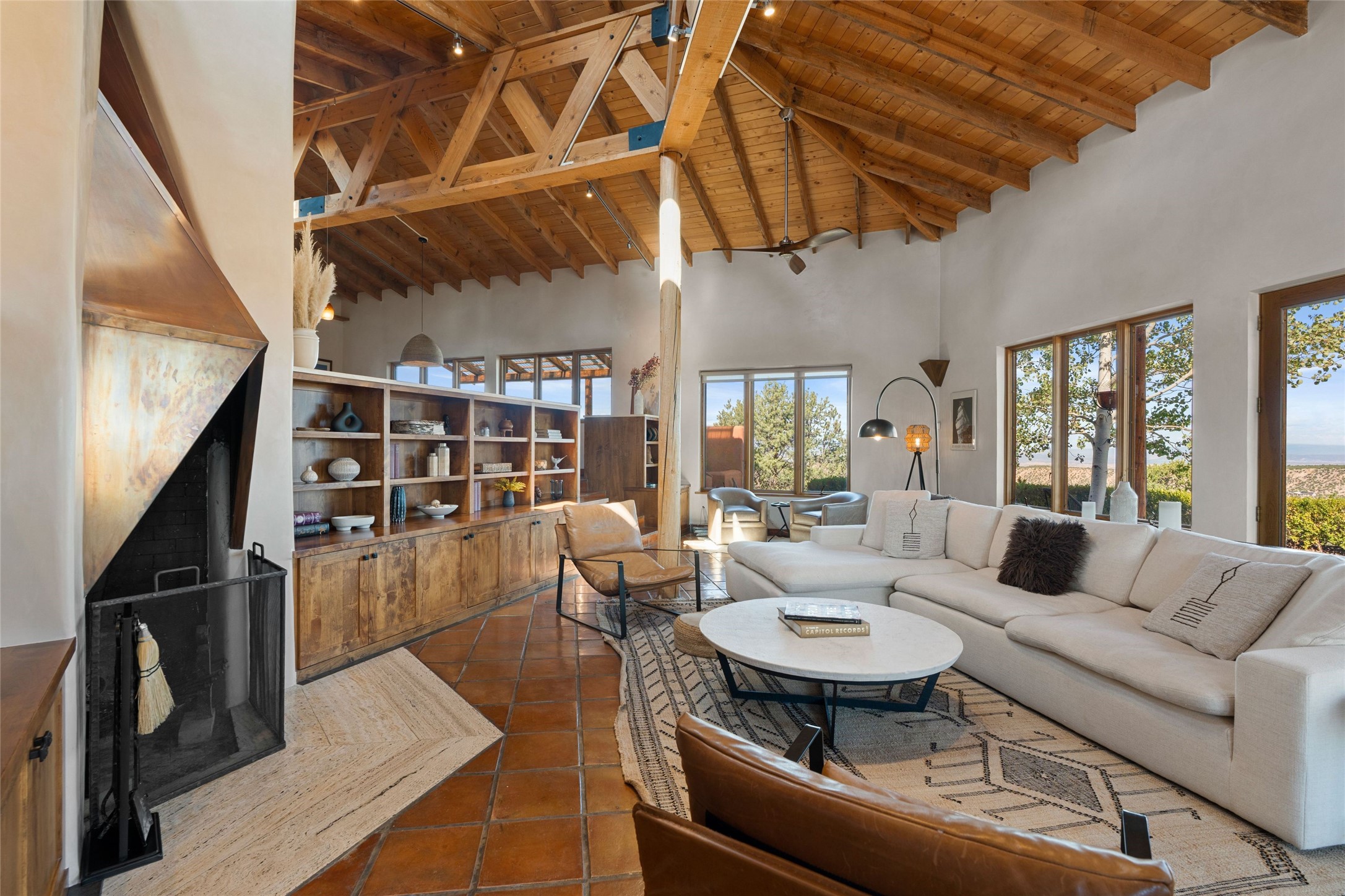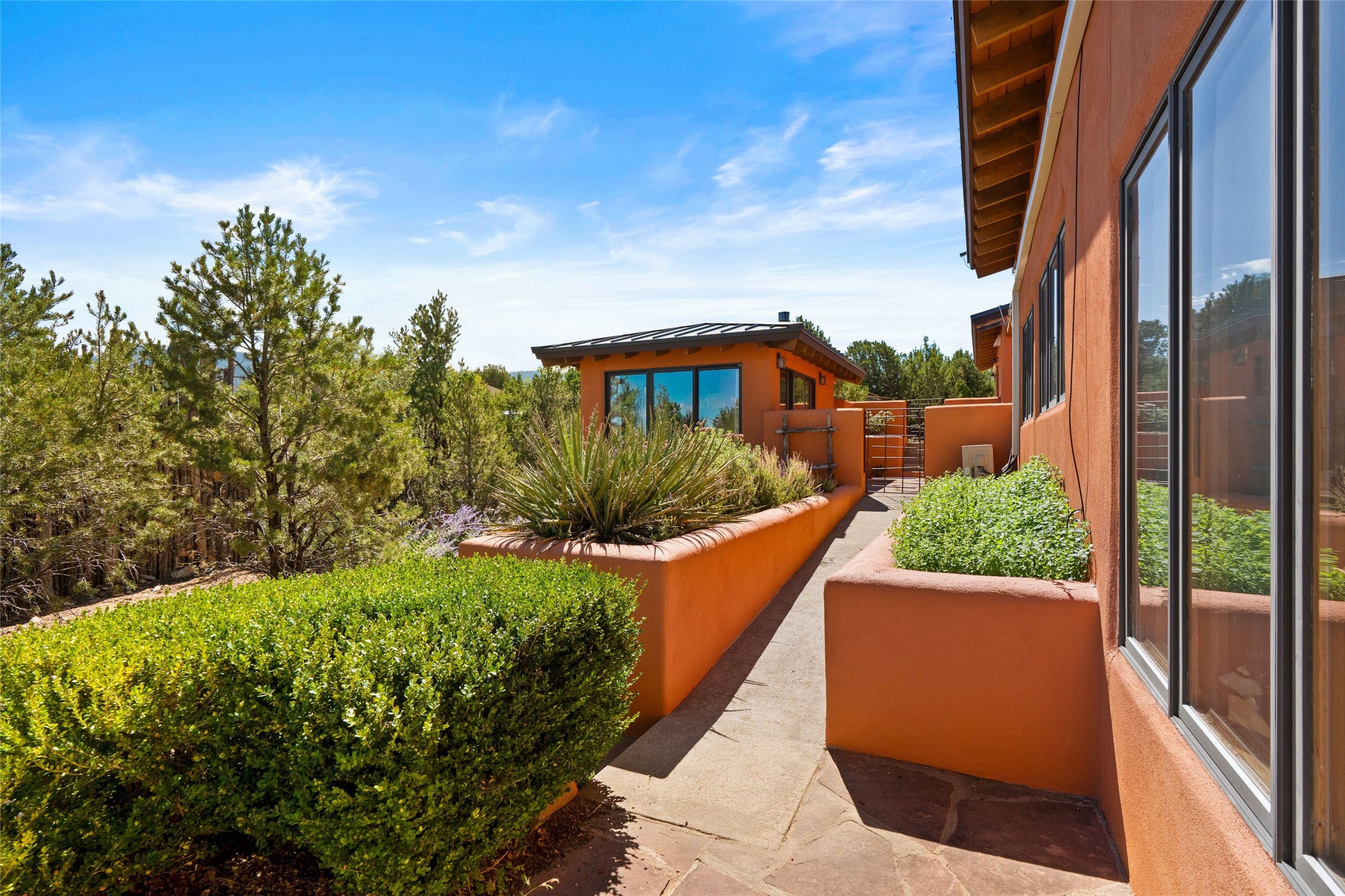 Stunning 3-bedroom, 3.5-bath home in Vista Redonda professionally sited on 5 ridge-top acres of pinon trees and breathtaking views of the Sangre de Cristo and Jemez Mountains. Constructed by renowned builder Dennis Sayer, this residence showcases exceptional workmanship and reflective design. The pitched roof and soaring beamed ceilings create an airy, inviting atmosphere, while the hard plaster walls and polished Saltillo tiles add timeless elegance. Upon entering, you'll find a spacious great room that flows into a dining area and a well-appointed eat-in kitchen. The office, complete with built-in desk and bookcases, provides a quiet retreat, while the kiva fireplace adds warmth and character to the space. The home features two en-suite bedrooms in each wing, ensuring privacy and comfort for guests.. In addition, there is a detached 196 sq. ft. studio/casita. Multiple outdoor areas invite you to enjoy al fresco dining and entertaining, including a delightful sunrise breakfast patio where you can soak in the morning sun with a cup of coffee. Natural light floods the home through plentiful skylights, windows, and glass doors, begetting a bright and welcoming environment. Additional highlights include a heated 2-car garage and newer boiler and water heaters. Just south of Vista Redonda is the Village of Tesuque, its neighborhood gathering spot Tesuque Village Market and the contemporary restaurant and bar, El Nido. Easy access to The Santa Fe Opera and downtown Santa Fe.