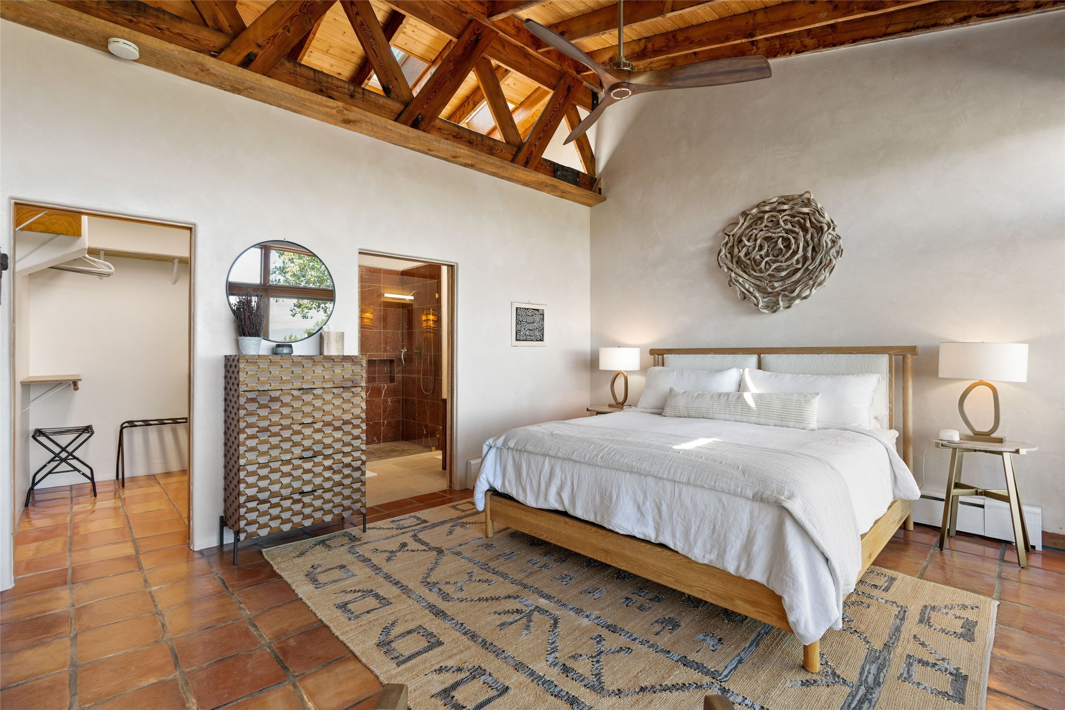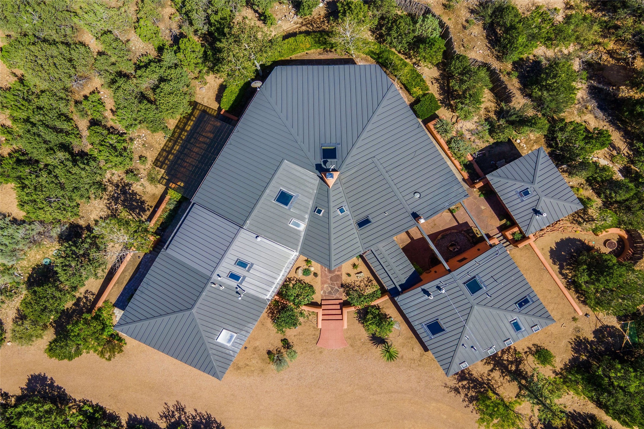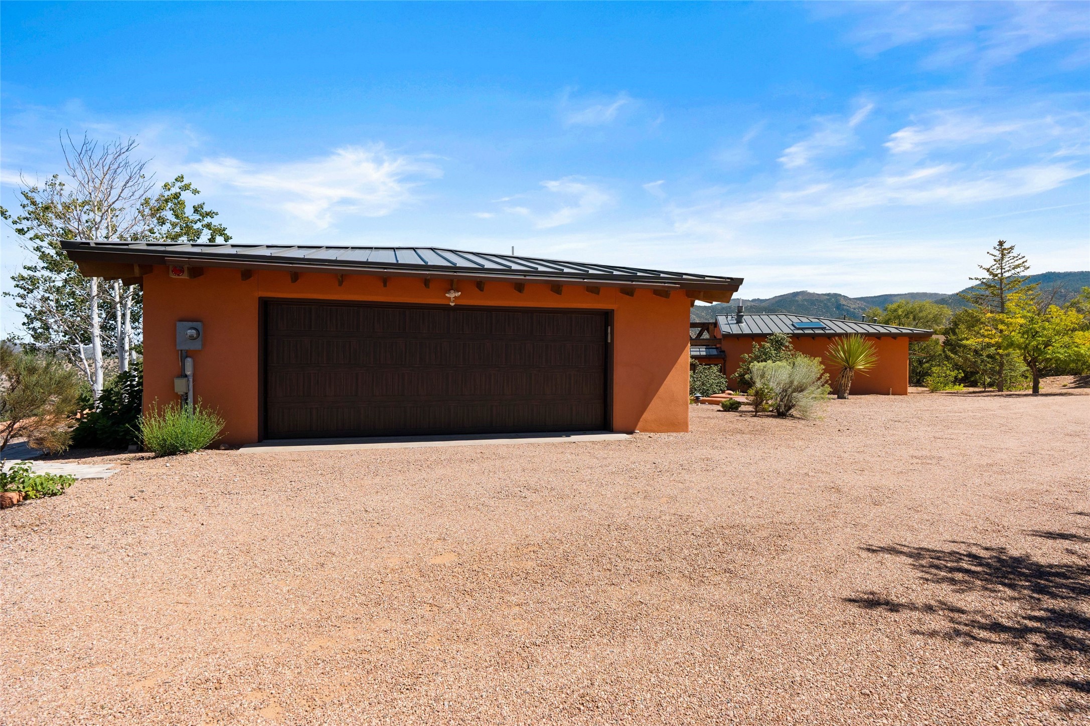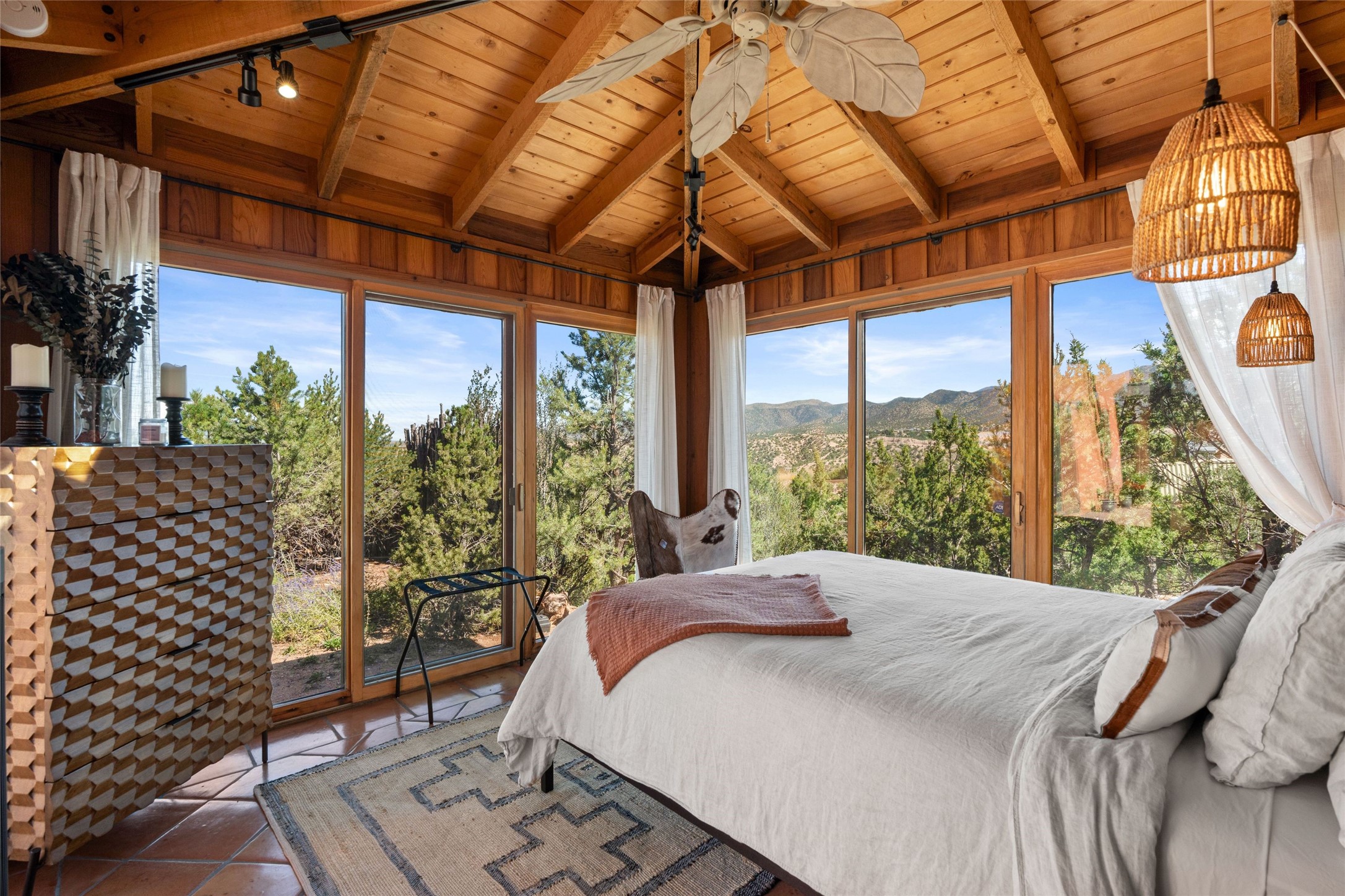 Stunning 3-bedroom, 3.5-bath home in Vista Redonda professionally sited on 5 ridge-top acres of pinon trees and breathtaking views of the Sangre de Cristo and Jemez Mountains. Constructed by renowned builder Dennis Sayer, this residence showcases exceptional workmanship and reflective design. The pitched roof and soaring beamed ceilings create an airy, inviting atmosphere, while the hard plaster walls and polished Saltillo tiles add timeless elegance. Upon entering, you'll find a spacious great room that flows into a dining area and a well-appointed eat-in kitchen. The office, complete with built-in desk and bookcases, provides a quiet retreat, while the kiva fireplace adds warmth and character to the space. The home features two en-suite bedrooms in each wing, ensuring privacy and comfort for guests.. In addition, there is a detached 196 sq. ft. studio/casita. Multiple outdoor areas invite you to enjoy al fresco dining and entertaining, including a delightful sunrise breakfast patio where you can soak in the morning sun with a cup of coffee. Natural light floods the home through plentiful skylights, windows, and glass doors, begetting a bright and welcoming environment. Additional highlights include a heated 2-car garage and newer boiler and water heaters. Just south of Vista Redonda is the Village of Tesuque, its neighborhood gathering spot Tesuque Village Market and the contemporary restaurant and bar, El Nido. Easy access to The Santa Fe Opera and downtown Santa Fe.
