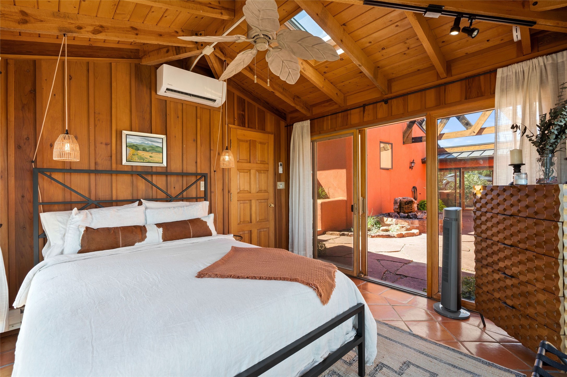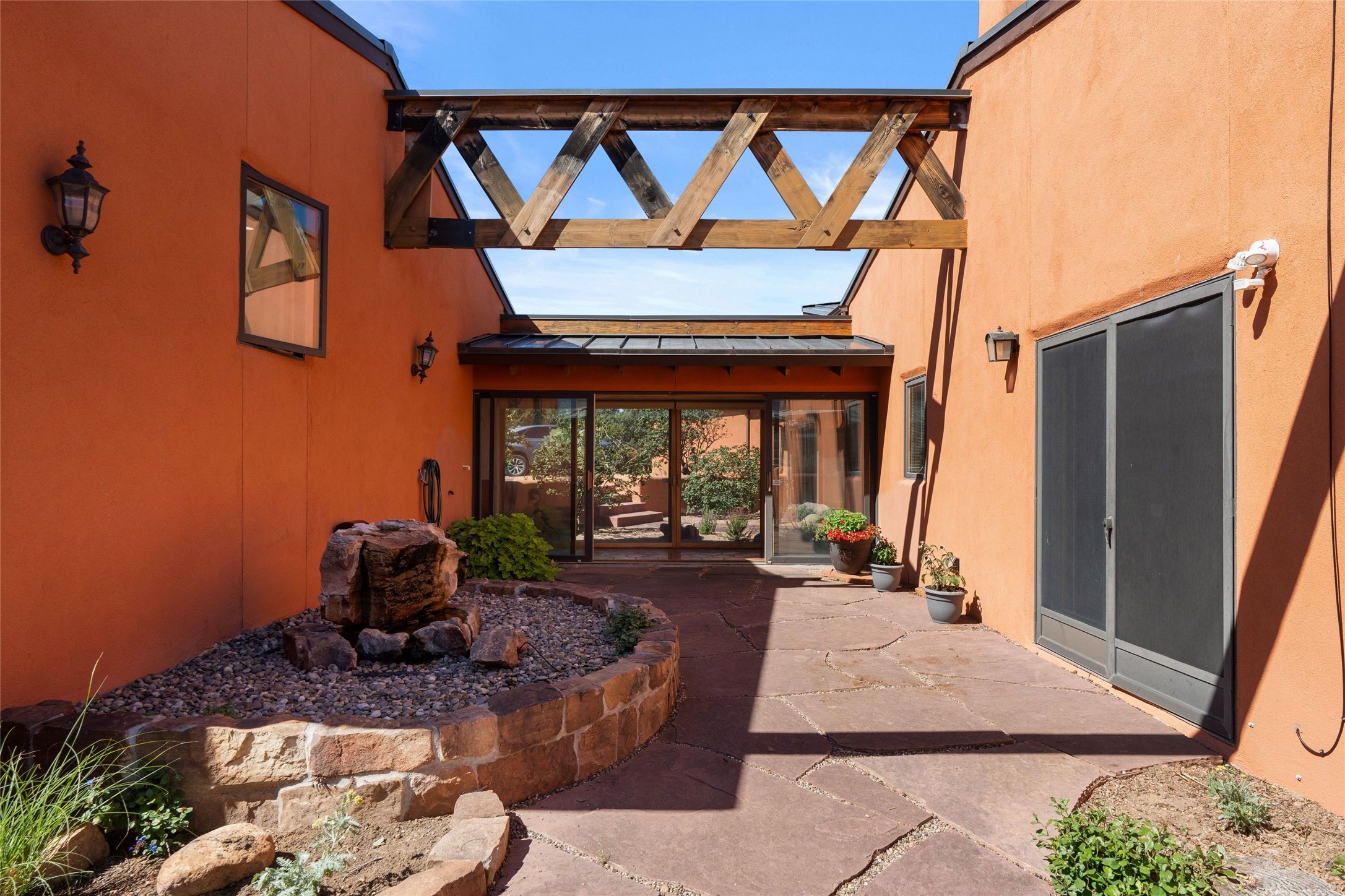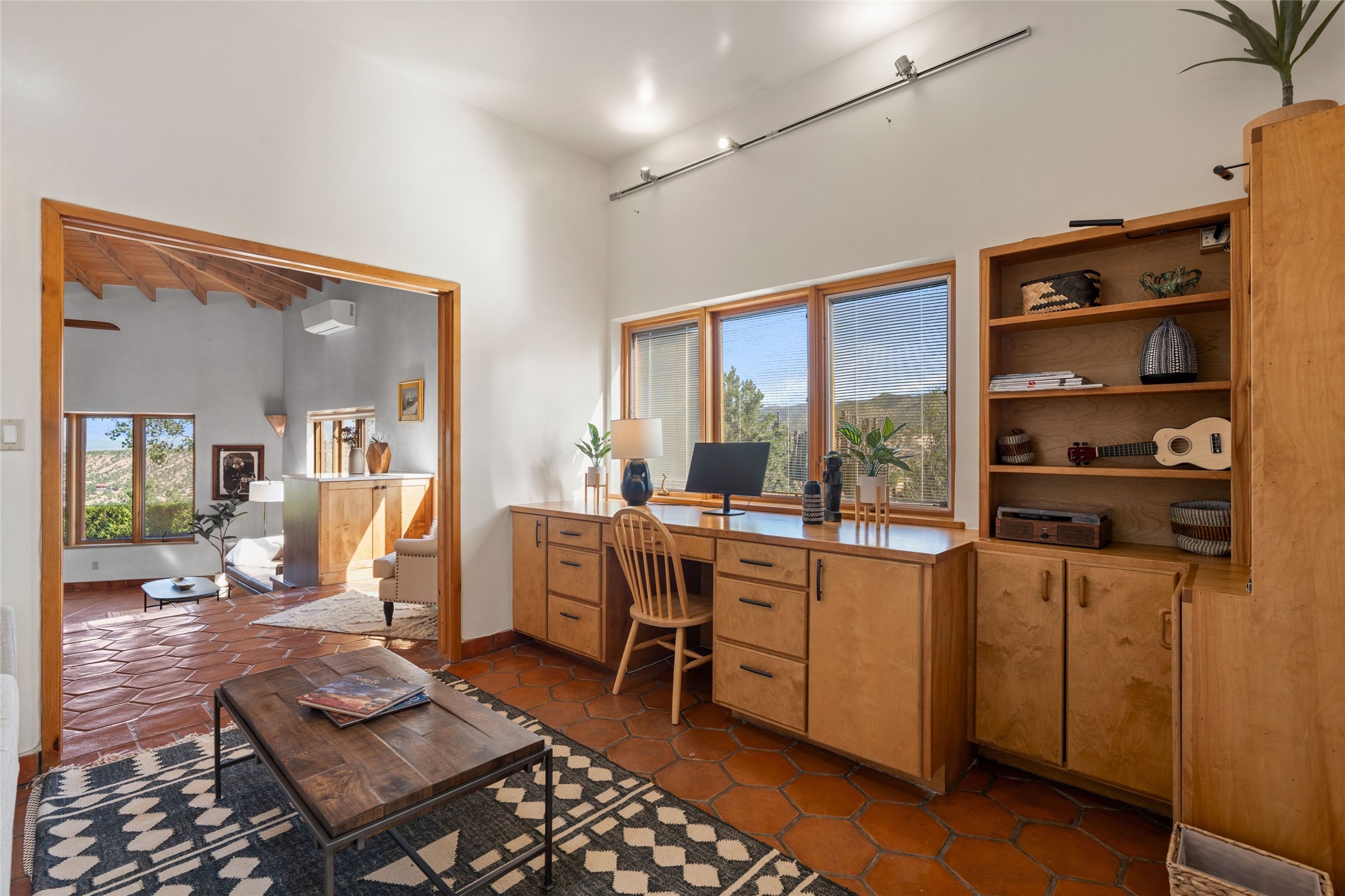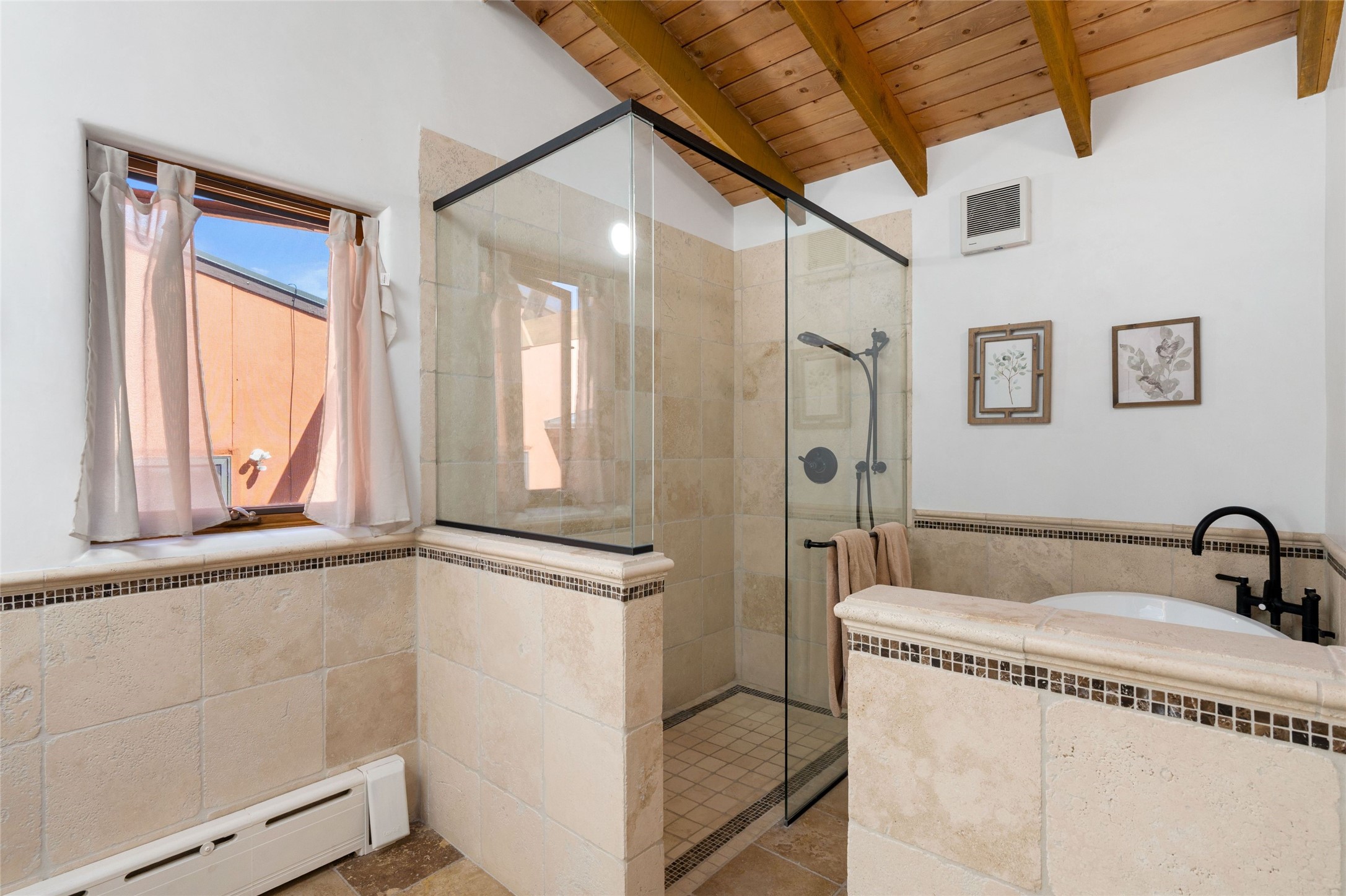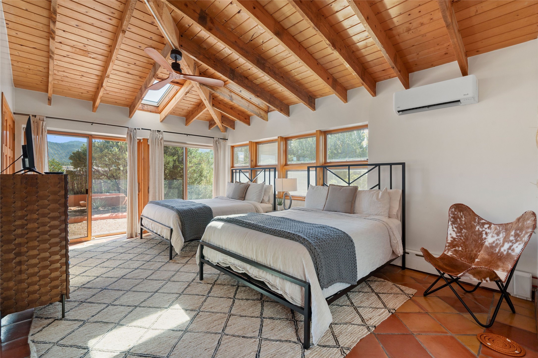 Stunning 3-bedroom, 3.5-bath home in Vista Redonda professionally sited on 5 ridge-top acres of pinon trees and breathtaking views of the Sangre de Cristo and Jemez Mountains. Constructed by renowned builder Dennis Sayer, this residence showcases exceptional workmanship and reflective design. The pitched roof and soaring beamed ceilings create an airy, inviting atmosphere, while the hard plaster walls and polished Saltillo tiles add timeless elegance. Upon entering, you'll find a spacious great room that flows into a dining area and a well-appointed eat-in kitchen. The office, complete with built-in desk and bookcases, provides a quiet retreat, while the kiva fireplace adds warmth and character to the space. The home features two en-suite bedrooms in each wing, ensuring privacy and comfort for guests.. In addition, there is a detached 196 sq. ft. studio/casita. Multiple outdoor areas invite you to enjoy al fresco dining and entertaining, including a delightful sunrise breakfast patio where you can soak in the morning sun with a cup of coffee. Natural light floods the home through plentiful skylights, windows, and glass doors, begetting a bright and welcoming environment. Additional highlights include a heated 2-car garage and newer boiler and water heaters. Just south of Vista Redonda is the Village of Tesuque, its neighborhood gathering spot Tesuque Village Market and the contemporary restaurant and bar, El Nido. Easy access to The Santa Fe Opera and downtown Santa Fe.