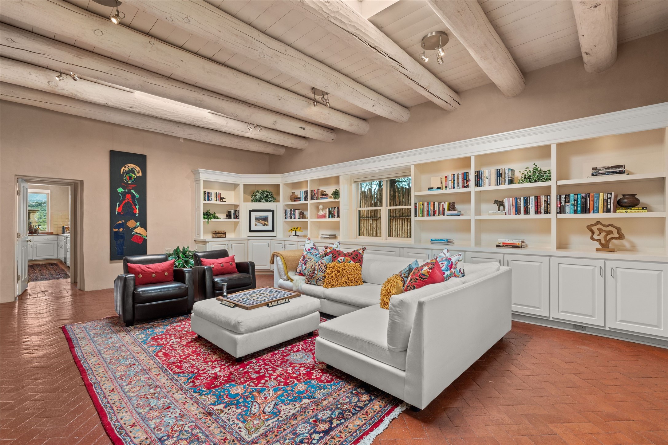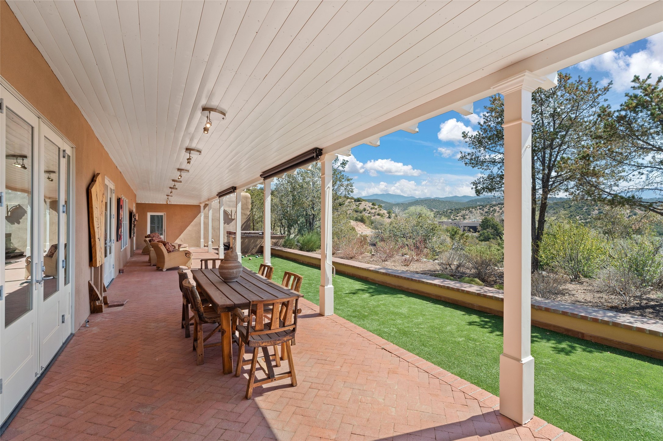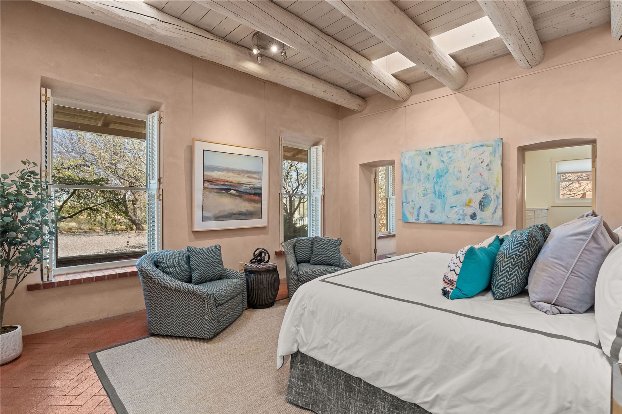 This unique and beautiful 3-bedroom, 3-bath modified Territorial-style, adobe home features unobstructed east-west mountain views and a tableau of breathtaking sunrises and sunsets. Designed by Doug Atwill, a Santa Fe builder/artist with exceptional vision, this home also features 13 ft. high beamed ceilings, 23 skylights, and radiant-heated brick floors complemented by 3 fireplaces. As you enter, a wide and gracious hallway welcomes and guides you to the back portal with stunning views of the eastern mountains. Situated to align with the summer solstice, this central hallway enjoys abundant light and provides a perfect place for displaying artwork. Public areas of the home, including elegant living room, library/media room, and spacious kitchen/dining room, are located on the south side of the hall while the private bedrooms are located on the north side. An outdoor grilling/barbecue station, hot tub, and multiple portals/patios, provide ample space for relaxation and entertaining. Gardeners and chefs alike will delight in the property's mature fruit trees and 2 waist-high irrigated planting beds. Oversized (built 2020) two-car detached garage features heating/cooling, floor-to-ceiling cabinets, art storage, EV charger, 220-volt RV charger and rooftop viewing/entertainment deck with panoramic mountain views. Environmentally conscious buyers will appreciate the green features including the solar photovoltaic electric system. Water monitoring and shut off system. Located less than one mile north of Fort Marcy and the historic Santa Fe Plaza.
