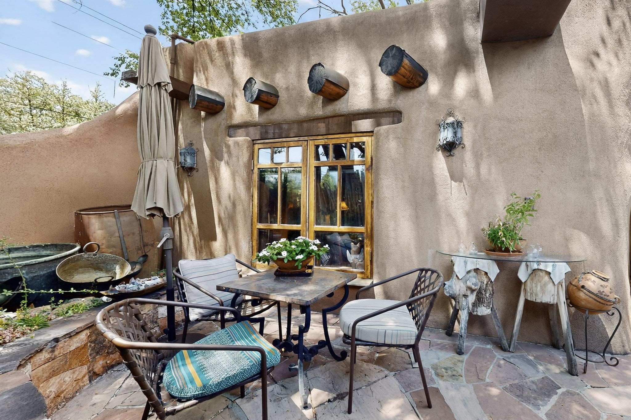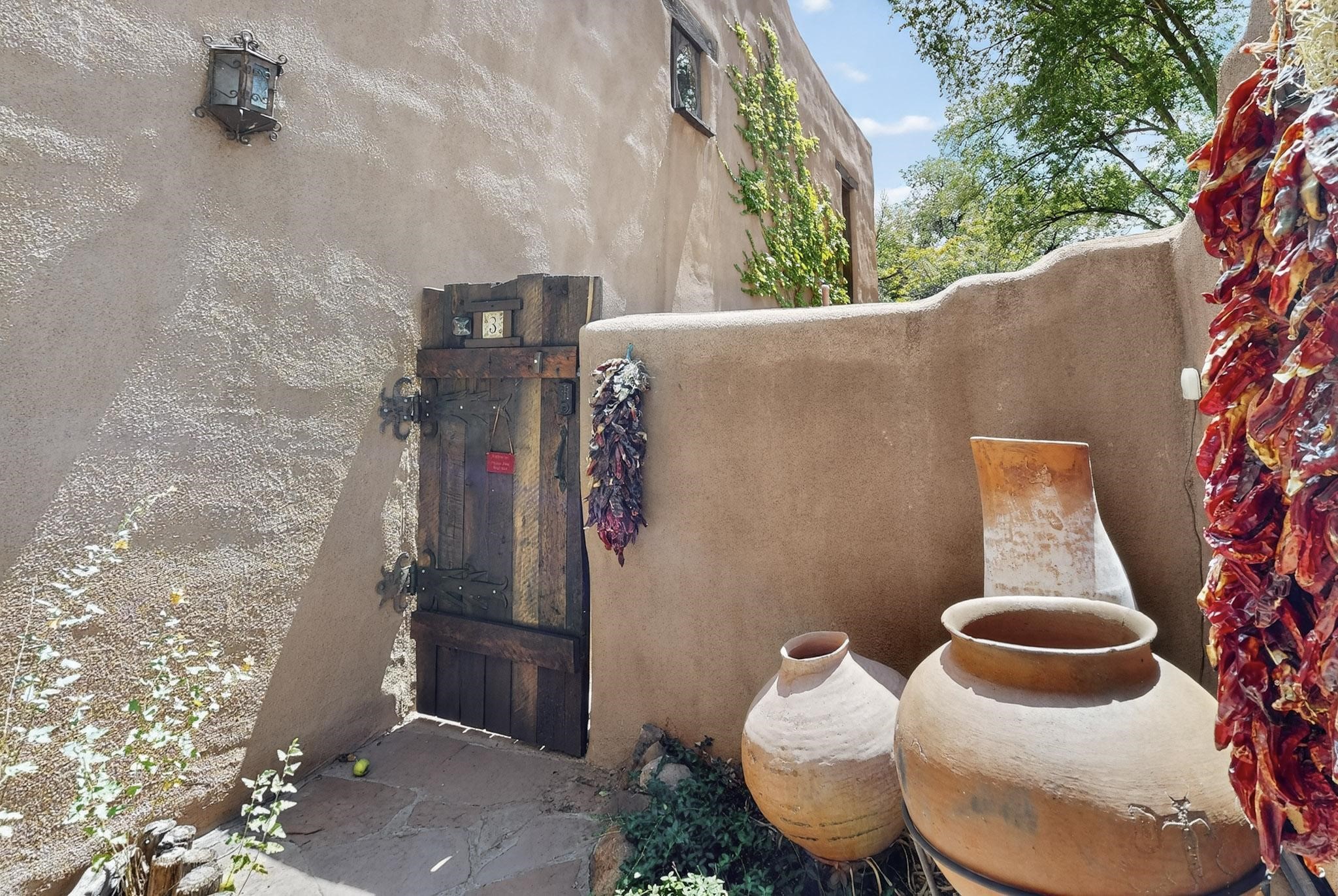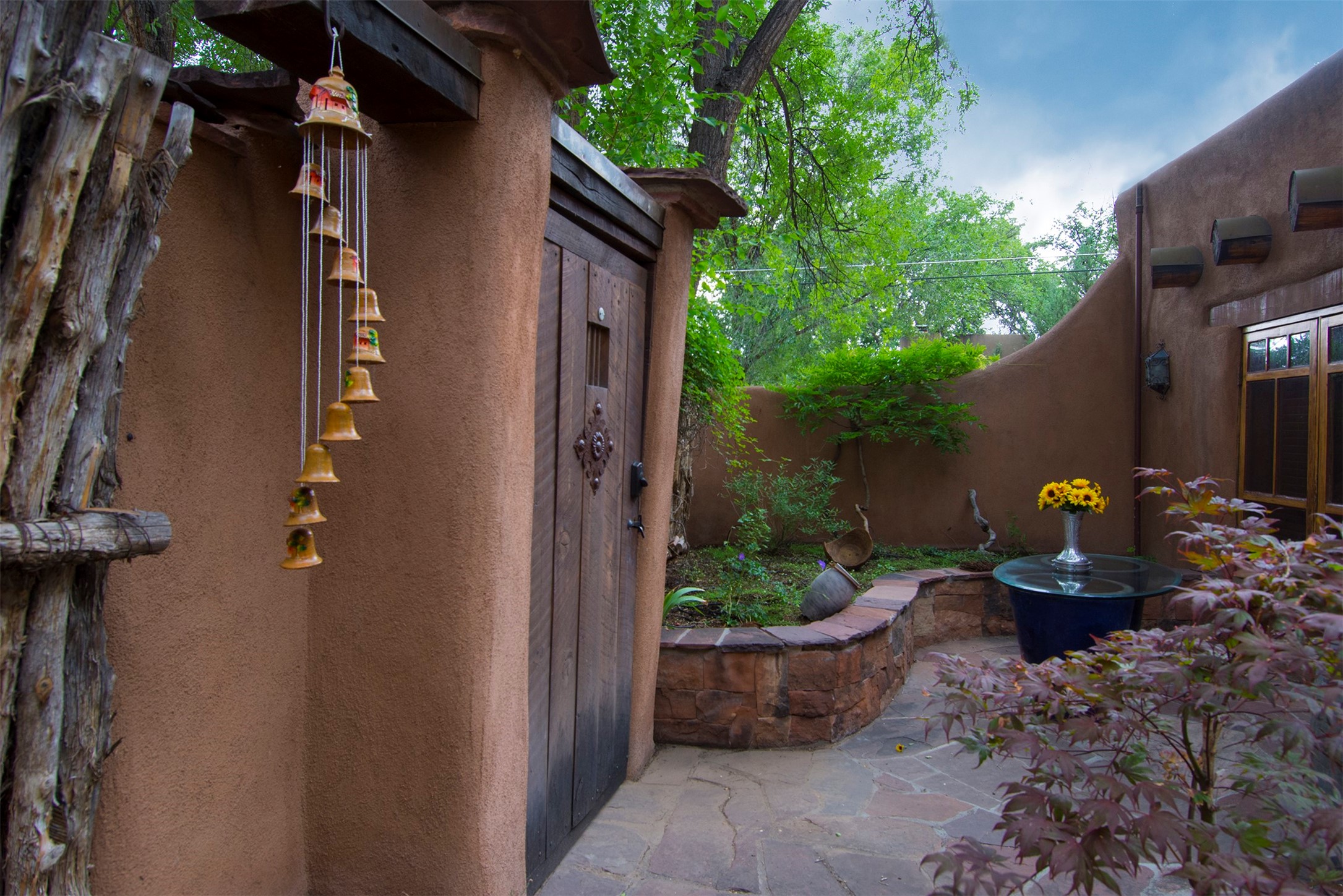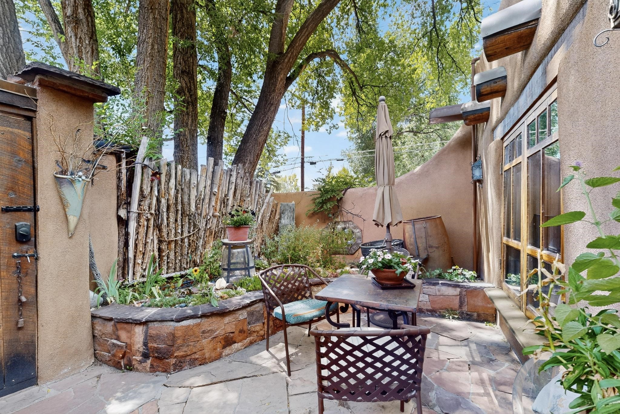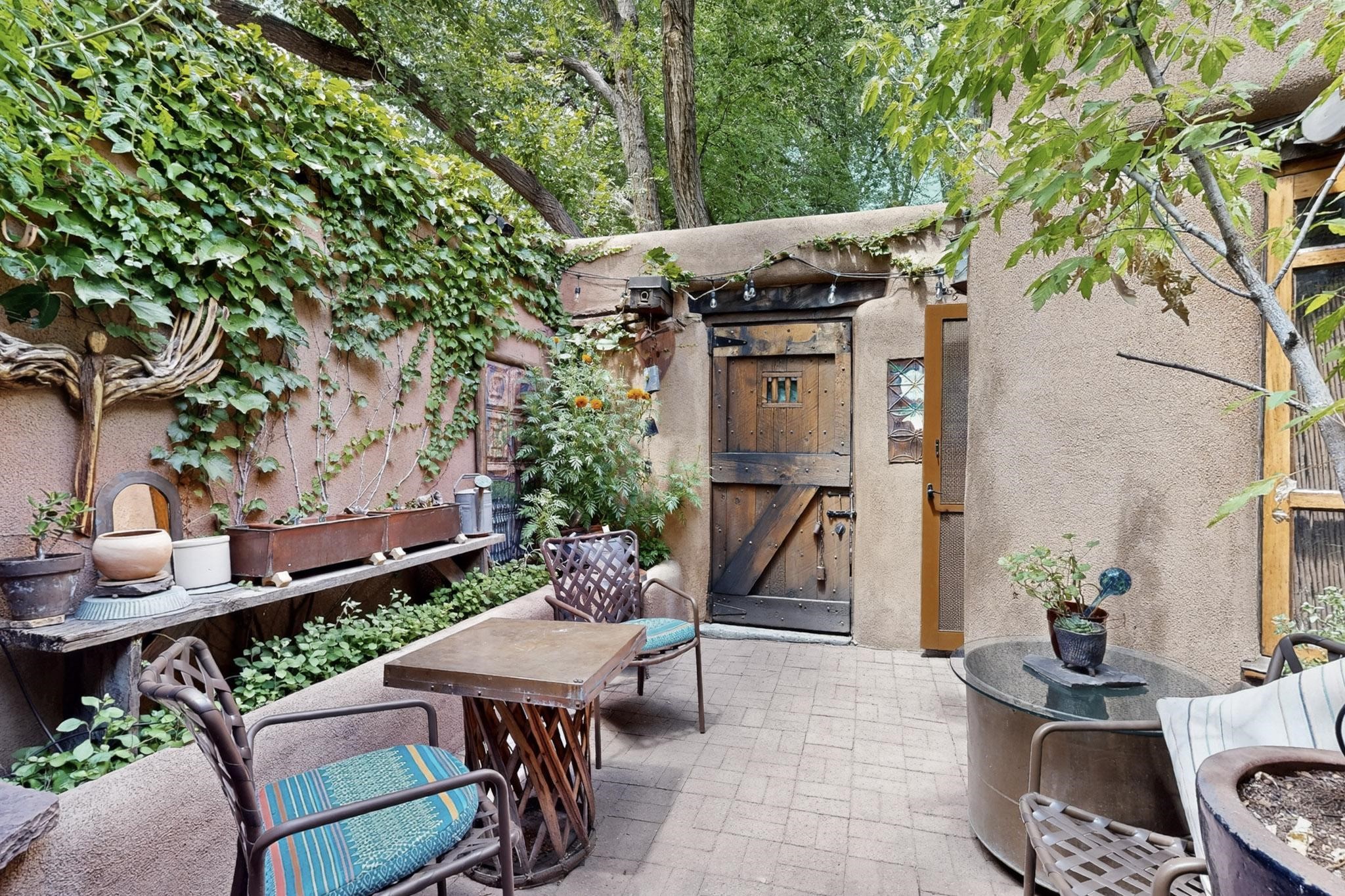 One of the first homes to be built in this fascinating compound known as the Llano Adobe Compound, was built partially over the site of a one time iconic Santa Fe pub and is adjacent to an old farmhouse. The developer and builder, Phill Hawse, a student of Frank Lloyd Wright at Taliesin West, built these homes using traditional materials and methods to recreate the style and feel of a bygone era of adobe built homes with simple interiors, handcrafted wooden doors, windows and cabinets, brick floors, tree trunk roof supports (vigas) and flagstone courtyards. This sweet 2 bedroom, 2 bath home has been updated with a newer kitchen, bathrooms and plumbing, but otherwise retains much of the charm and spirit of Phill. He recently personally gave the seller original construction photographs that will be given to the next owner. The open plan kitchen and living room are illuminated with a 'wall washer' skylight that runs the width of the house along the back wall providing ample natural light. The fireplace in the living room makes for cozy evenings around the hearth. The entry courtyard charms with garden planters, adobe walls, a unique entry gate and shade from towering elms. Outside is the main parking space directly accessible off E. Palace. 2 back gates also access the property from the nearby secondary parking reached by a winding flagstone pathway. 5 year old brie roof with transferable warranty. Downtown Santa Fe and the iconic Canyon Road are just a short distance from this romantic hideaway.
