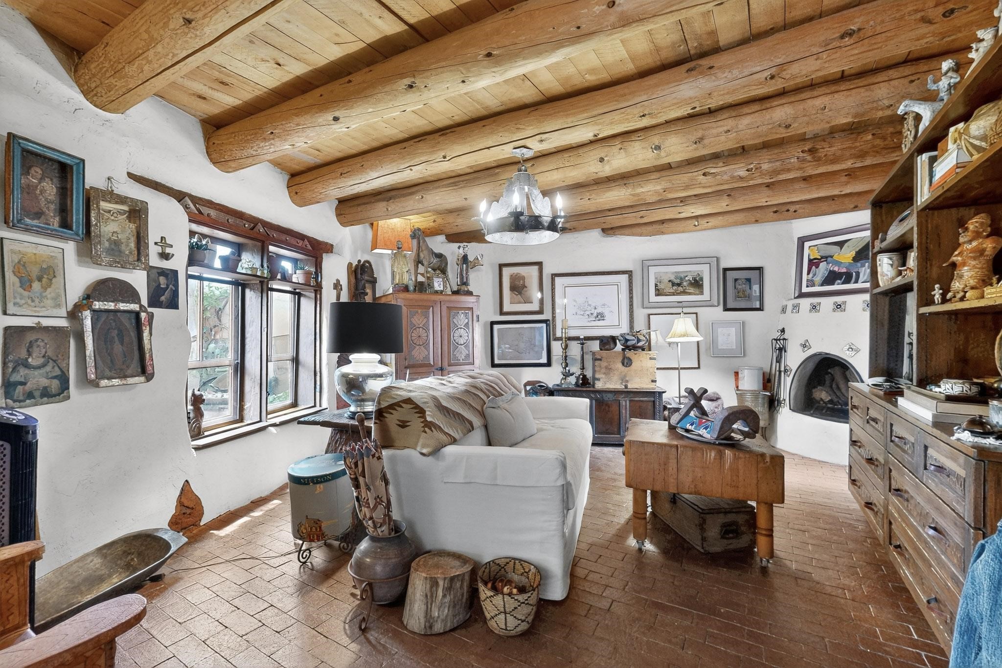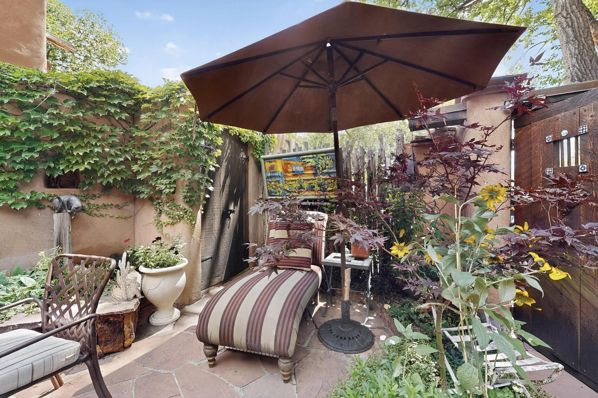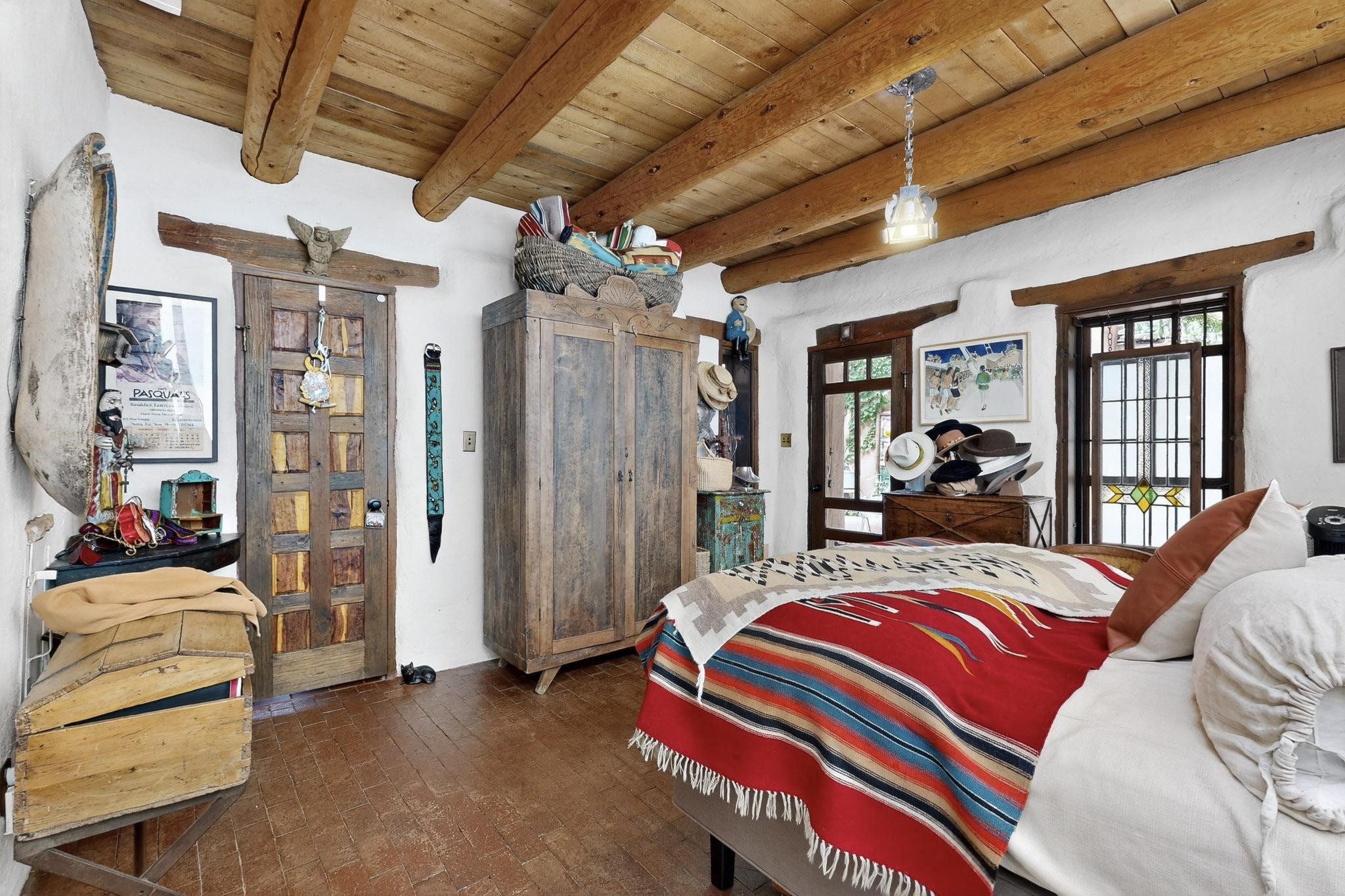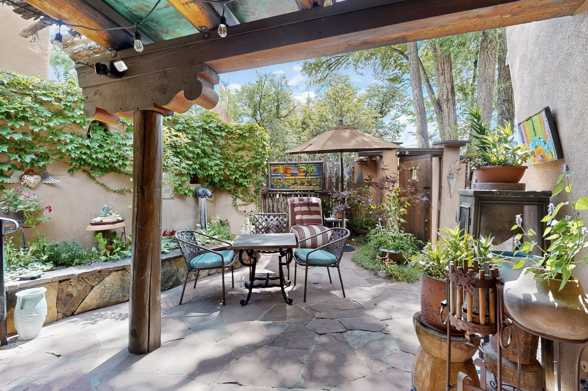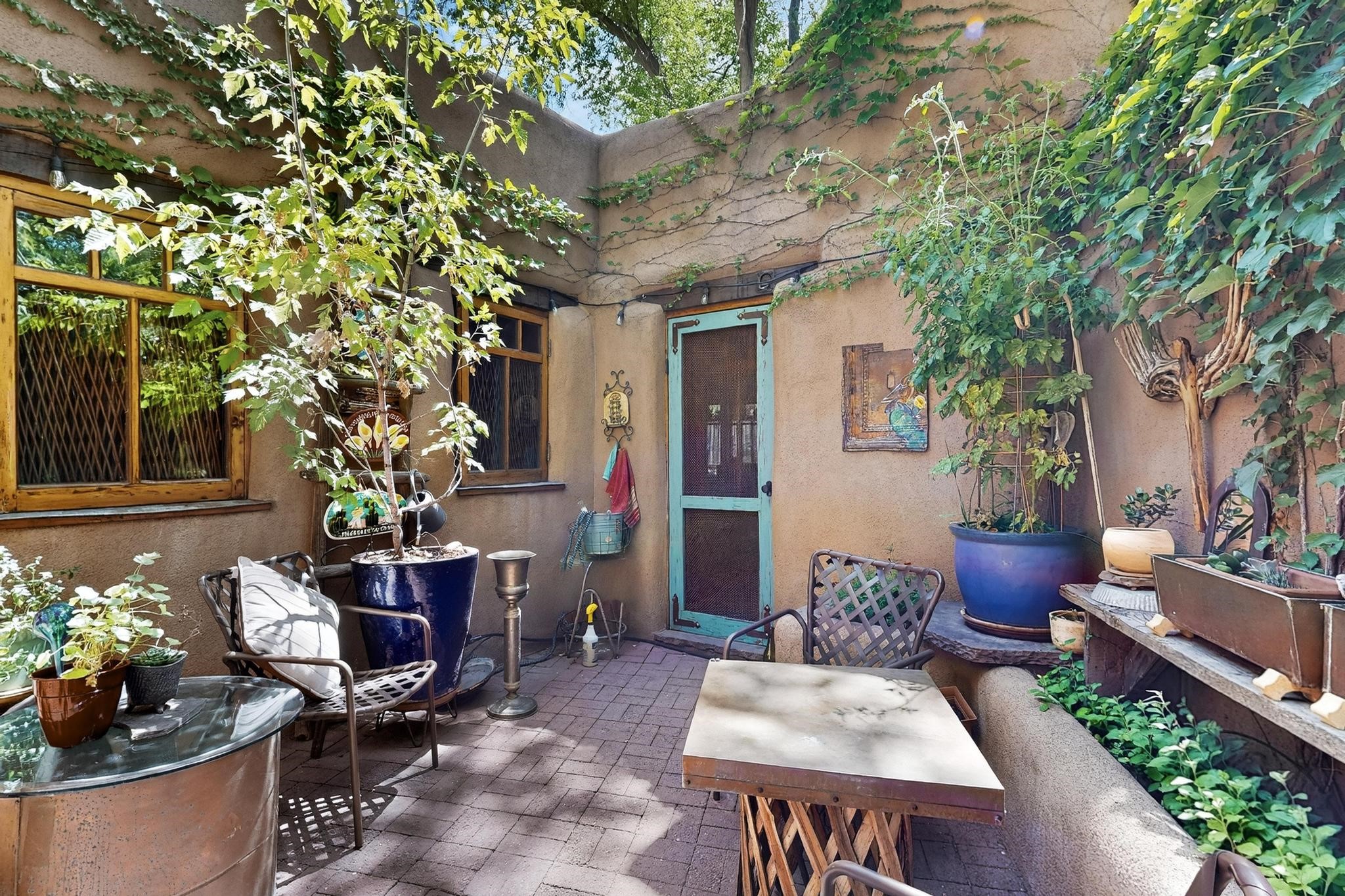One of the first homes to be built in this fascinating compound known as the Llano Adobe Compound, was built partially over the site of a one time iconic Santa Fe pub and is adjacent to an old farmhouse. The developer and builder, Phill Hawse, a student of Frank Lloyd Wright at Taliesin West, built these homes using traditional materials and methods to recreate the style and feel of a bygone era of adobe built homes with simple interiors, handcrafted wooden doors, windows and cabinets, brick floors, tree trunk roof supports (vigas) and flagstone courtyards. This sweet 2 bedroom, 2 bath home has been updated with a newer kitchen, bathrooms and plumbing, but otherwise retains much of the charm and spirit of Phill. He recently personally gave the seller original construction photographs that will be given to the next owner. The open plan kitchen and living room are illuminated with a 'wall washer' skylight that runs the width of the house along the back wall providing ample natural light. The fireplace in the living room makes for cozy evenings around the hearth. The entry courtyard charms with garden planters, adobe walls, a unique entry gate and shade from towering elms. Outside is the main parking space directly accessible off E. Palace. 2 back gates also access the property from the nearby secondary parking reached by a winding flagstone pathway. 5 year old brie roof with transferable warranty. Downtown Santa Fe and the iconic Canyon Road are just a short distance from this romantic hideaway.