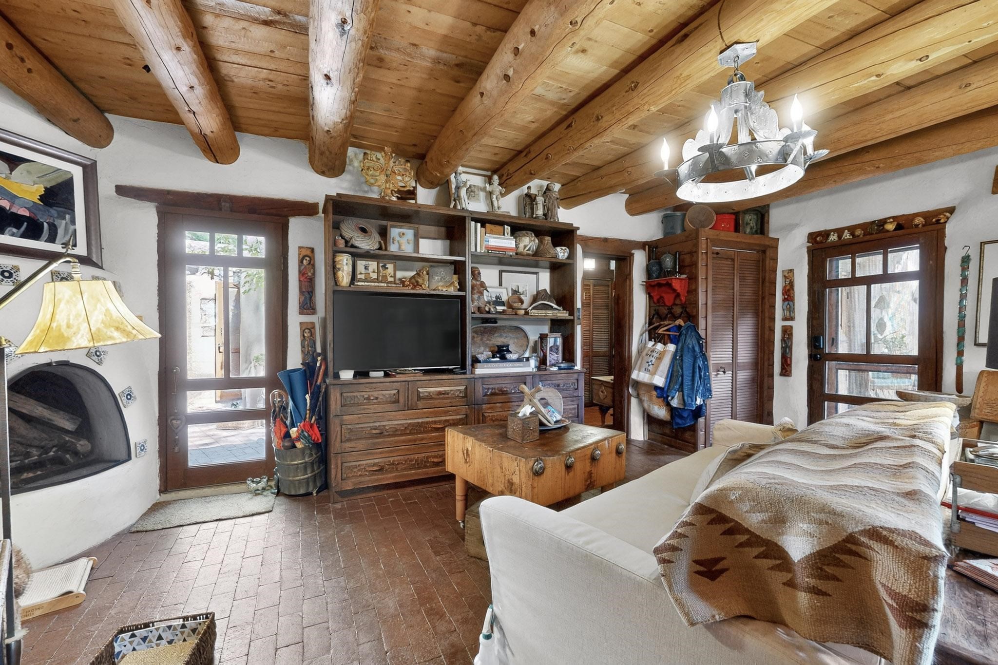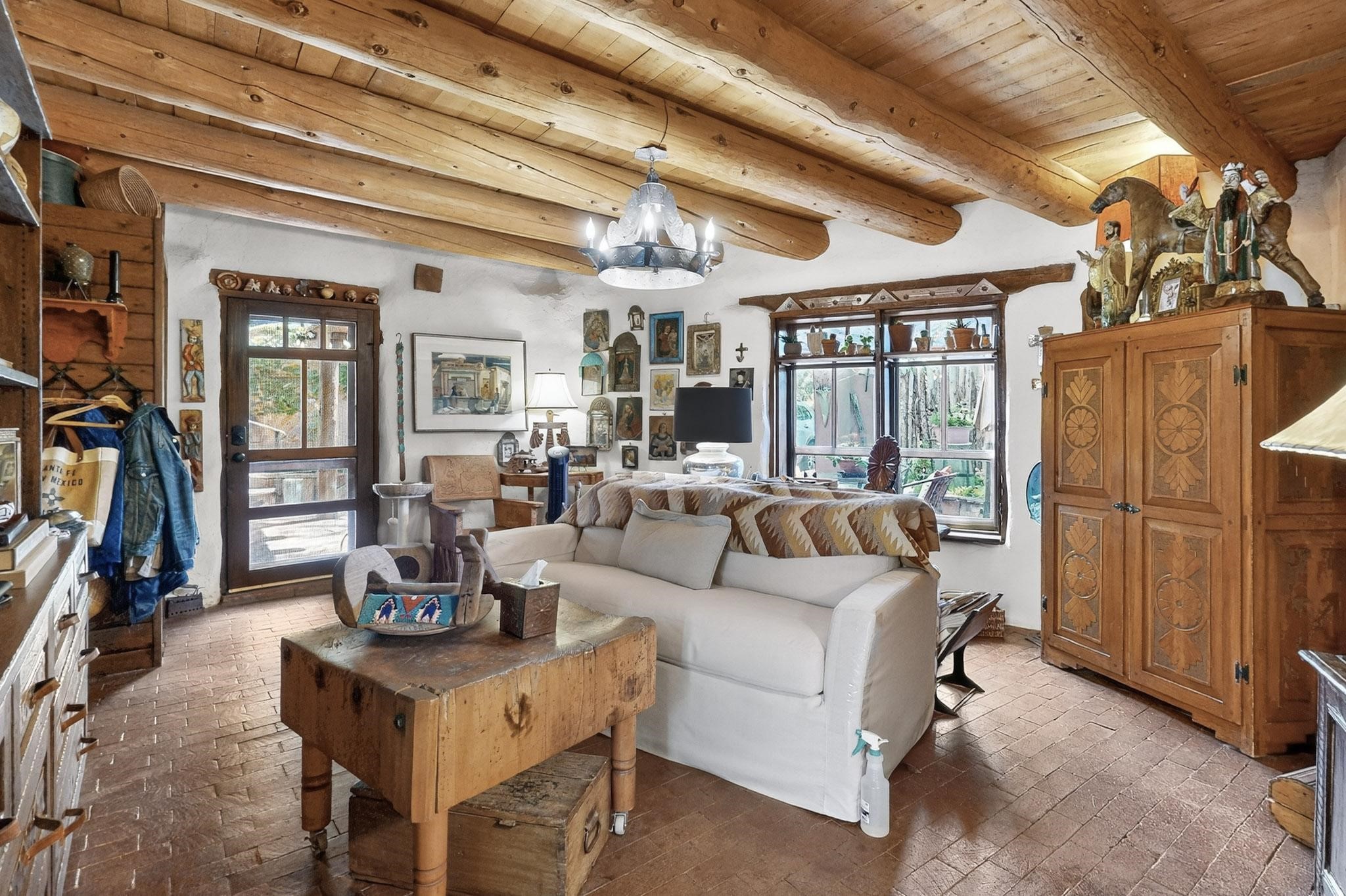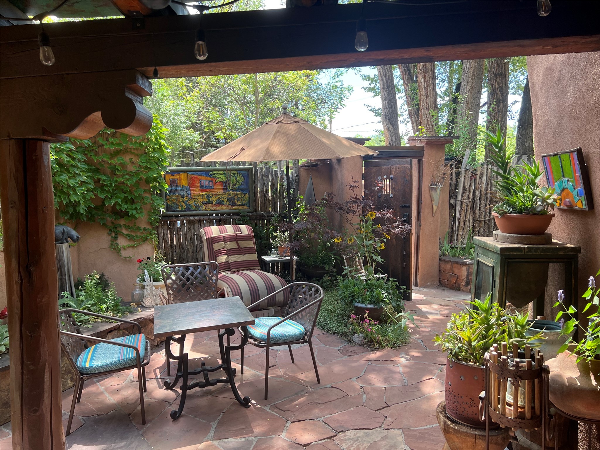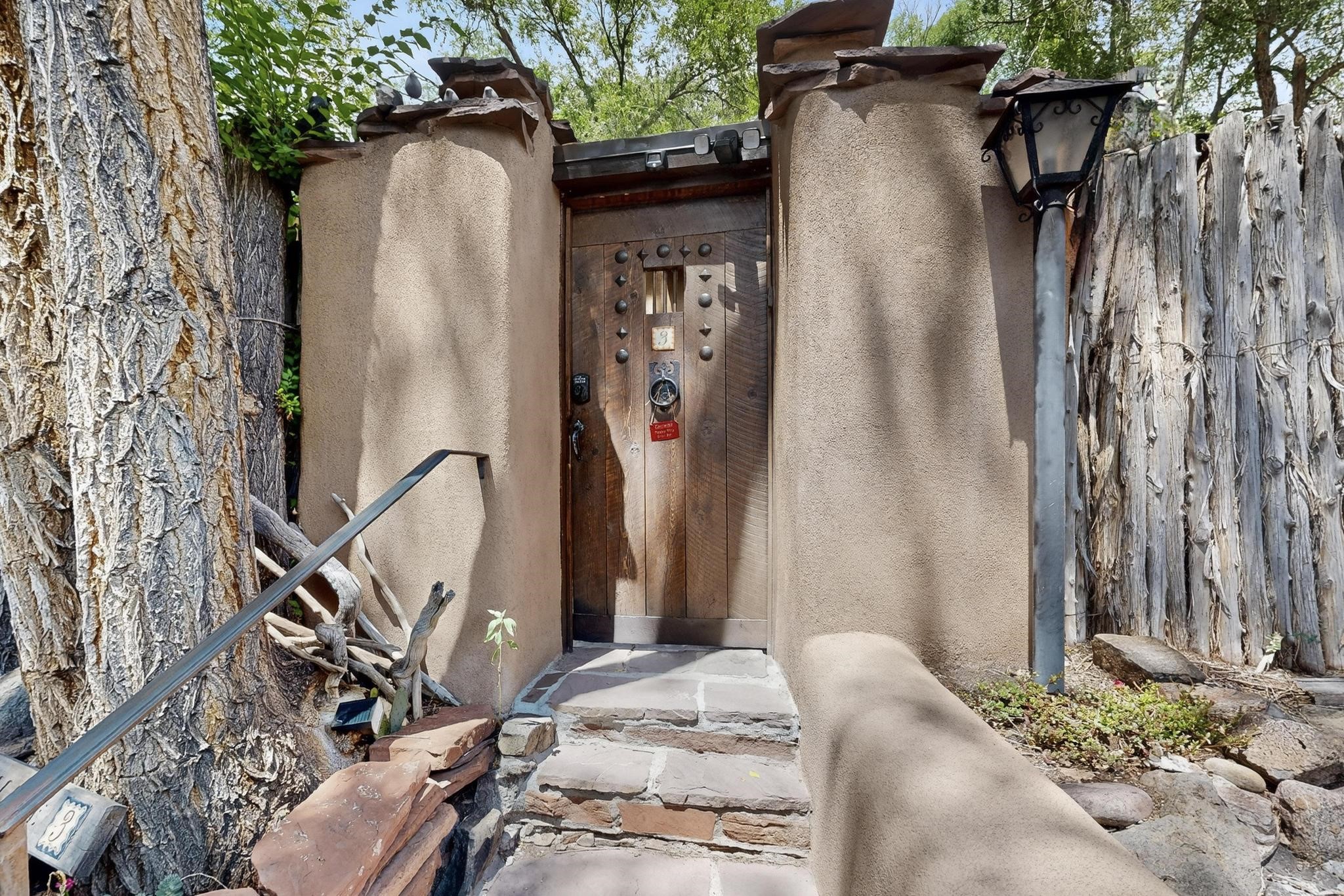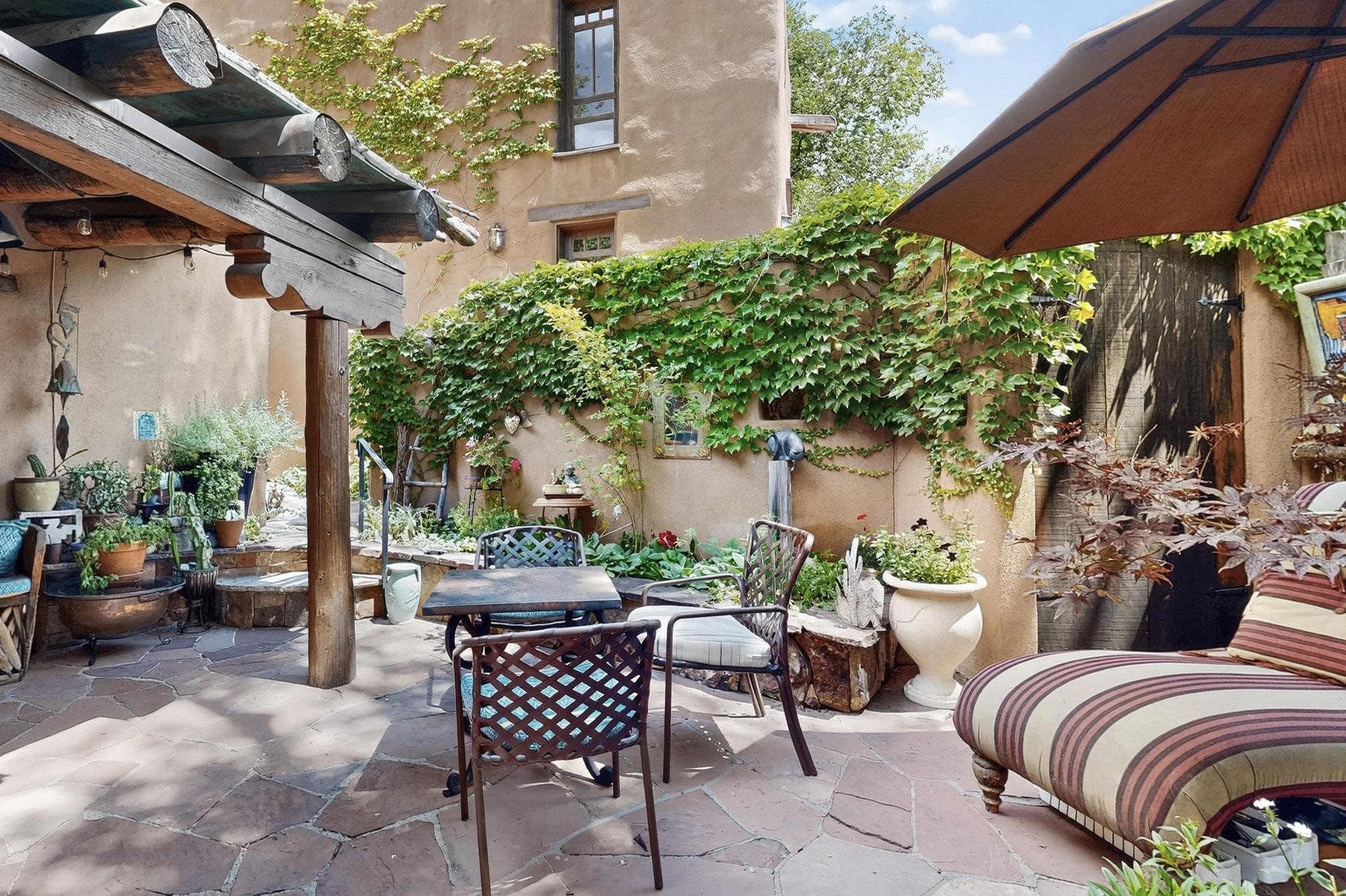 One of the first homes to be built in this fascinating compound known as the Llano Adobe Compound, was built partially over the site of a one time iconic Santa Fe pub and is adjacent to an old farmhouse. The developer and builder, Phill Hawse, a student of Frank Lloyd Wright at Taliesin West, built these homes using traditional materials and methods to recreate the style and feel of a bygone era of adobe built homes with simple interiors, handcrafted wooden doors, windows and cabinets, brick floors, tree trunk roof supports (vigas) and flagstone courtyards. This sweet 2 bedroom, 2 bath home has been updated with a newer kitchen, bathrooms and plumbing, but otherwise retains much of the charm and spirit of Phill. He recently personally gave the seller original construction photographs that will be given to the next owner. The open plan kitchen and living room are illuminated with a 'wall washer' skylight that runs the width of the house along the back wall providing ample natural light. The fireplace in the living room makes for cozy evenings around the hearth. The entry courtyard charms with garden planters, adobe walls, a unique entry gate and shade from towering elms. Outside is the main parking space directly accessible off E. Palace. 2 back gates also access the property from the nearby secondary parking reached by a winding flagstone pathway. 5 year old brie roof with transferable warranty. Downtown Santa Fe and the iconic Canyon Road are just a short distance from this romantic hideaway.