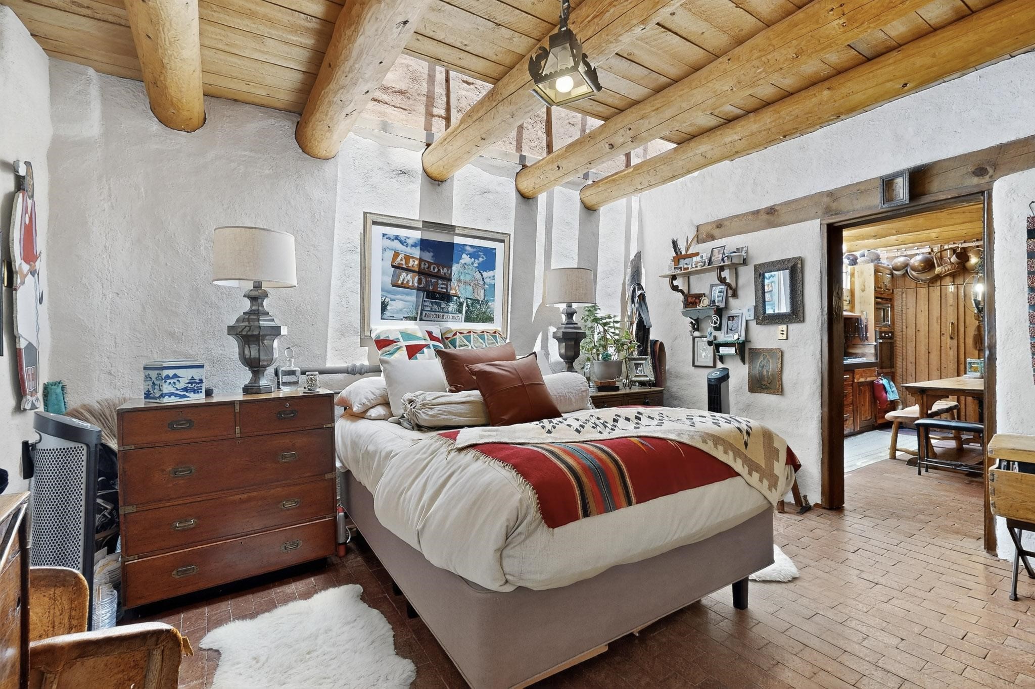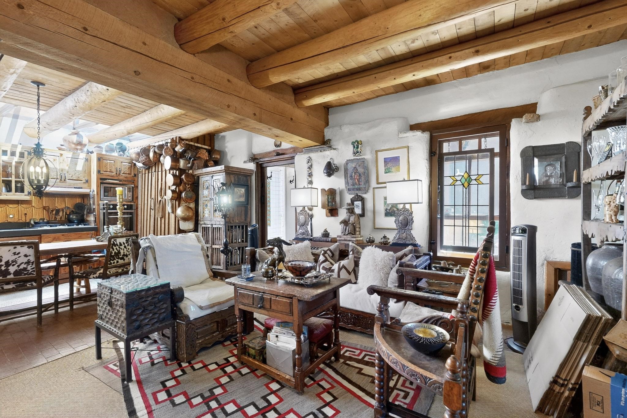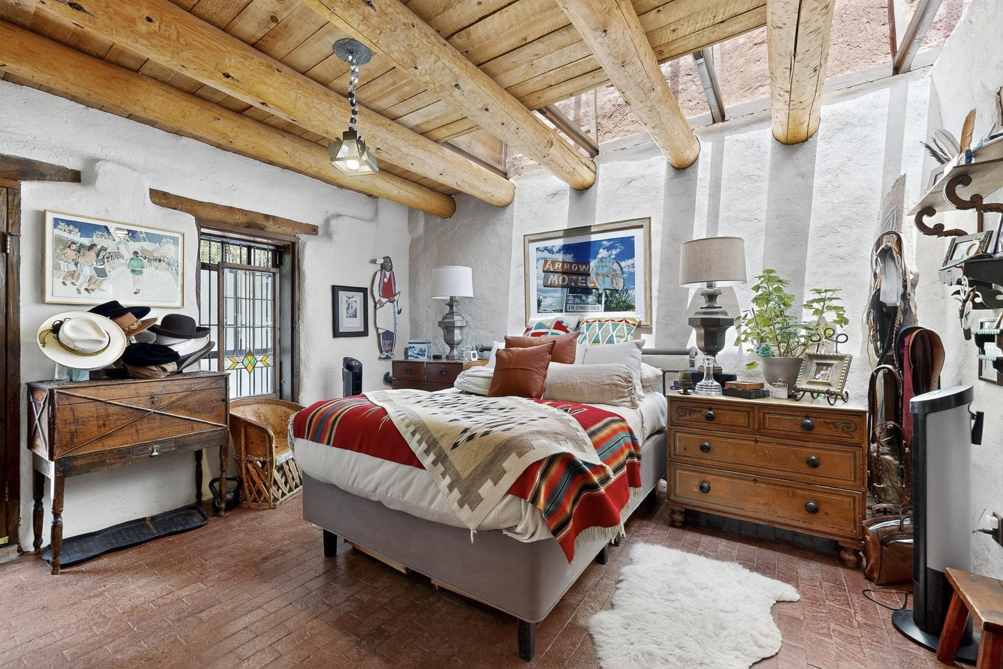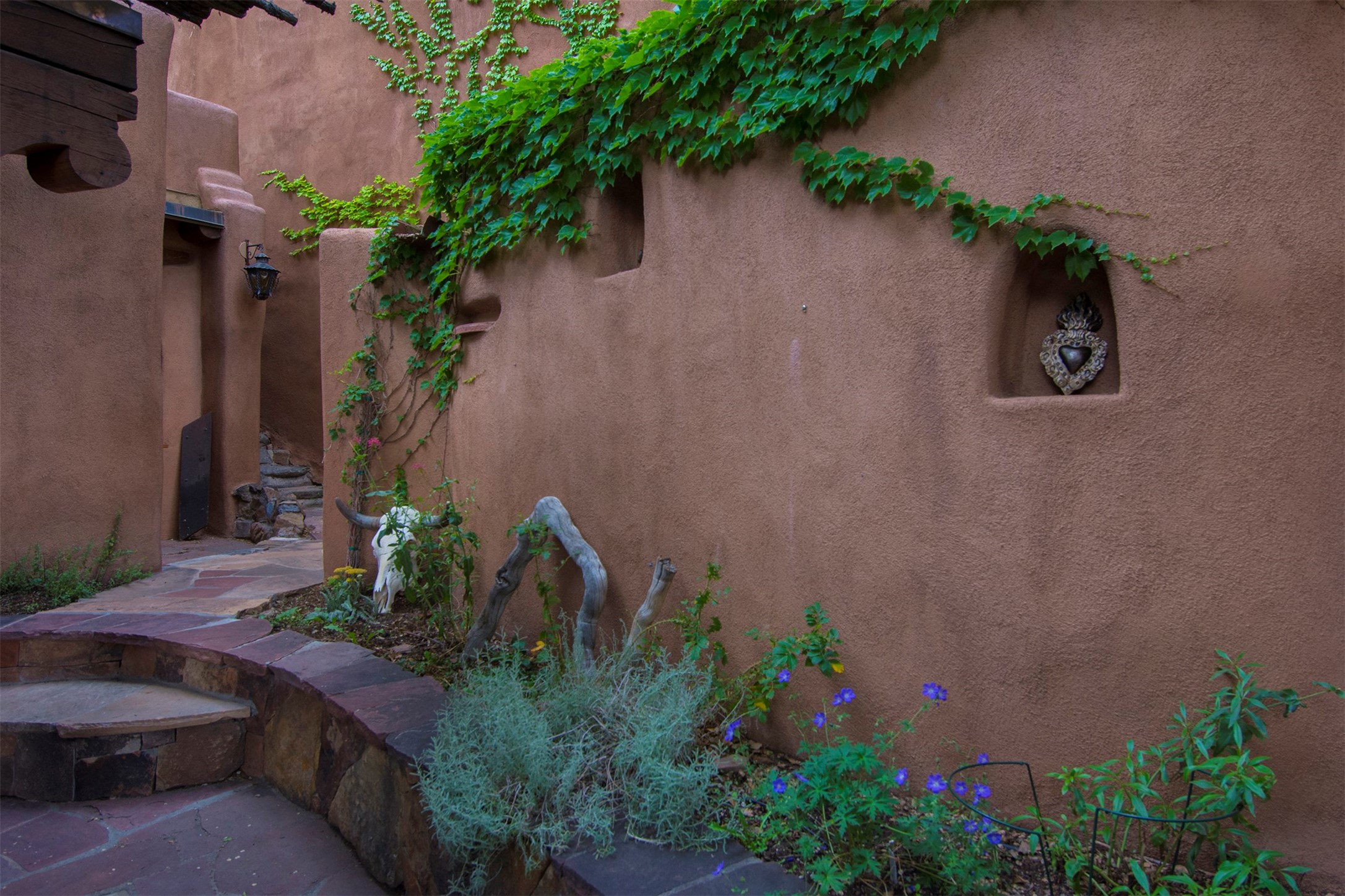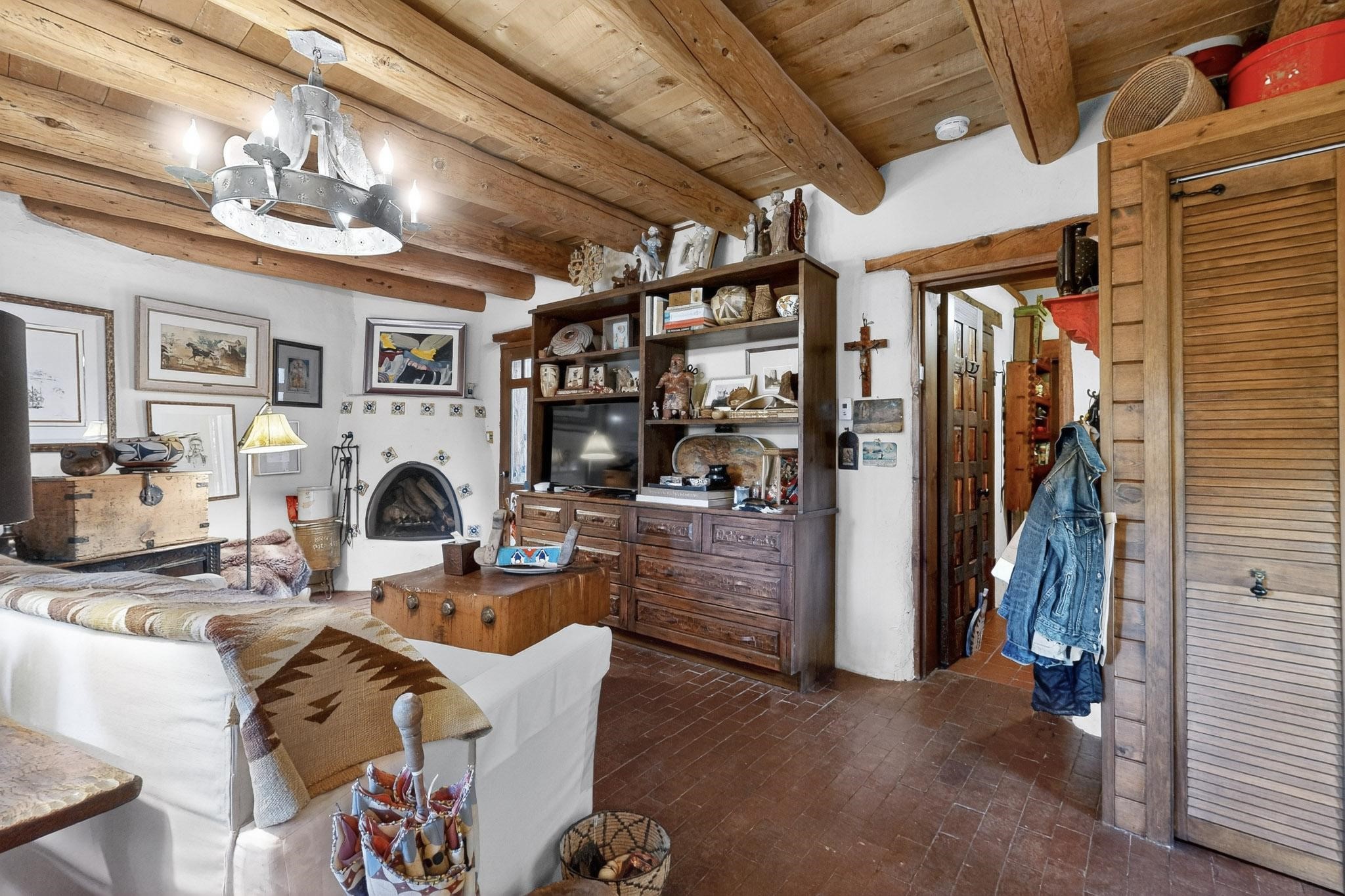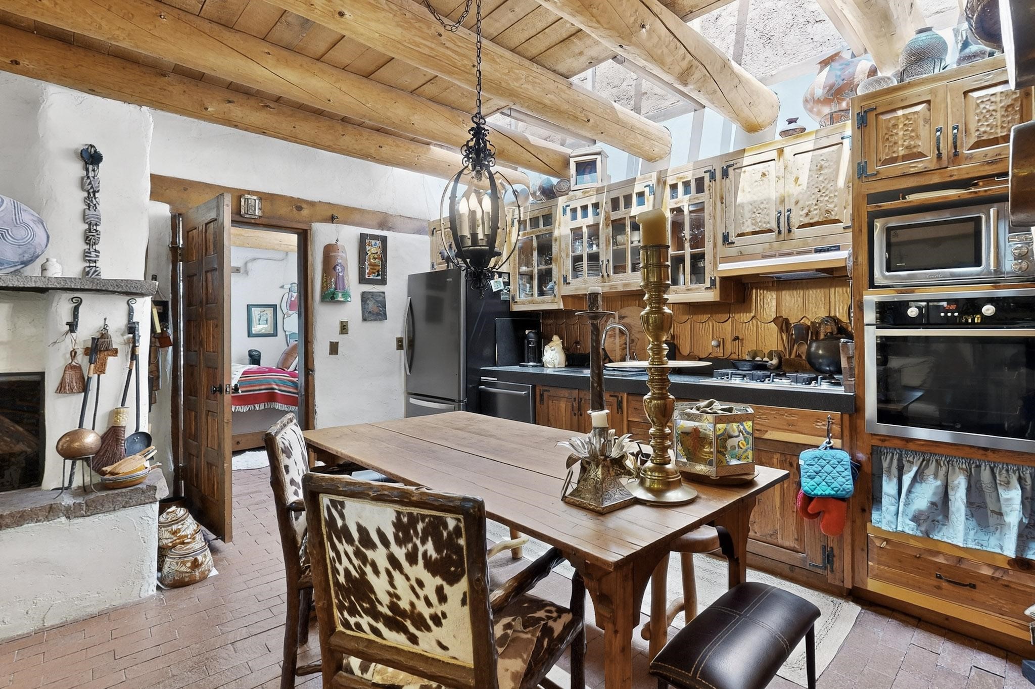 One of the first homes to be built in this fascinating compound known as the Llano Adobe Compound, was built partially over the site of a one time iconic Santa Fe pub and is adjacent to an old farmhouse. The developer and builder, Phill Hawse, a student of Frank Lloyd Wright at Taliesin West, built these homes using traditional materials and methods to recreate the style and feel of a bygone era of adobe built homes with simple interiors, handcrafted wooden doors, windows and cabinets, brick floors, tree trunk roof supports (vigas) and flagstone courtyards. This sweet 2 bedroom, 2 bath home has been updated with a newer kitchen, bathrooms and plumbing, but otherwise retains much of the charm and spirit of Phill. He recently personally gave the seller original construction photographs that will be given to the next owner. The open plan kitchen and living room are illuminated with a 'wall washer' skylight that runs the width of the house along the back wall providing ample natural light. The fireplace in the living room makes for cozy evenings around the hearth. The entry courtyard charms with garden planters, adobe walls, a unique entry gate and shade from towering elms. Outside is the main parking space directly accessible off E. Palace. 2 back gates also access the property from the nearby secondary parking reached by a winding flagstone pathway. 5 year old brie roof with transferable warranty. Downtown Santa Fe and the iconic Canyon Road are just a short distance from this romantic hideaway.