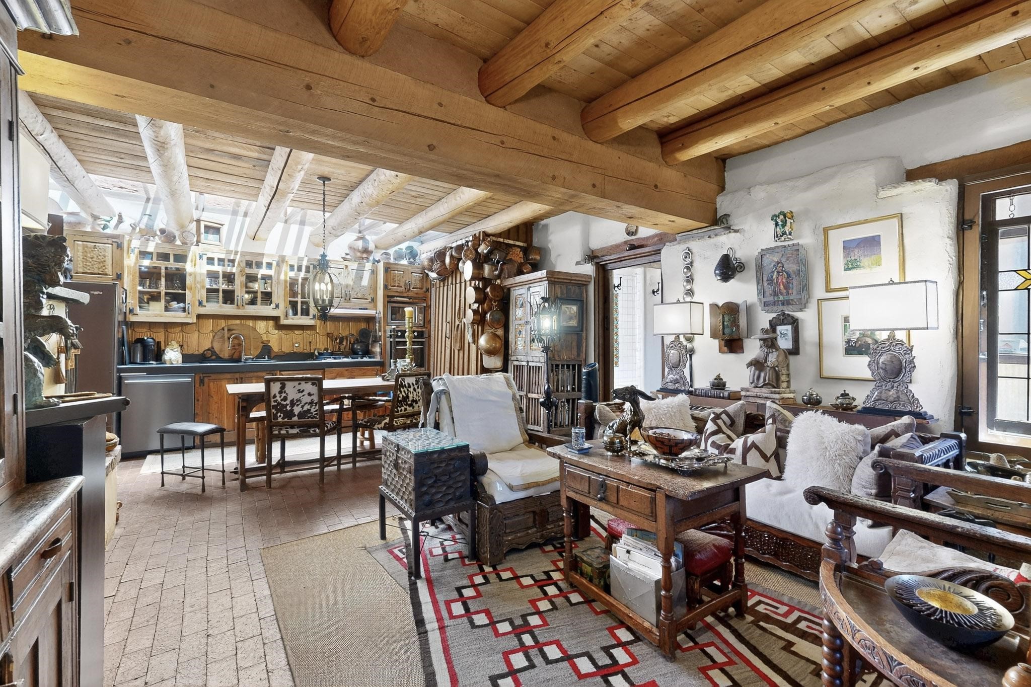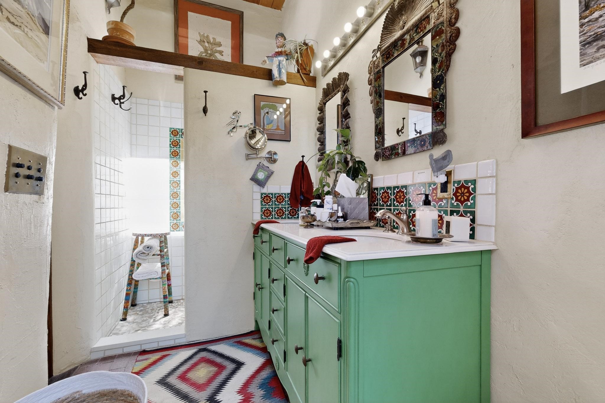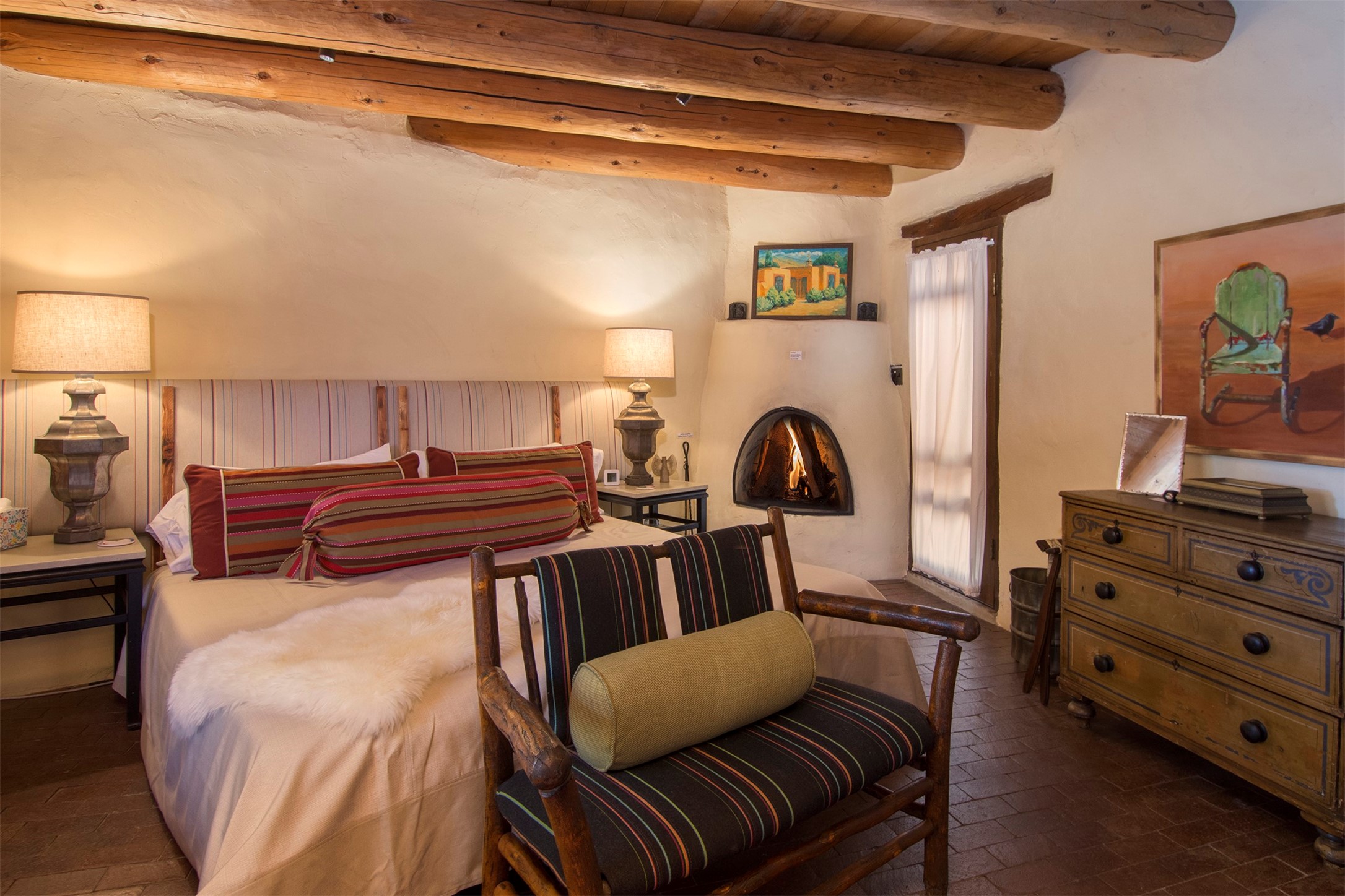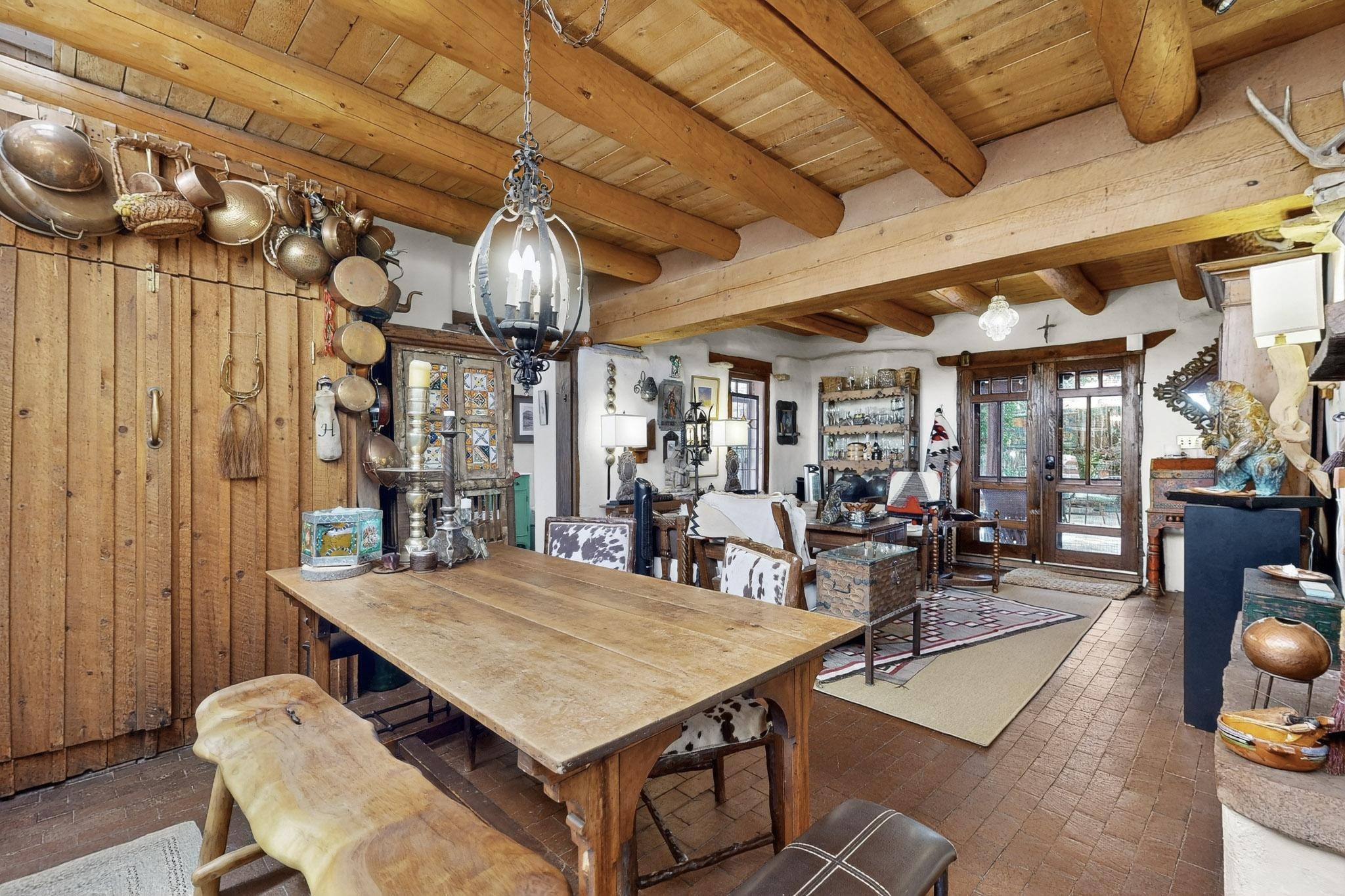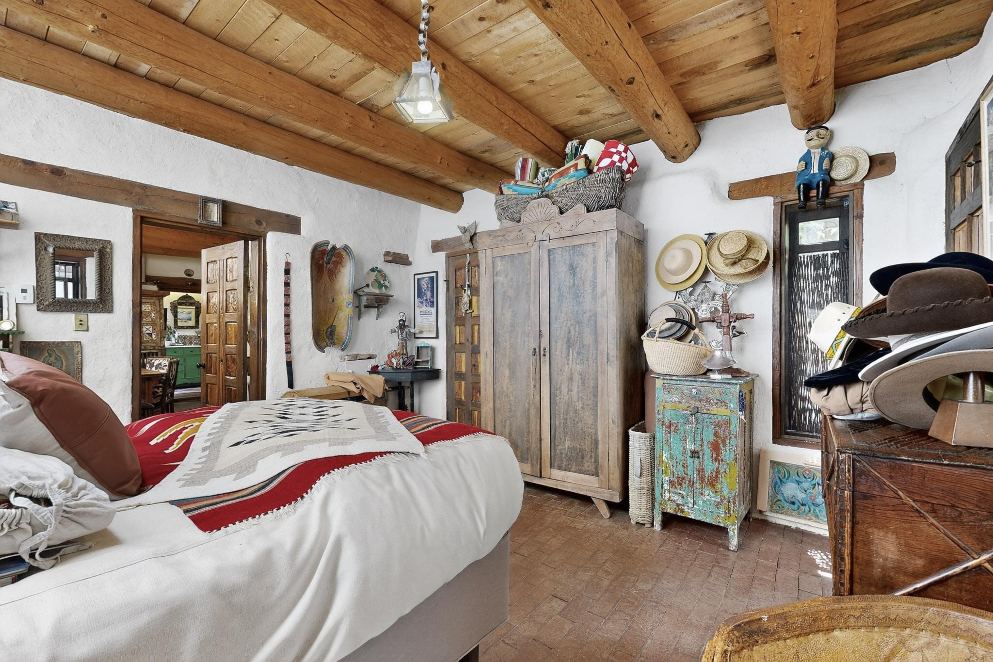 One of the first homes to be built in this fascinating compound known as the Llano Adobe Compound, was built partially over the site of a one time iconic Santa Fe pub and is adjacent to an old farmhouse. The developer and builder, Phill Hawse, a student of Frank Lloyd Wright at Taliesin West, built these homes using traditional materials and methods to recreate the style and feel of a bygone era of adobe built homes with simple interiors, handcrafted wooden doors, windows and cabinets, brick floors, tree trunk roof supports (vigas) and flagstone courtyards. This sweet 2 bedroom, 2 bath home has been updated with a newer kitchen, bathrooms and plumbing, but otherwise retains much of the charm and spirit of Phill. He recently personally gave the seller original construction photographs that will be given to the next owner. The open plan kitchen and living room are illuminated with a 'wall washer' skylight that runs the width of the house along the back wall providing ample natural light. The fireplace in the living room makes for cozy evenings around the hearth. The entry courtyard charms with garden planters, adobe walls, a unique entry gate and shade from towering elms. Outside is the main parking space directly accessible off E. Palace. 2 back gates also access the property from the nearby secondary parking reached by a winding flagstone pathway. 5 year old brie roof with transferable warranty. Downtown Santa Fe and the iconic Canyon Road are just a short distance from this romantic hideaway.