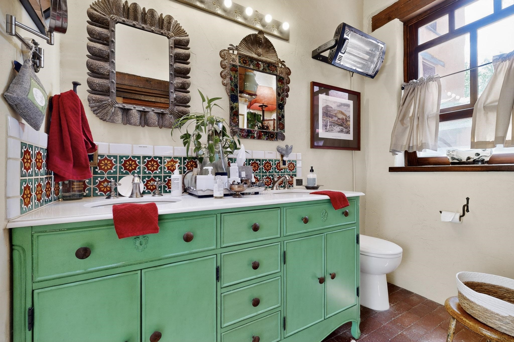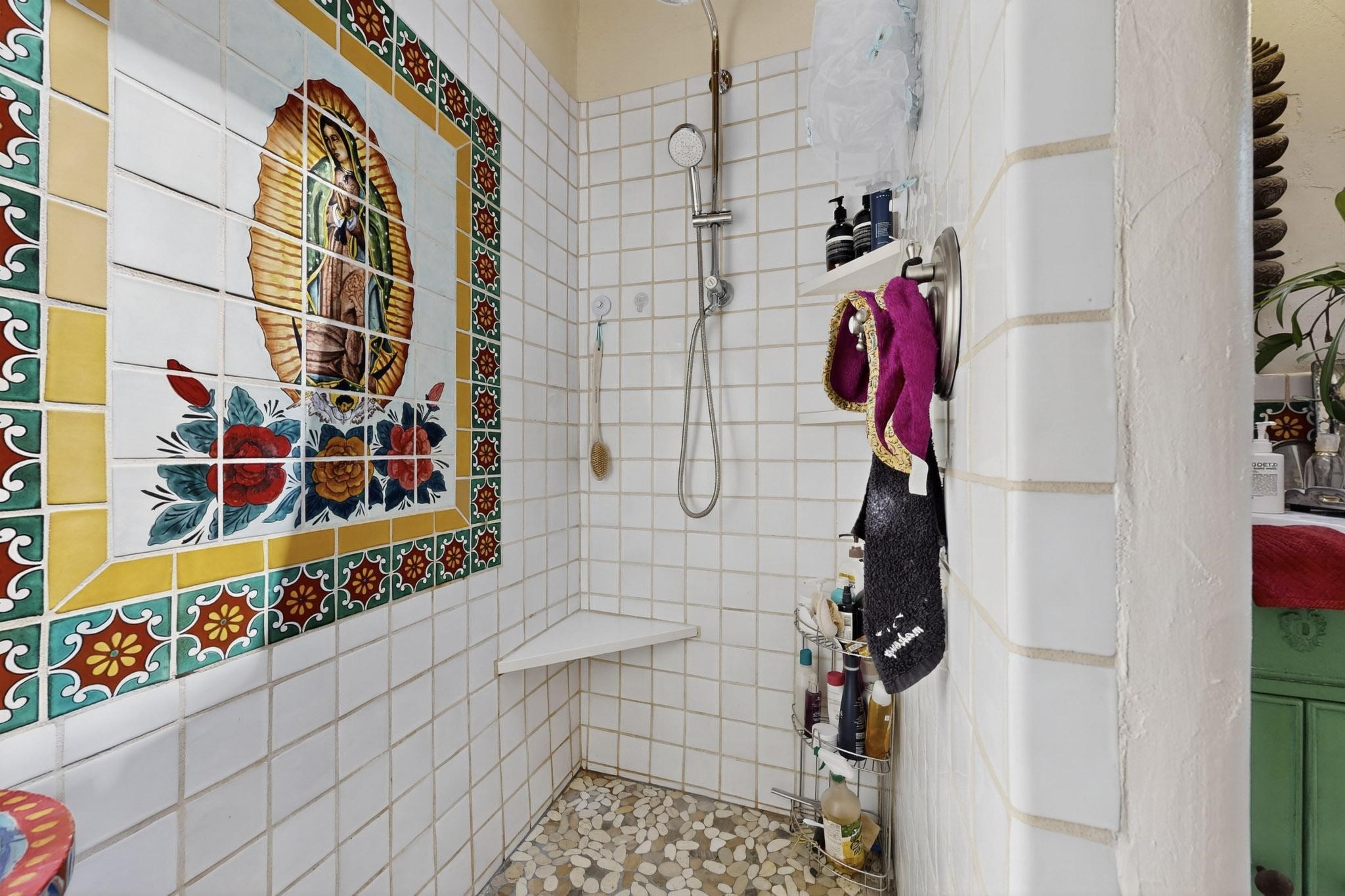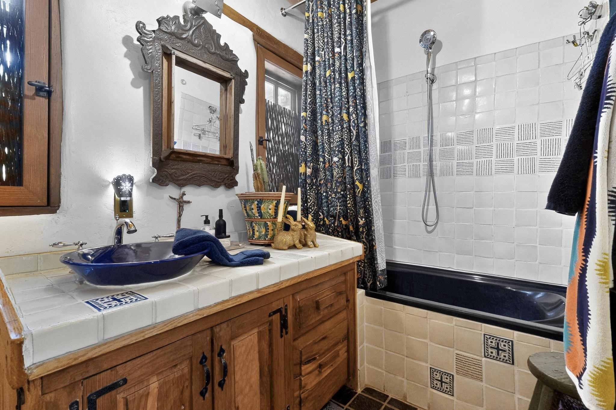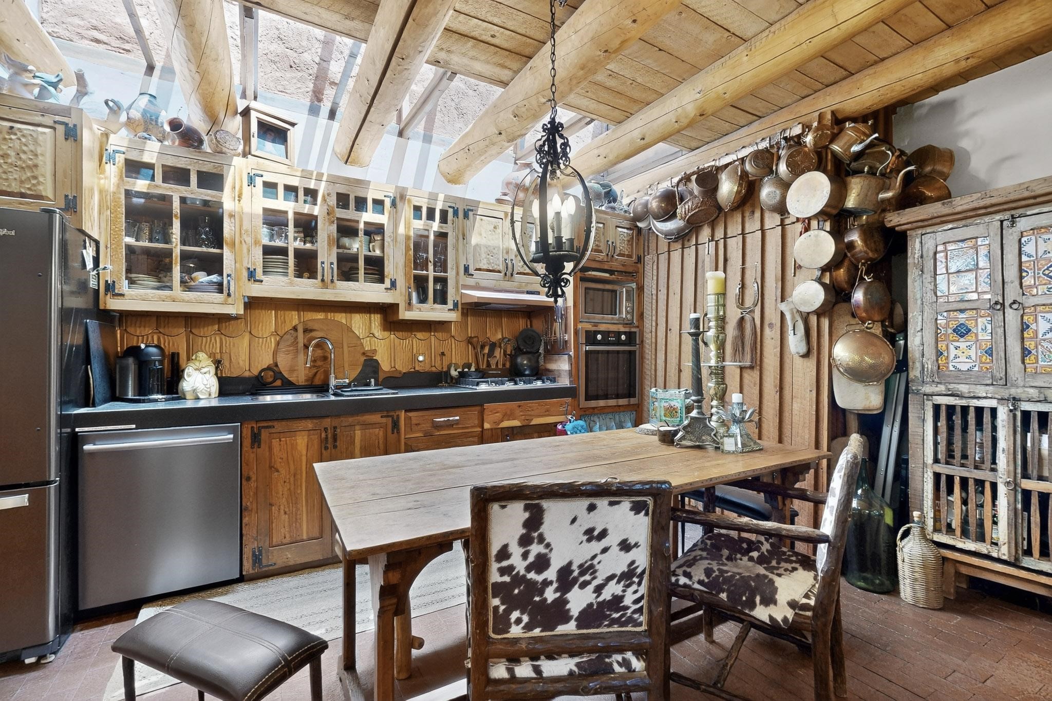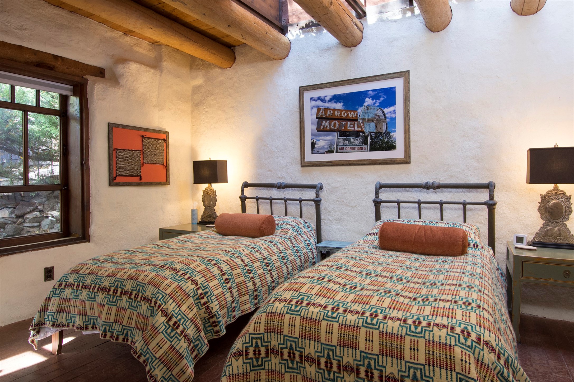 One of the first homes to be built in this fascinating compound known as the Llano Adobe Compound, was built partially over the site of a one time iconic Santa Fe pub and is adjacent to an old farmhouse. The developer and builder, Phill Hawse, a student of Frank Lloyd Wright at Taliesin West, built these homes using traditional materials and methods to recreate the style and feel of a bygone era of adobe built homes with simple interiors, handcrafted wooden doors, windows and cabinets, brick floors, tree trunk roof supports (vigas) and flagstone courtyards. This sweet 2 bedroom, 2 bath home has been updated with a newer kitchen, bathrooms and plumbing, but otherwise retains much of the charm and spirit of Phill. He recently personally gave the seller original construction photographs that will be given to the next owner. The open plan kitchen and living room are illuminated with a 'wall washer' skylight that runs the width of the house along the back wall providing ample natural light. The fireplace in the living room makes for cozy evenings around the hearth. The entry courtyard charms with garden planters, adobe walls, a unique entry gate and shade from towering elms. Outside is the main parking space directly accessible off E. Palace. 2 back gates also access the property from the nearby secondary parking reached by a winding flagstone pathway. 5 year old brie roof with transferable warranty. Downtown Santa Fe and the iconic Canyon Road are just a short distance from this romantic hideaway.