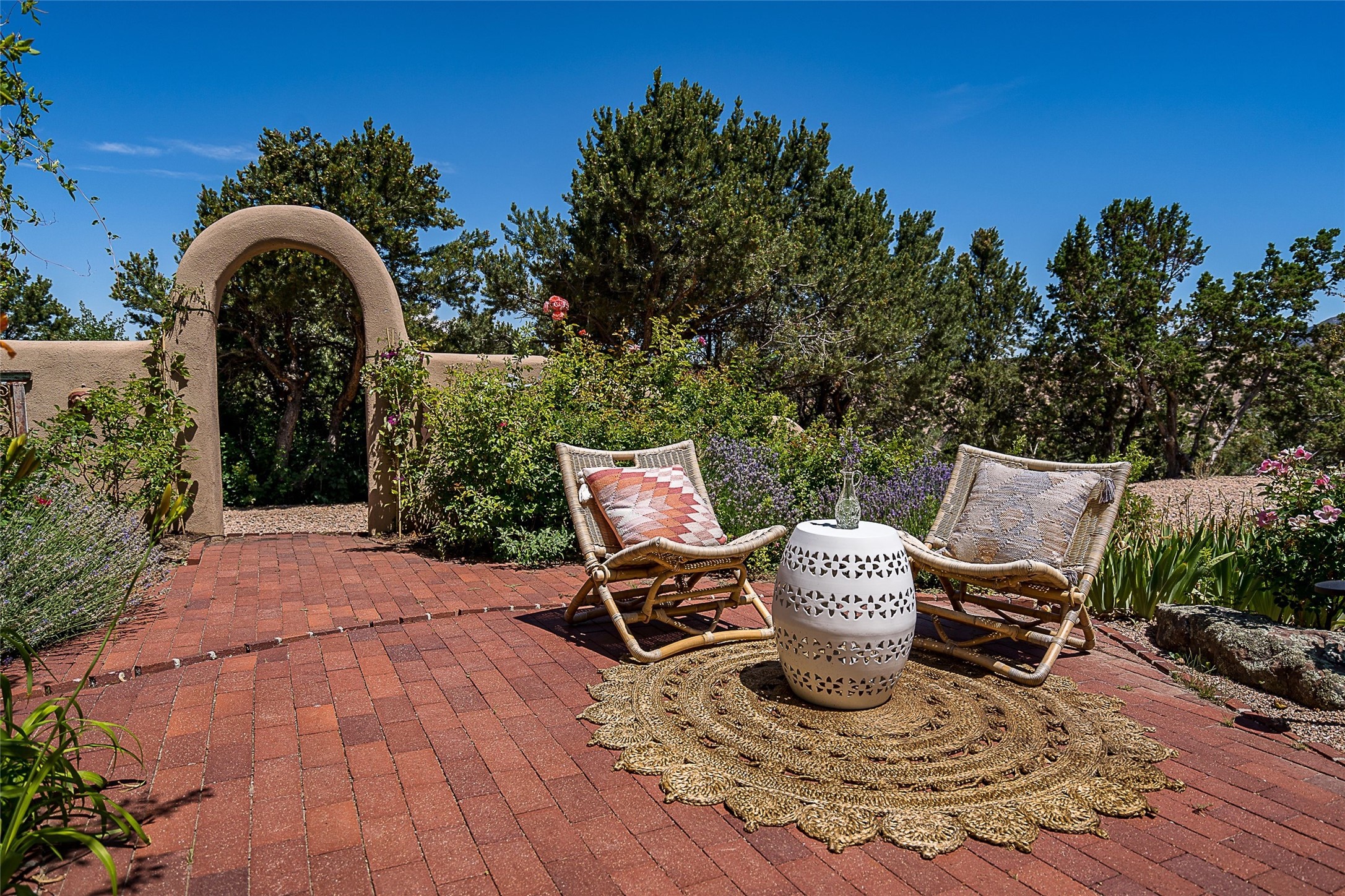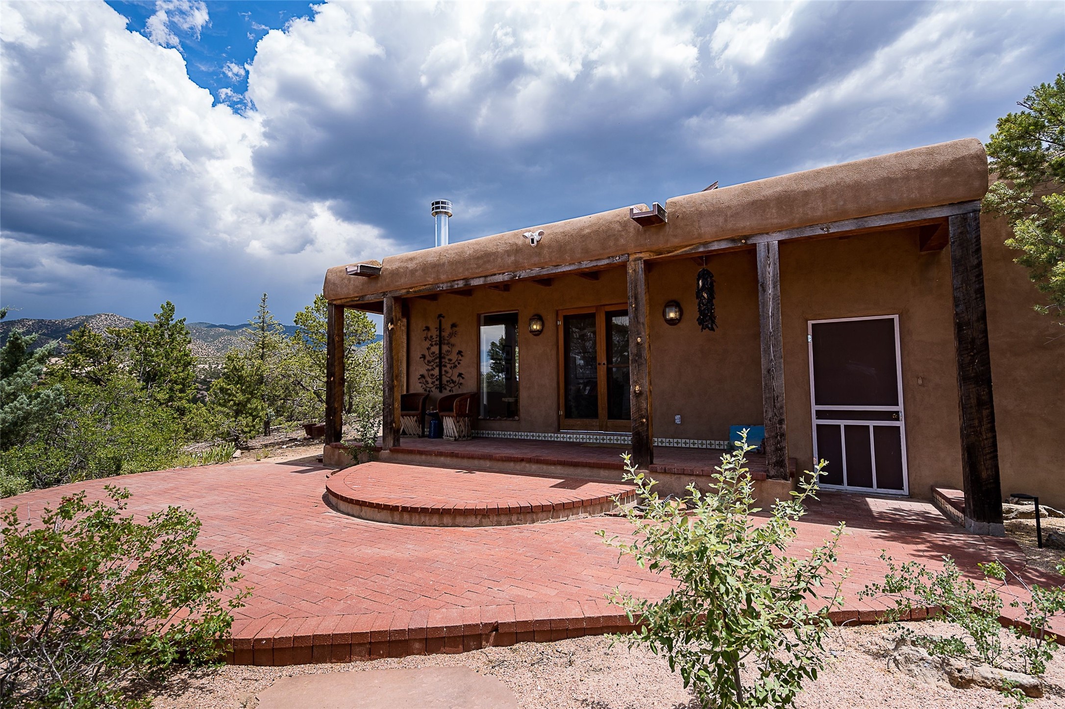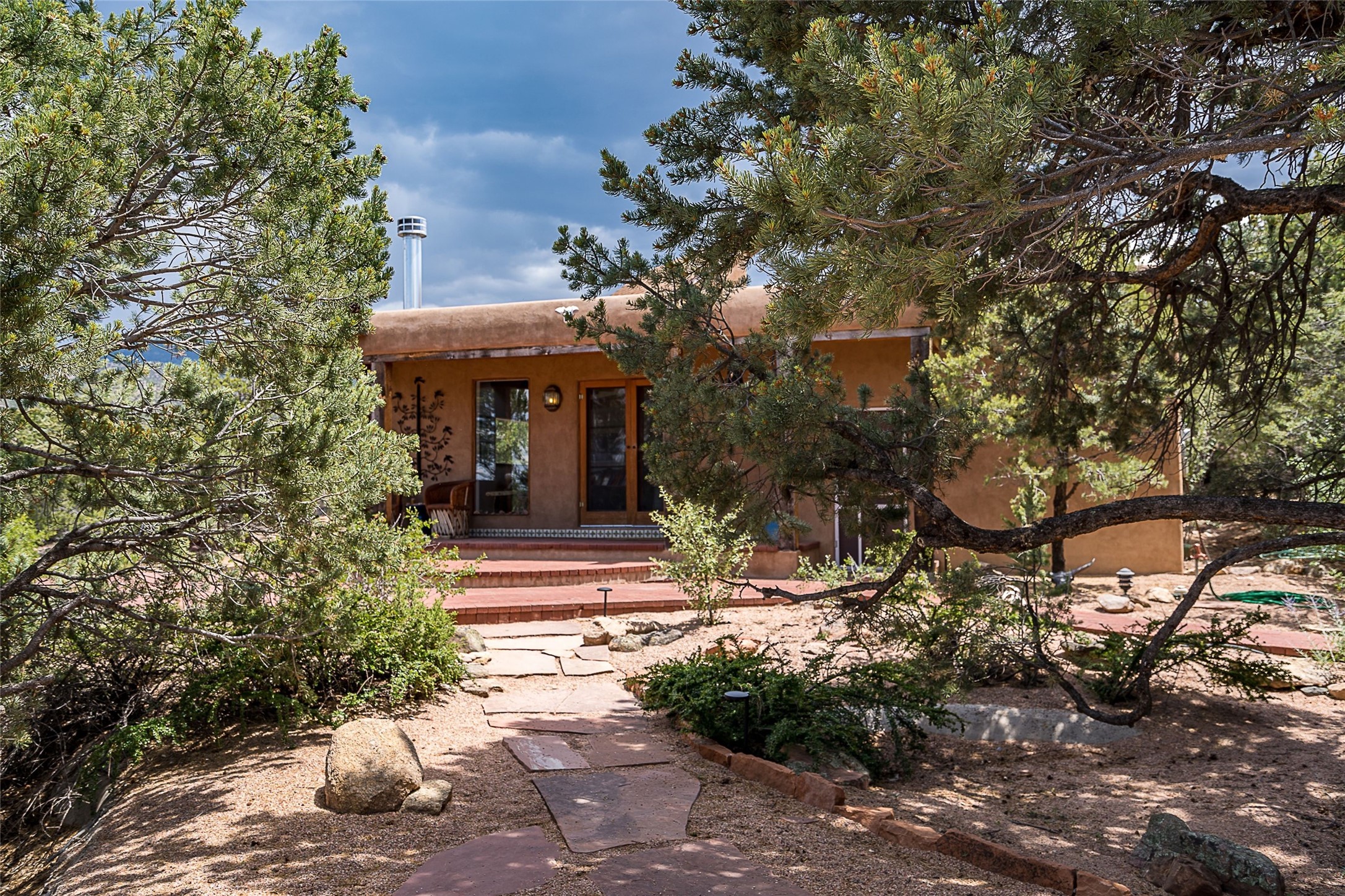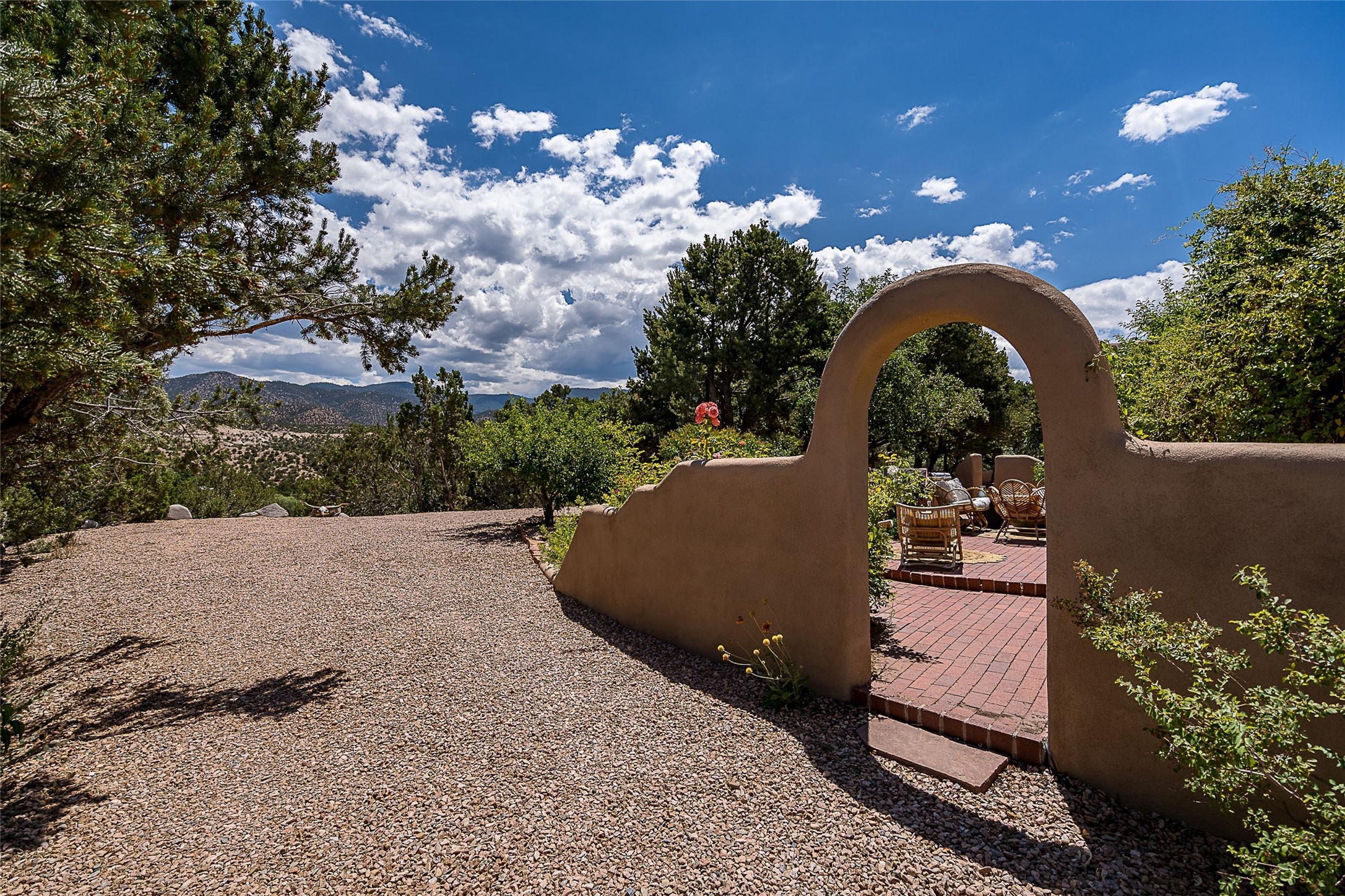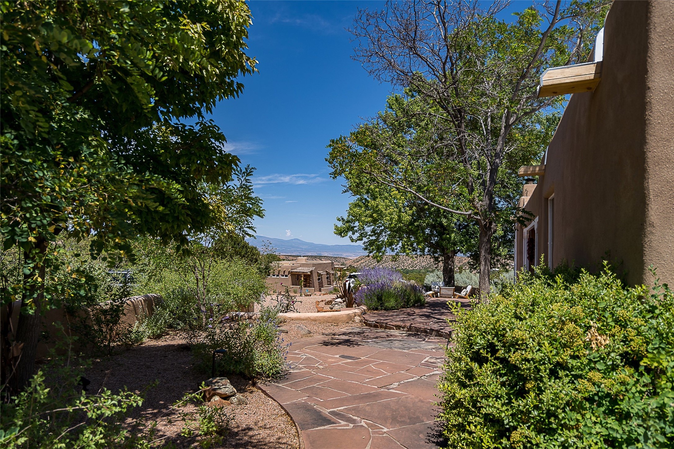 Discover serenity and style in the heart of Vista Redonda where the timeless beauty of Santa Fe-style architecture meets modern luxury in this stunningly remodeled home, set on over 5 acres of private land with awe-inspiring mountain vistas. Main residence boasts three bedrooms and two updated bathrooms. Classic vigas and beams, Saltillo tile and refinished wood floors that radiate Southwestern charm. Custom solid wood doors throughout speak to unmatched craftsmanship, while expansive picture windows bathe every room in natural light. The open-concept kitchen, is a masterpiece of design, blending vintage appliances with modern functionality. Thoughtful split bedroom plan offers privacy. In the primary suite luxury meets heritage with custom Spanish tiles enhancing the updated bathroom. Accommodate guests or tap into rental income potential with the 825 sq. ft casita, featuring one bedroom, a bath, 2 kiva fireplaces, and a kitchenette. Indulge your creative spirit in the 392 sq. ft art, wellness, or music studio. Outside, the grounds are designed with relaxation and natural beauty in mind. Whether soaking in the hot tub, enjoying evenings around the fire pit, or meandering through the labyrinth, you'll find countless ways to reconnect with nature. Mature fruit trees and flowering plants create a garden oasis. Located just moments from the Four Seasons Resort, Tesuque Village Market, Santa Fe Opera, and downtown Santa Fe, this home offers both seclusion and accessibility.