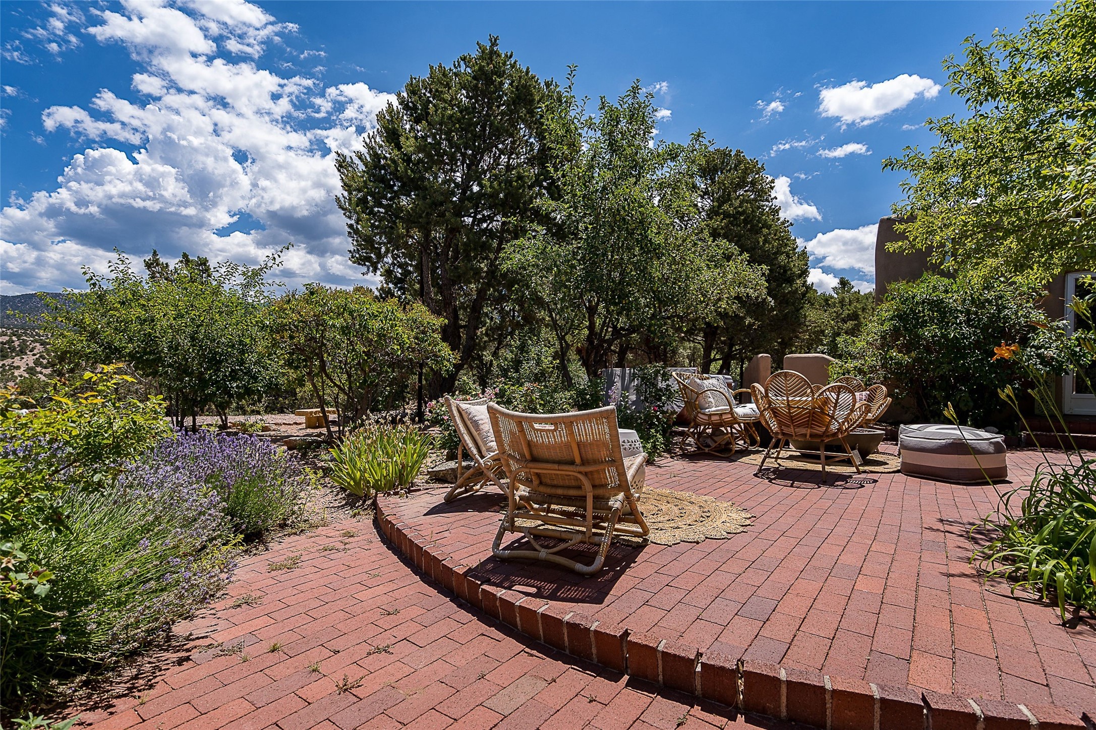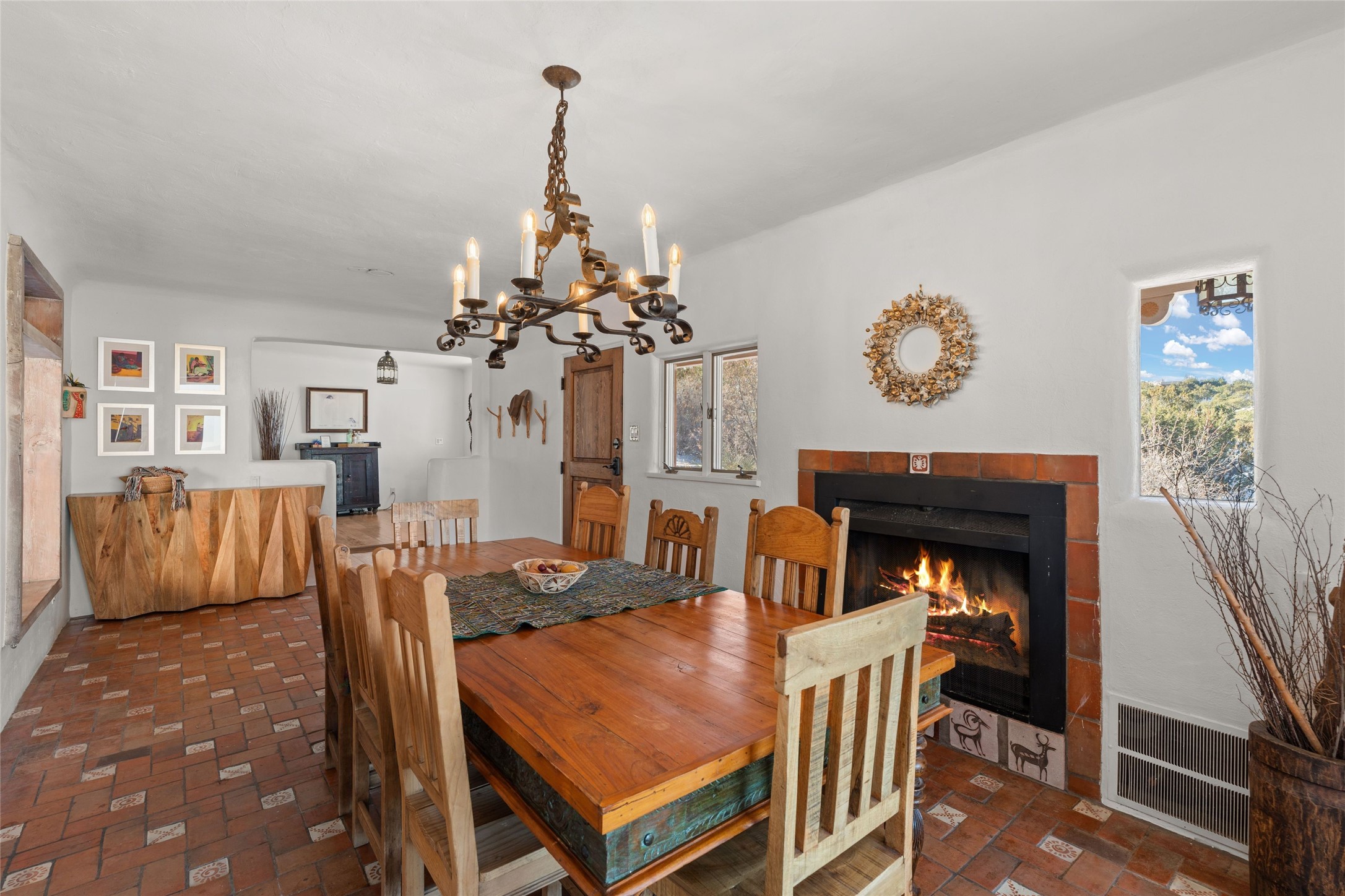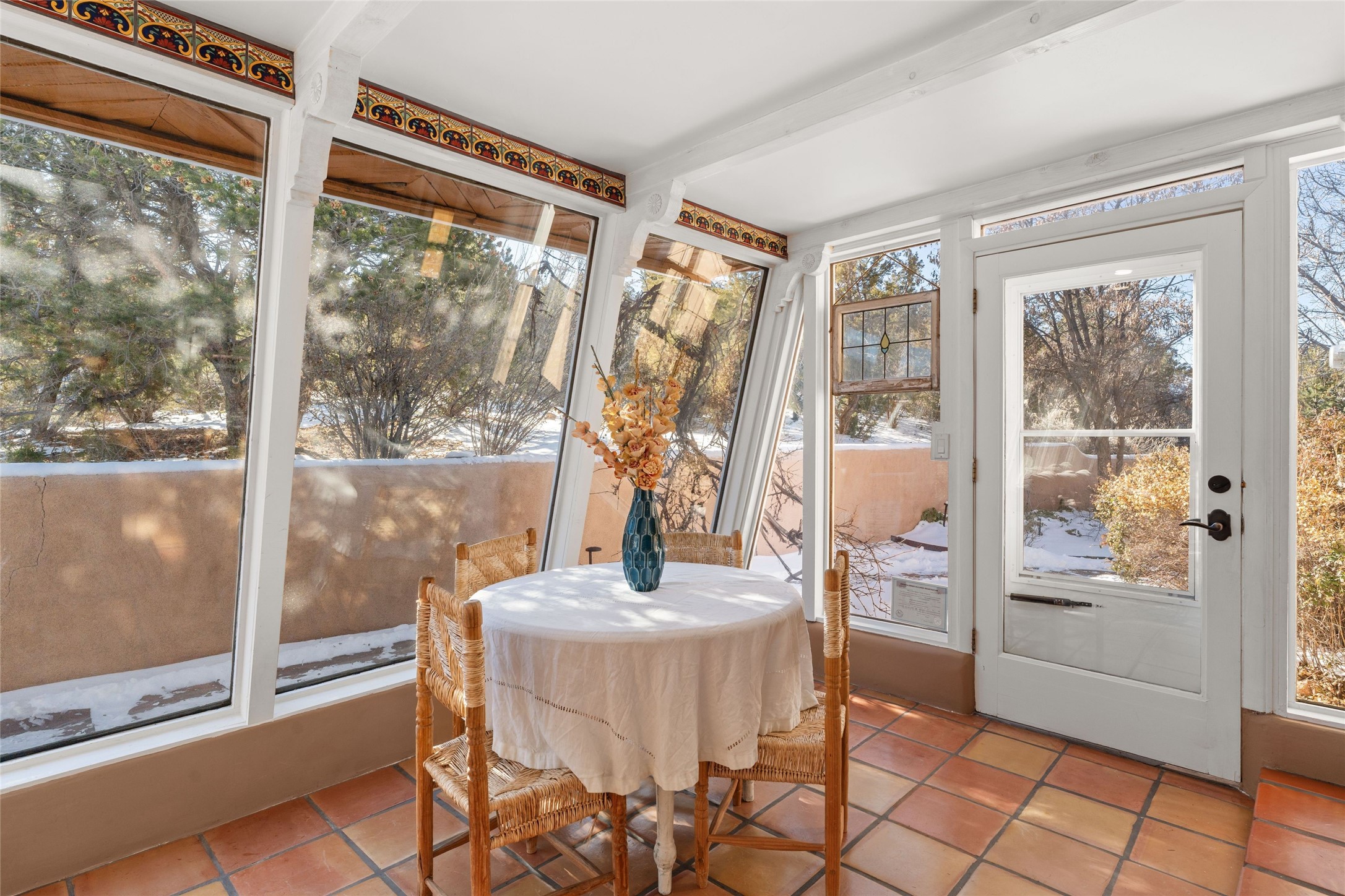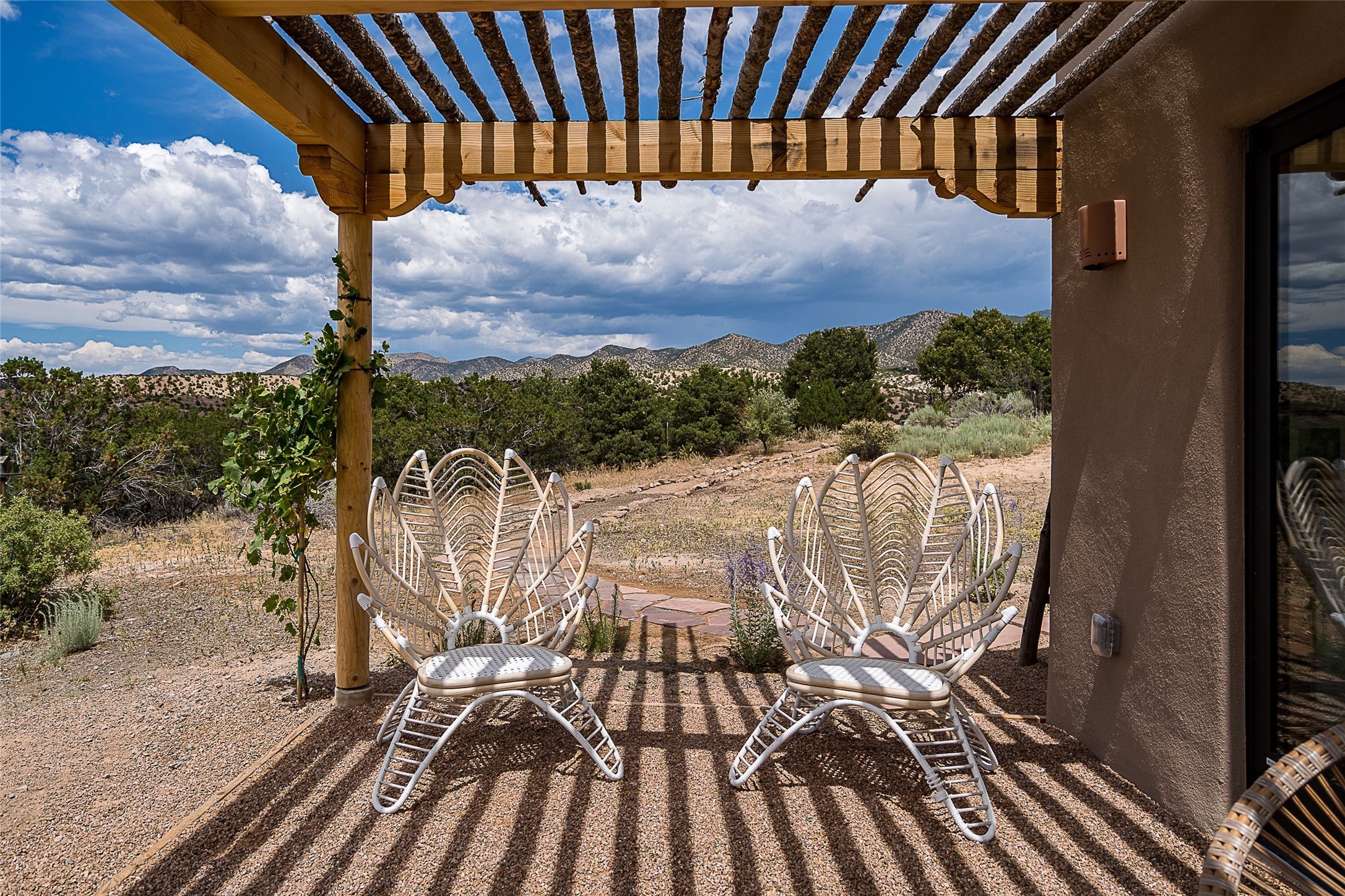 Discover serenity and style in the heart of Vista Redonda where the timeless beauty of Santa Fe-style architecture meets modern luxury in this stunningly remodeled home, set on over 5 acres of private land with awe-inspiring mountain vistas. Main residence boasts three bedrooms and two updated bathrooms. Classic vigas and beams, Saltillo tile and refinished wood floors that radiate Southwestern charm. Custom solid wood doors throughout speak to unmatched craftsmanship, while expansive picture windows bathe every room in natural light. The open-concept kitchen, is a masterpiece of design, blending vintage appliances with modern functionality. Thoughtful split bedroom plan offers privacy. In the primary suite luxury meets heritage with custom Spanish tiles enhancing the updated bathroom. Accommodate guests or tap into rental income potential with the 825 sq. ft casita, featuring one bedroom, a bath, 2 kiva fireplaces, and a kitchenette. Indulge your creative spirit in the 392 sq. ft art, wellness, or music studio. Outside, the grounds are designed with relaxation and natural beauty in mind. Whether soaking in the hot tub, enjoying evenings around the fire pit, or meandering through the labyrinth, you'll find countless ways to reconnect with nature. Mature fruit trees and flowering plants create a garden oasis. Located just moments from the Four Seasons Resort, Tesuque Village Market, Santa Fe Opera, and downtown Santa Fe, this home offers both seclusion and accessibility.