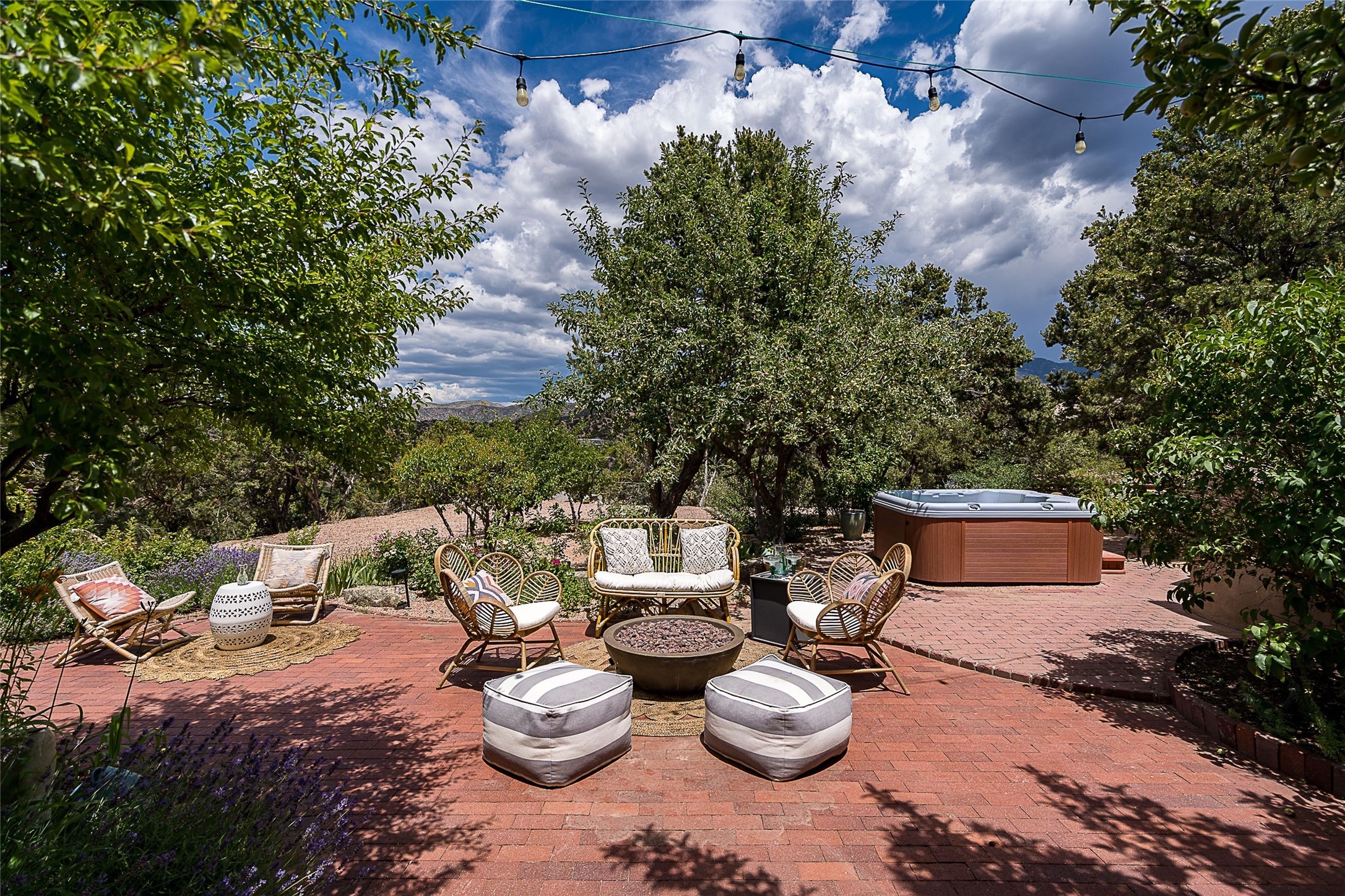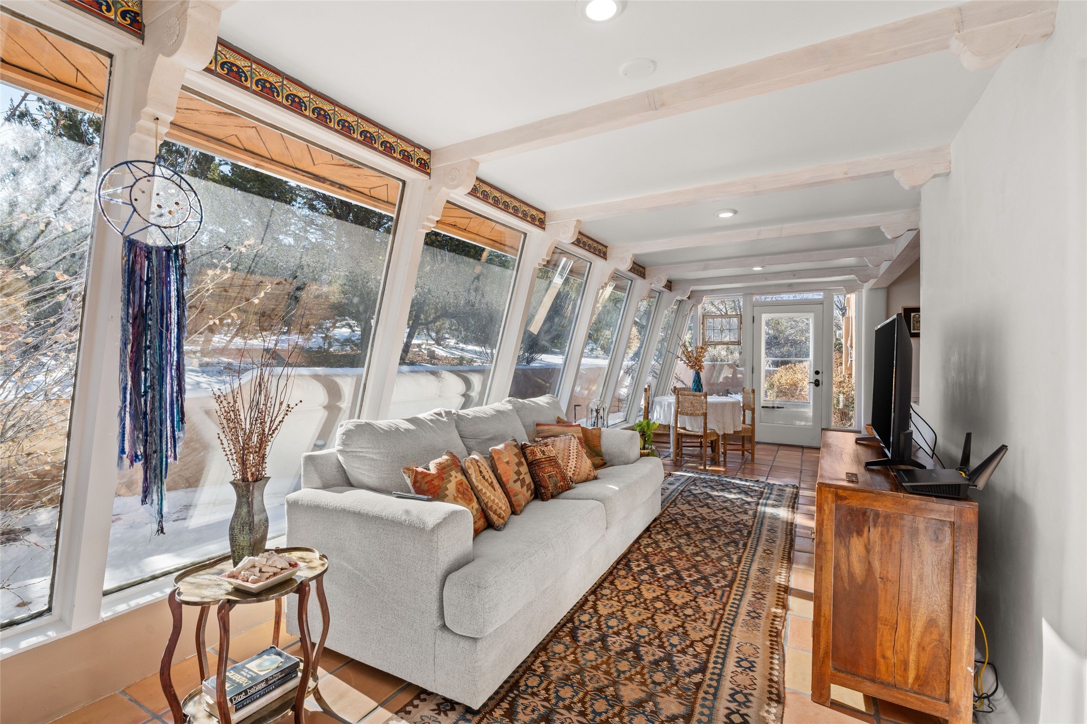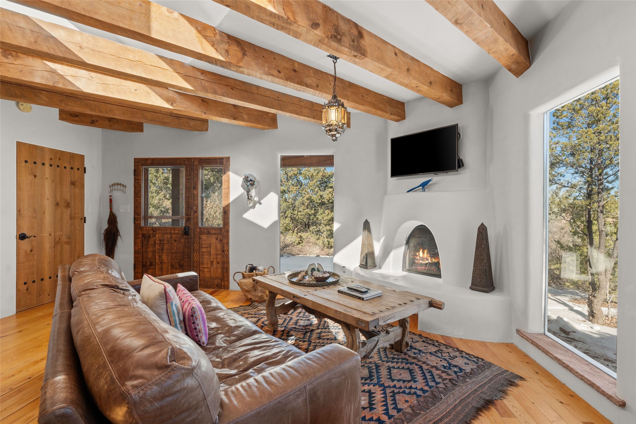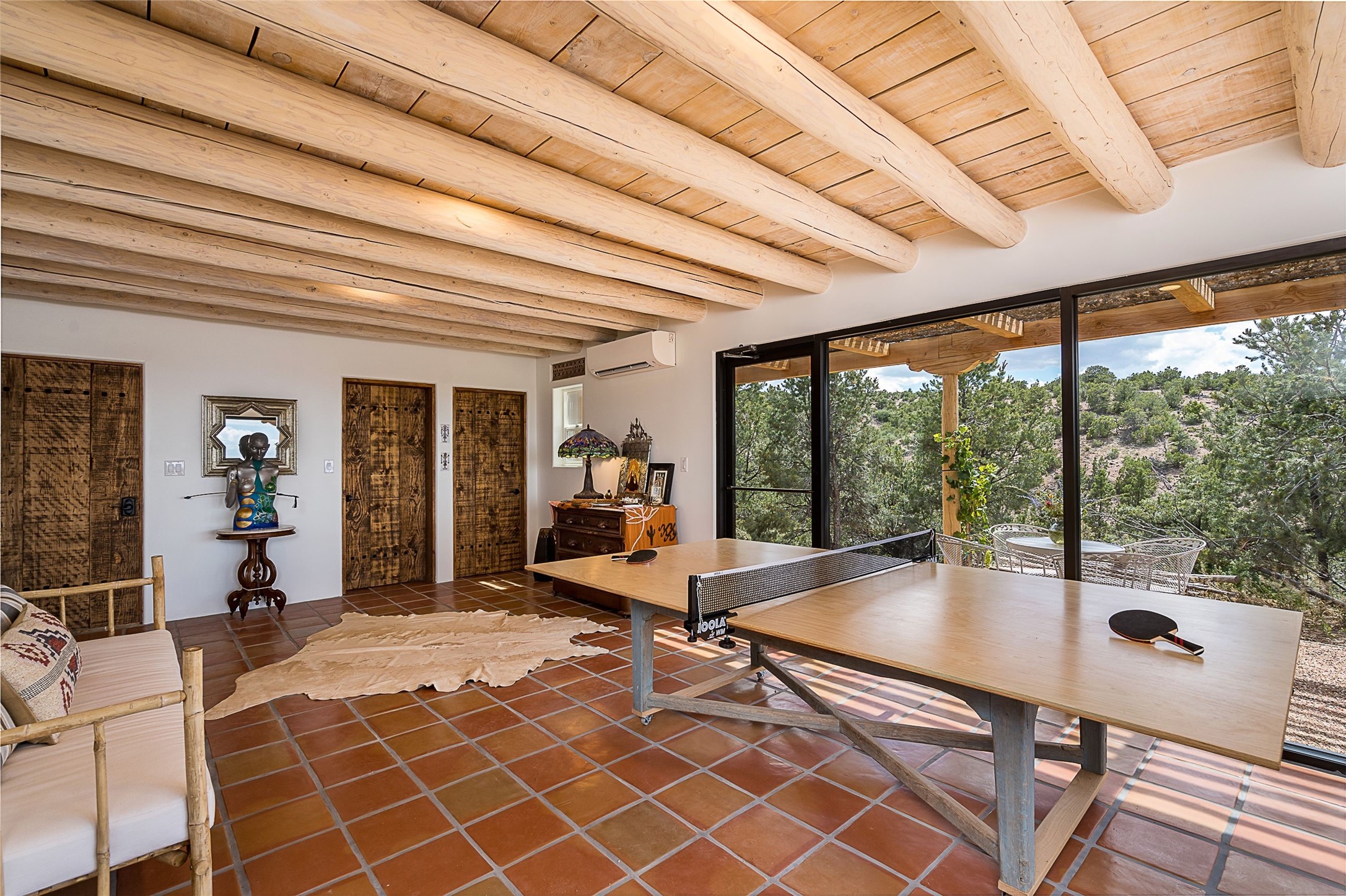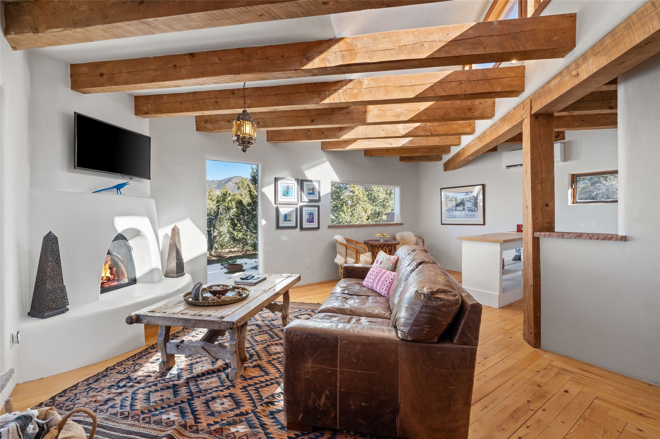 Discover serenity and style in the heart of Vista Redonda where the timeless beauty of Santa Fe-style architecture meets modern luxury in this stunningly remodeled home, set on over 5 acres of private land with awe-inspiring mountain vistas. Main residence boasts three bedrooms and two updated bathrooms. Classic vigas and beams, Saltillo tile and refinished wood floors that radiate Southwestern charm. Custom solid wood doors throughout speak to unmatched craftsmanship, while expansive picture windows bathe every room in natural light. The open-concept kitchen, is a masterpiece of design, blending vintage appliances with modern functionality. Thoughtful split bedroom plan offers privacy. In the primary suite luxury meets heritage with custom Spanish tiles enhancing the updated bathroom. Accommodate guests or tap into rental income potential with the 825 sq. ft casita, featuring one bedroom, a bath, 2 kiva fireplaces, and a kitchenette. Indulge your creative spirit in the 392 sq. ft art, wellness, or music studio. Outside, the grounds are designed with relaxation and natural beauty in mind. Whether soaking in the hot tub, enjoying evenings around the fire pit, or meandering through the labyrinth, you'll find countless ways to reconnect with nature. Mature fruit trees and flowering plants create a garden oasis. Located just moments from the Four Seasons Resort, Tesuque Village Market, Santa Fe Opera, and downtown Santa Fe, this home offers both seclusion and accessibility.