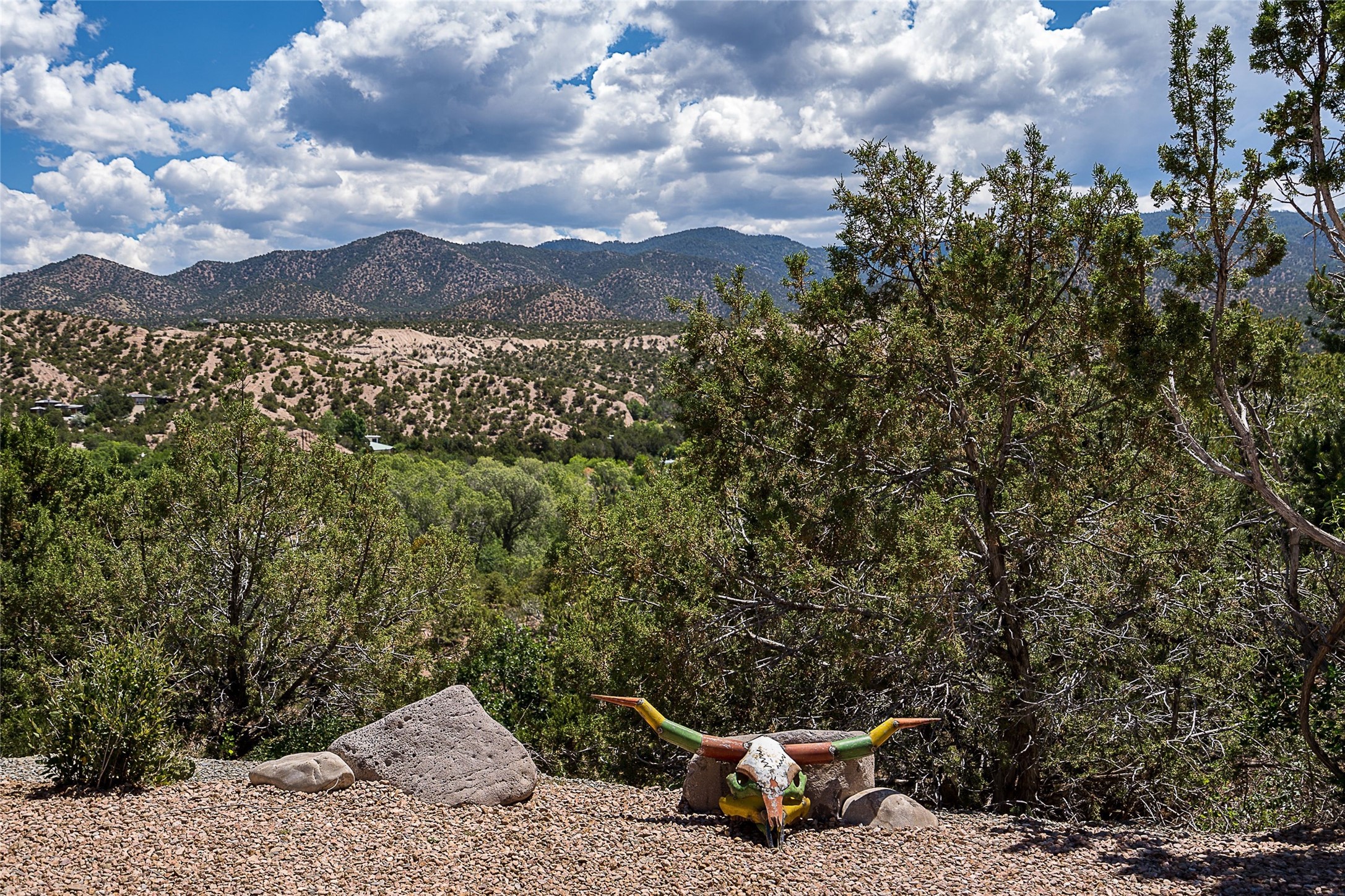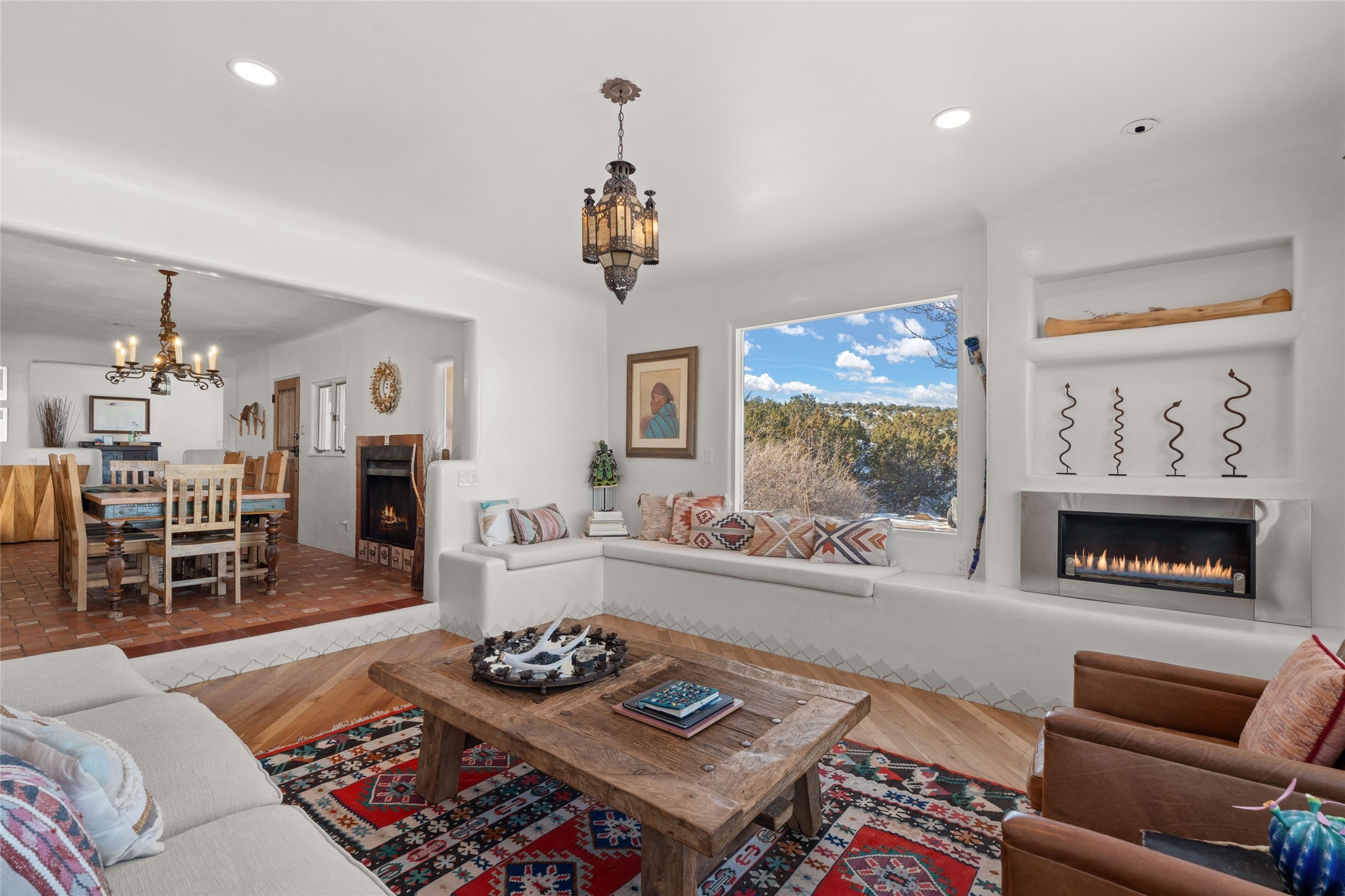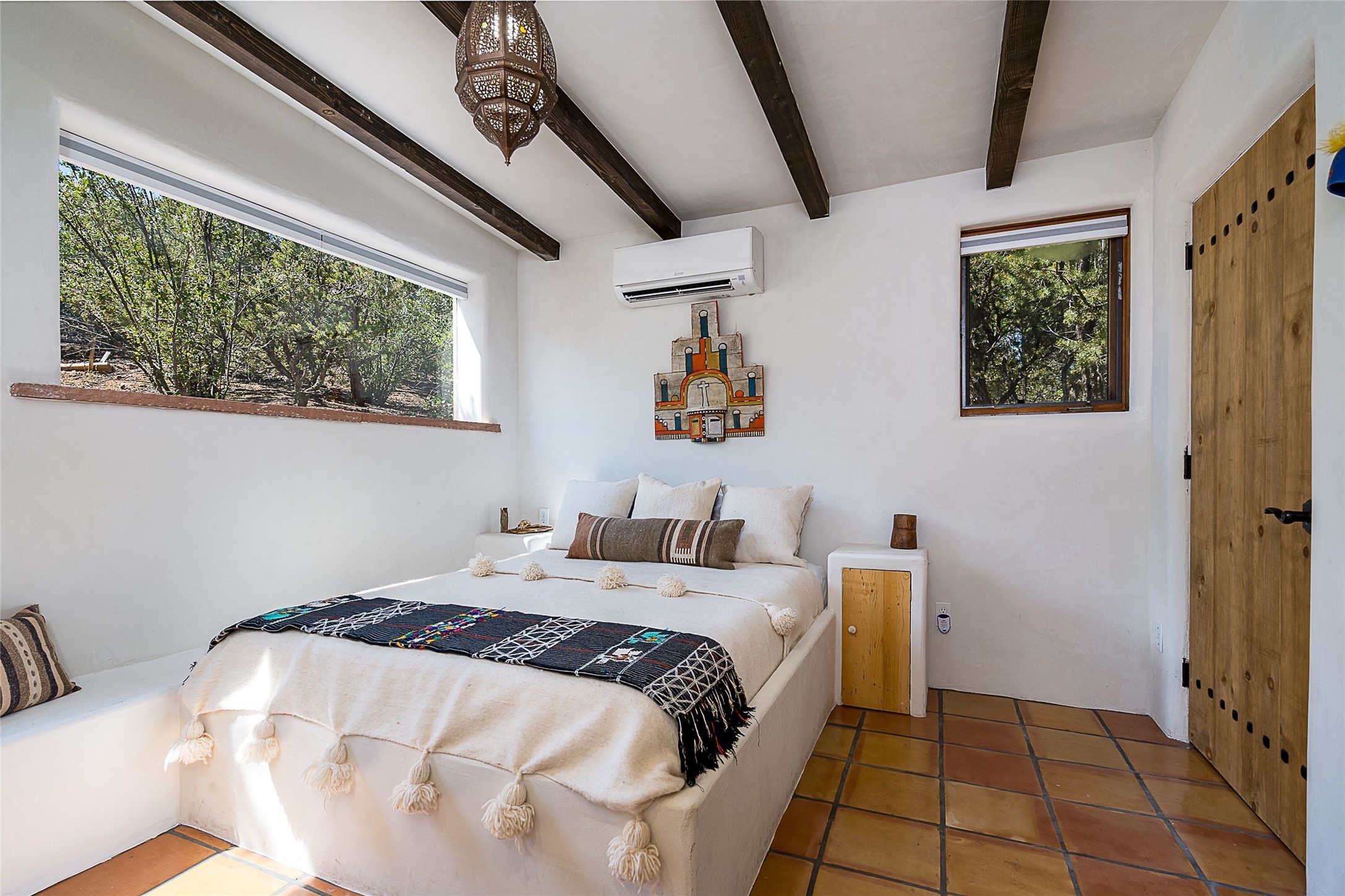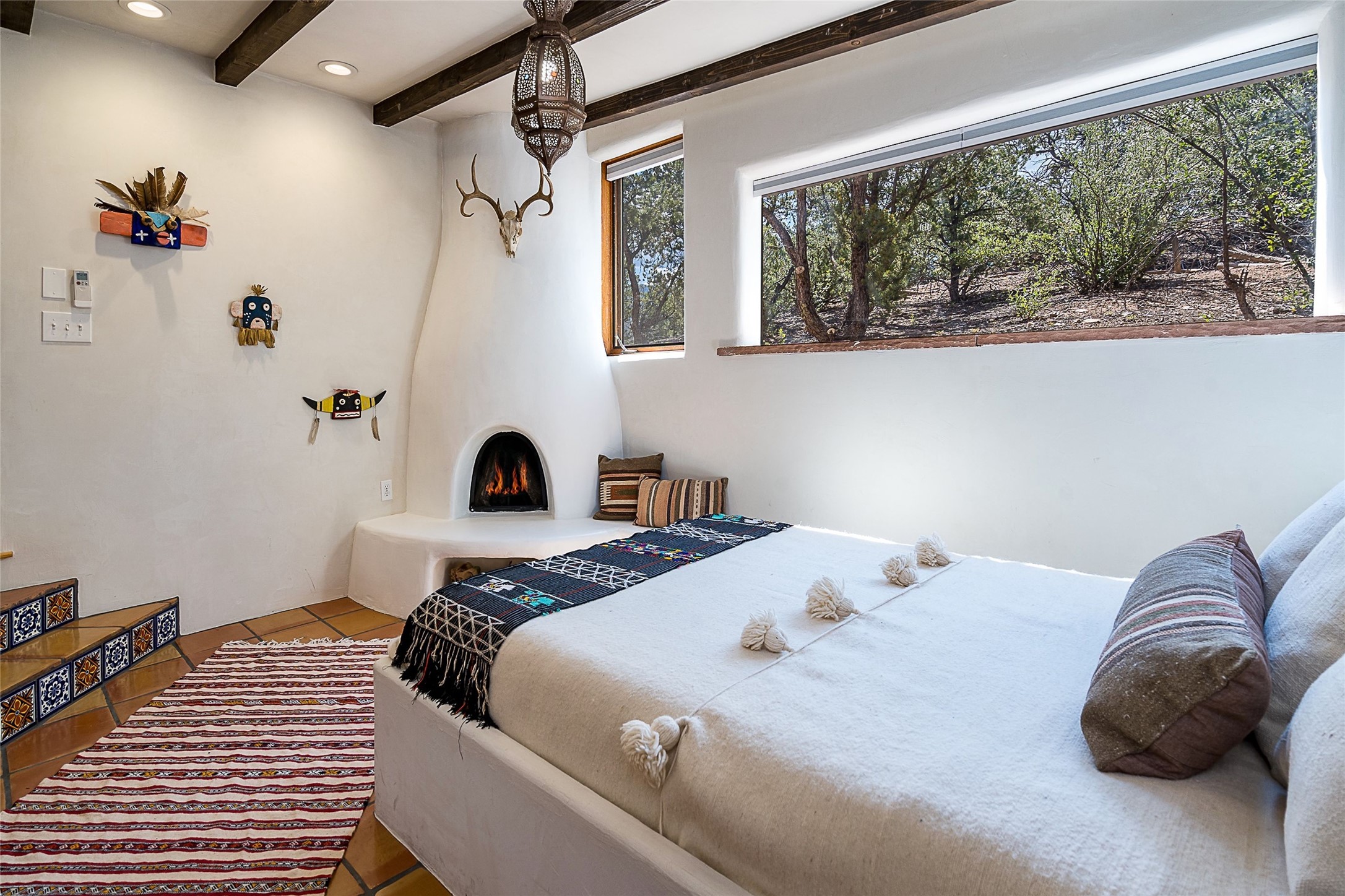 Discover serenity and style in the heart of Vista Redonda where the timeless beauty of Santa Fe-style architecture meets modern luxury in this stunningly remodeled home, set on over 5 acres of private land with awe-inspiring mountain vistas. Main residence boasts three bedrooms and two updated bathrooms. Classic vigas and beams, Saltillo tile and refinished wood floors that radiate Southwestern charm. Custom solid wood doors throughout speak to unmatched craftsmanship, while expansive picture windows bathe every room in natural light. The open-concept kitchen, is a masterpiece of design, blending vintage appliances with modern functionality. Thoughtful split bedroom plan offers privacy. In the primary suite luxury meets heritage with custom Spanish tiles enhancing the updated bathroom. Accommodate guests or tap into rental income potential with the 825 sq. ft casita, featuring one bedroom, a bath, 2 kiva fireplaces, and a kitchenette. Indulge your creative spirit in the 392 sq. ft art, wellness, or music studio. Outside, the grounds are designed with relaxation and natural beauty in mind. Whether soaking in the hot tub, enjoying evenings around the fire pit, or meandering through the labyrinth, you'll find countless ways to reconnect with nature. Mature fruit trees and flowering plants create a garden oasis. Located just moments from the Four Seasons Resort, Tesuque Village Market, Santa Fe Opera, and downtown Santa Fe, this home offers both seclusion and accessibility.