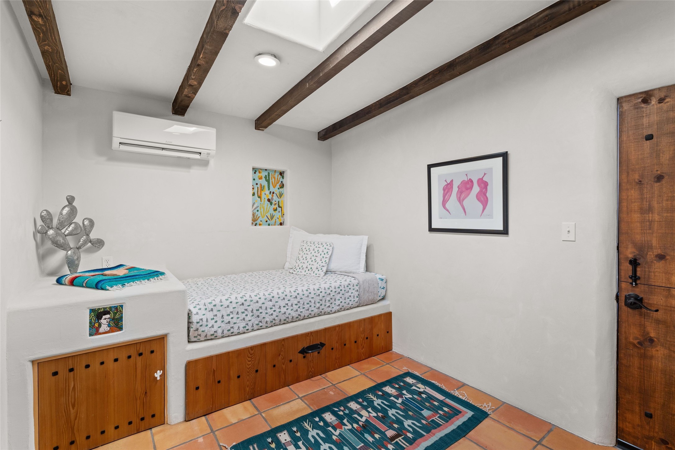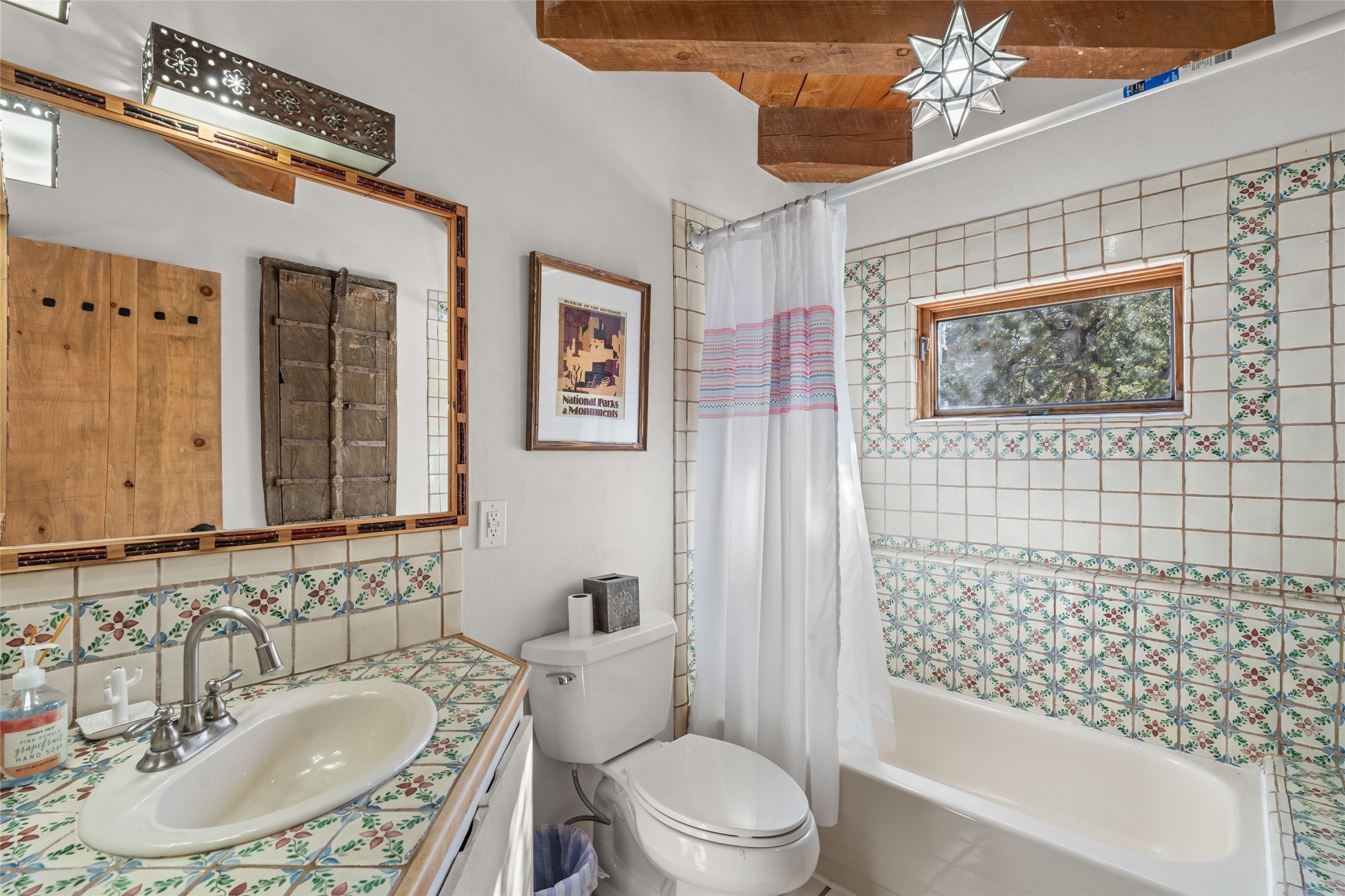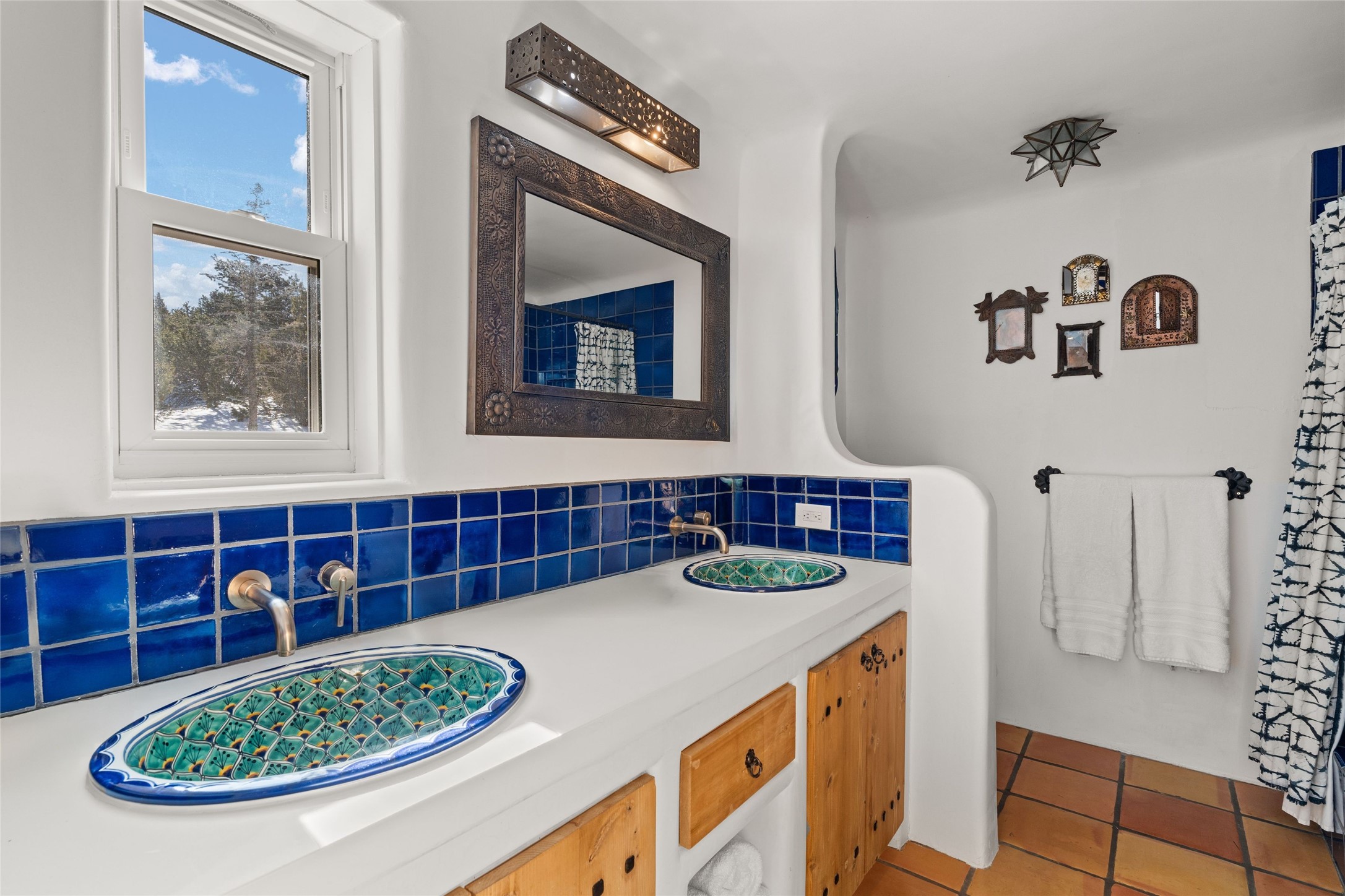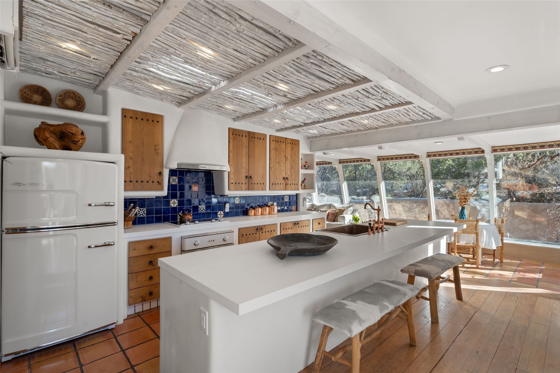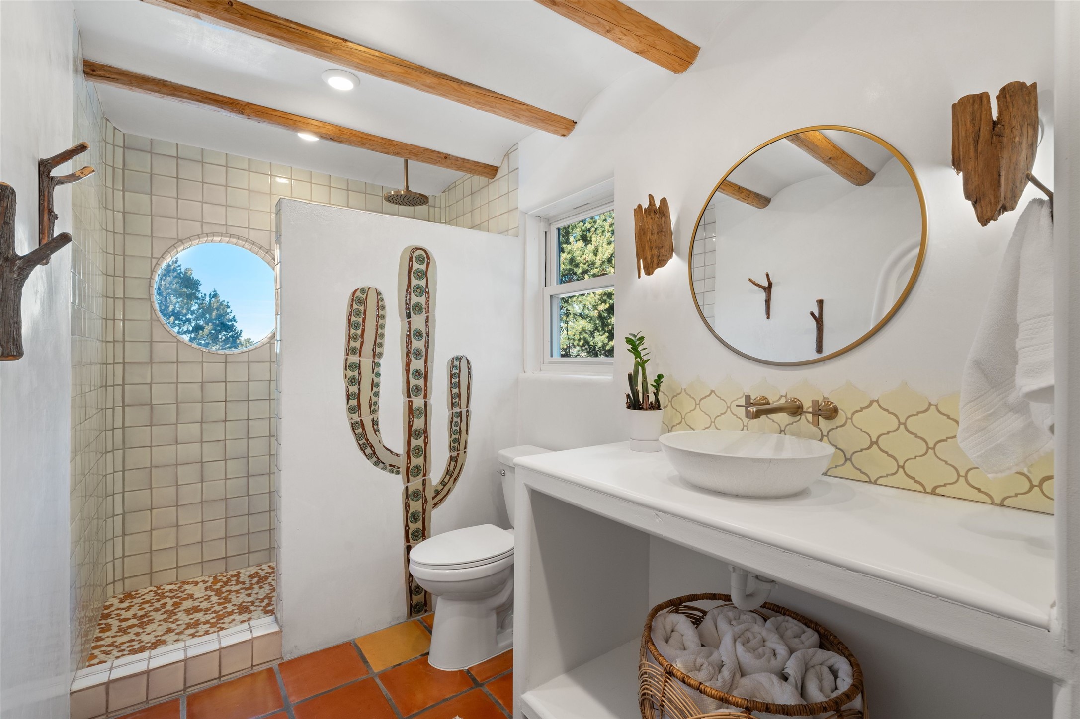 Discover serenity and style in the heart of Vista Redonda where the timeless beauty of Santa Fe-style architecture meets modern luxury in this stunningly remodeled home, set on over 5 acres of private land with awe-inspiring mountain vistas. Main residence boasts three bedrooms and two updated bathrooms. Classic vigas and beams, Saltillo tile and refinished wood floors that radiate Southwestern charm. Custom solid wood doors throughout speak to unmatched craftsmanship, while expansive picture windows bathe every room in natural light. The open-concept kitchen, is a masterpiece of design, blending vintage appliances with modern functionality. Thoughtful split bedroom plan offers privacy. In the primary suite luxury meets heritage with custom Spanish tiles enhancing the updated bathroom. Accommodate guests or tap into rental income potential with the 825 sq. ft casita, featuring one bedroom, a bath, 2 kiva fireplaces, and a kitchenette. Indulge your creative spirit in the 392 sq. ft art, wellness, or music studio. Outside, the grounds are designed with relaxation and natural beauty in mind. Whether soaking in the hot tub, enjoying evenings around the fire pit, or meandering through the labyrinth, you'll find countless ways to reconnect with nature. Mature fruit trees and flowering plants create a garden oasis. Located just moments from the Four Seasons Resort, Tesuque Village Market, Santa Fe Opera, and downtown Santa Fe, this home offers both seclusion and accessibility.