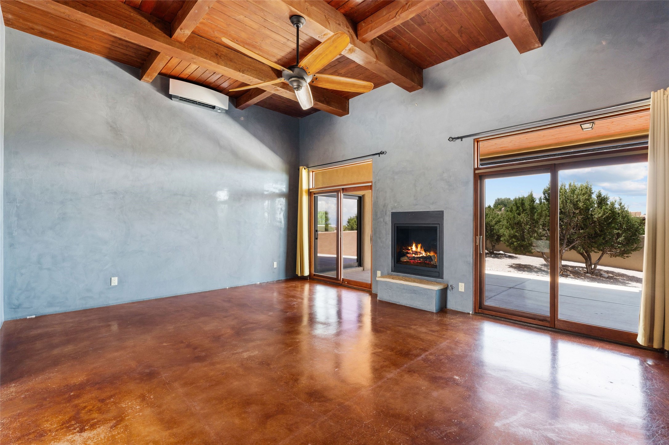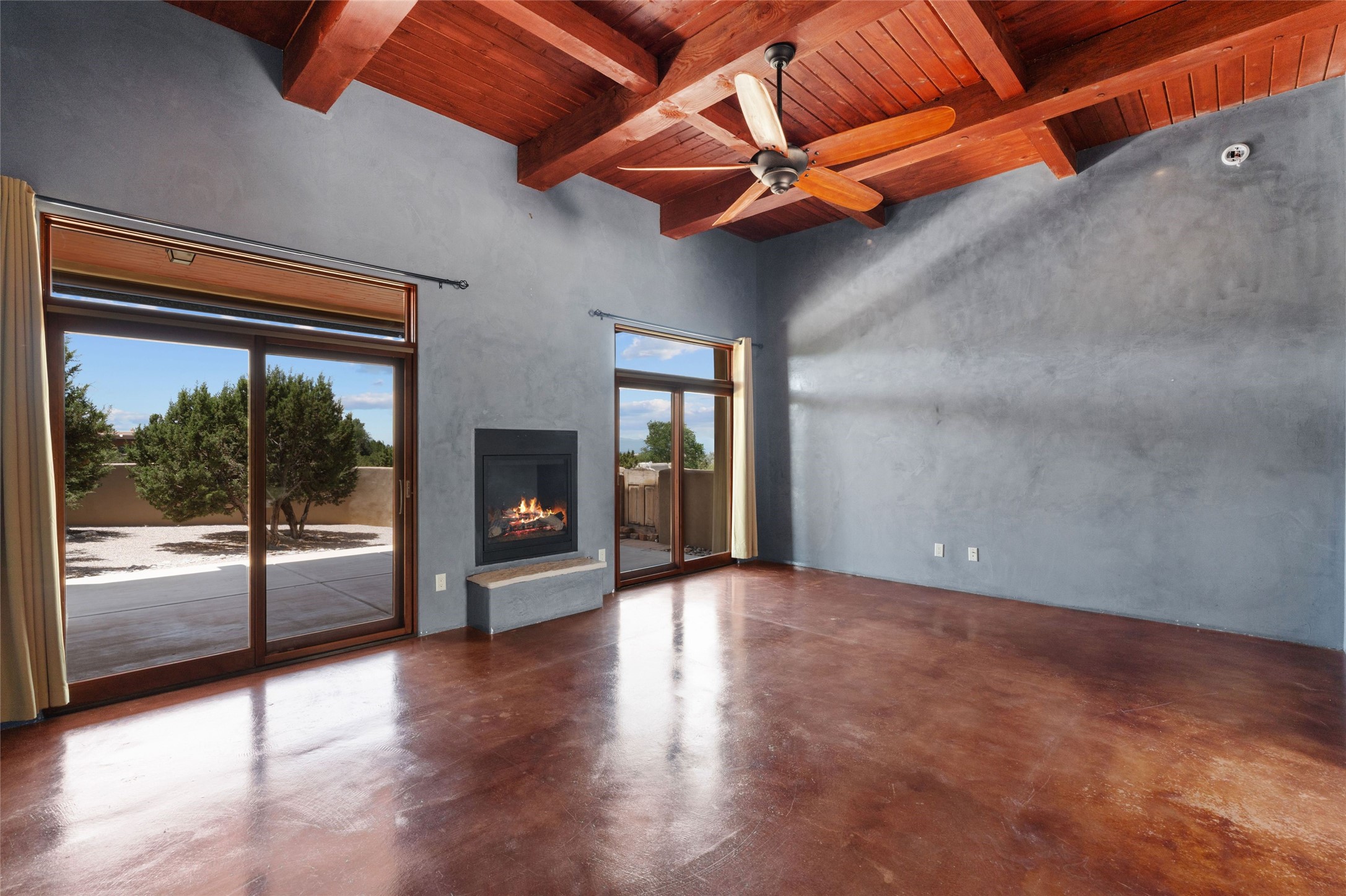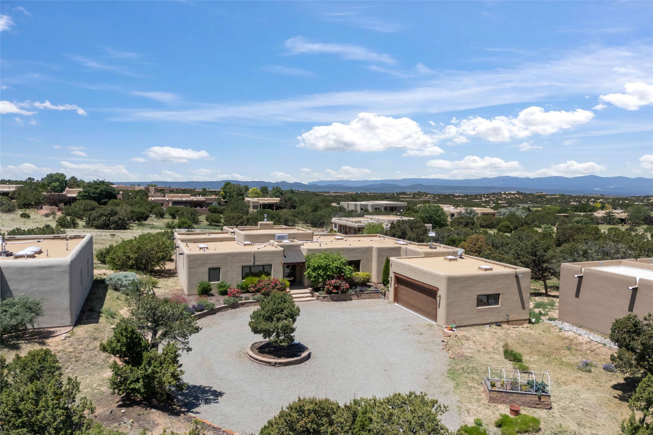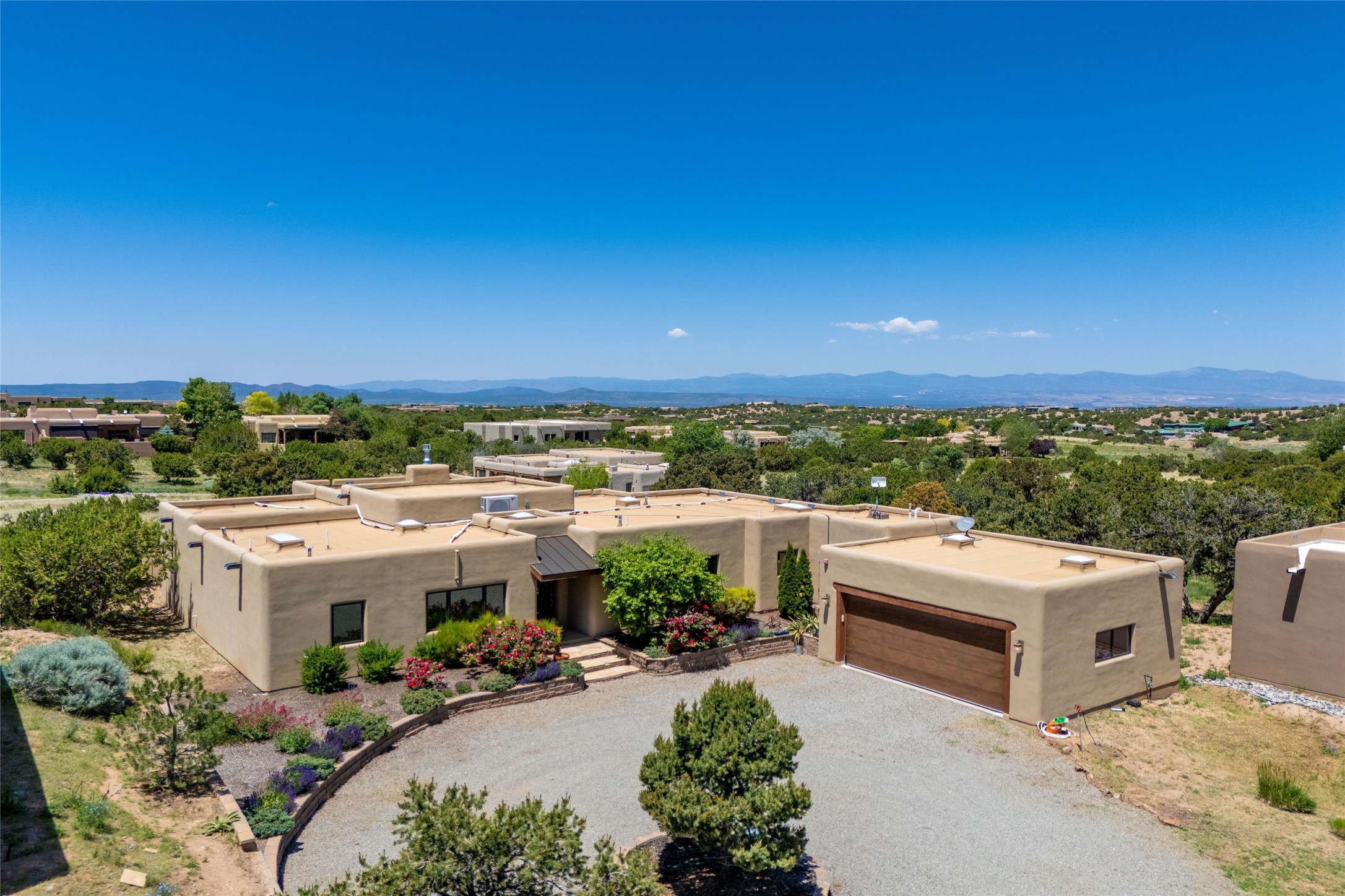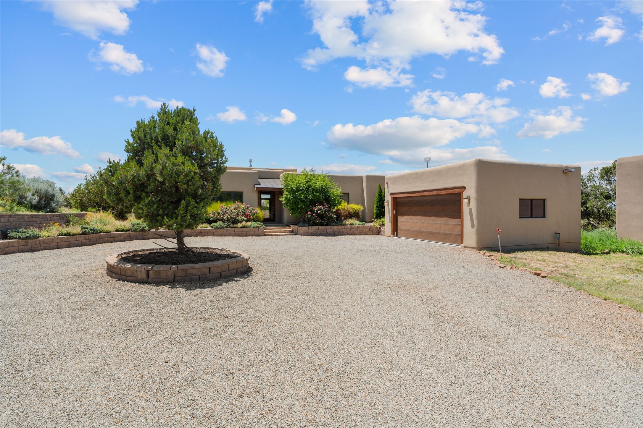 Heartstone community 3-bedroom, 3.5-bath soft contemporary home featuring sleek concrete floors, harmoniously paired with traditional Santa Fe elements, including iconic vigas and beams. Designed for convenience, this single-level property offers a spacious layout with no interior steps, making it accessible and easy to navigate. Enjoy the luxury of two living areas, ideal for relaxation and entertaining friends and family. The large kitchen and dining area provide the perfect backdrop for memorable gatherings. Step outside to the back portal, where a generous backyard awaits, offering sweeping views of the Jemez mountains that elevate outdoor living. In addition, enjoy Sangre de Cristo views from the front. Heartstone is characterized by half-acre lots, thoughtfully arranged around a shared meadow and many acres of permanently dedicated open space, fostering a connection to nature and tranquility. For those who enjoy an active lifestyle, the community is surrounded by a network of trails, granting access to the La Tierra Trails--a multi-use system featuring 25 miles of paths designed for hikers, cyclists, and equestrians alike. The community house serves as a venue for social gatherings and activities, complemented by exercise areas and a media room. Located in the desirable Tano Road area, this residence provides easy access to the vibrant Santa Fe Plaza, the artistic charm of Canyon Road, the Santa Fe's Farmer's Market, and the renowned Santa Fe Opera.