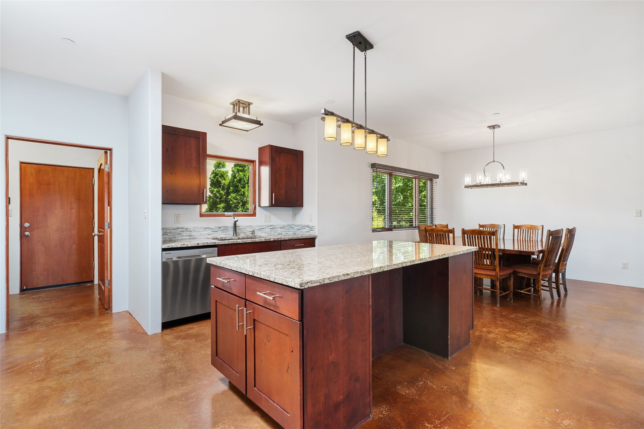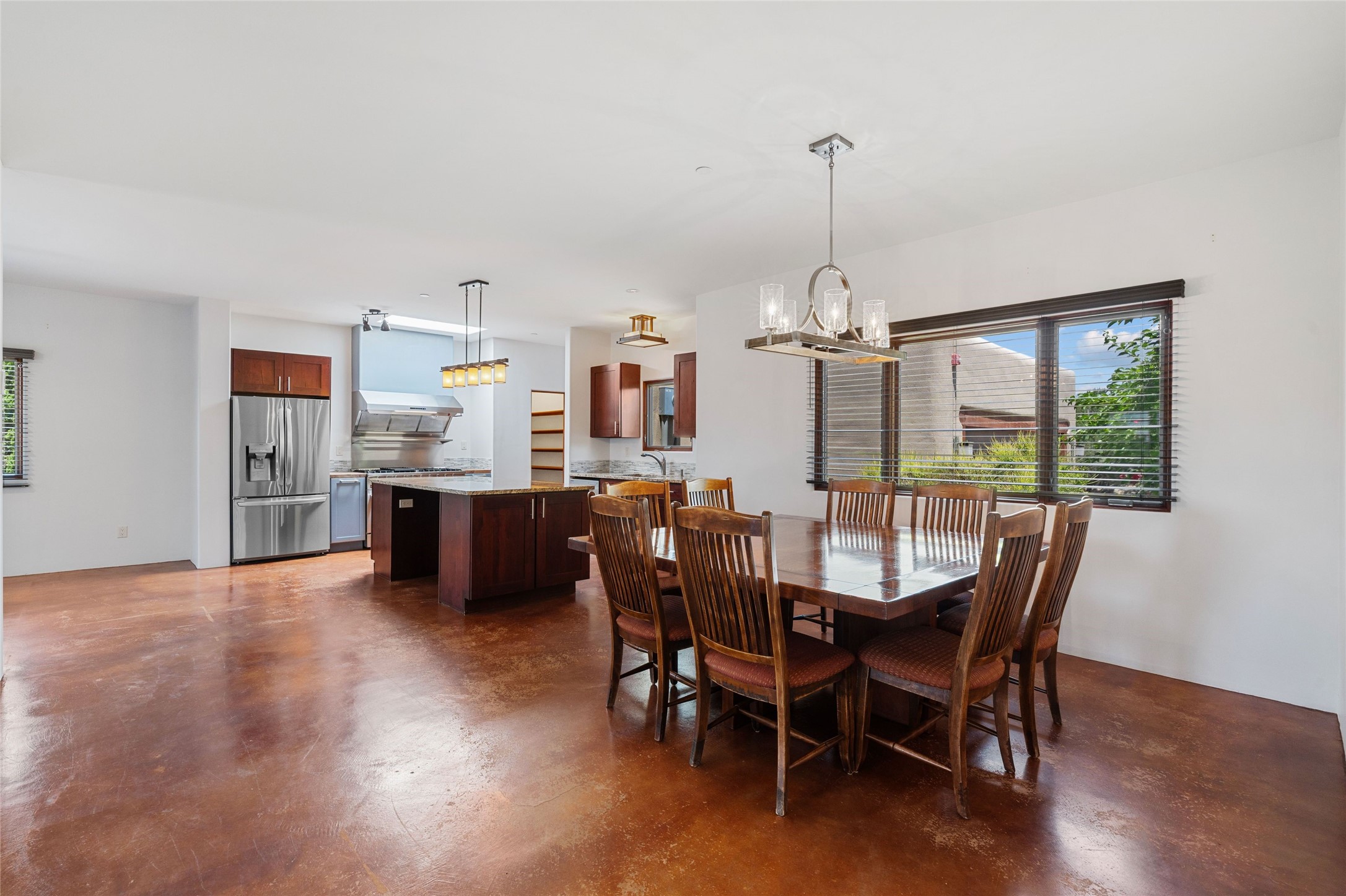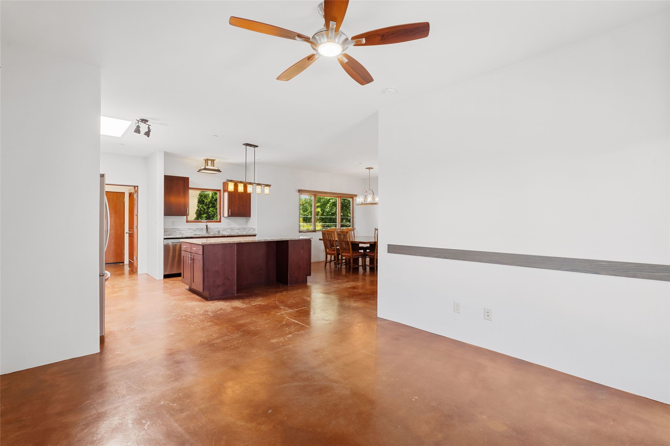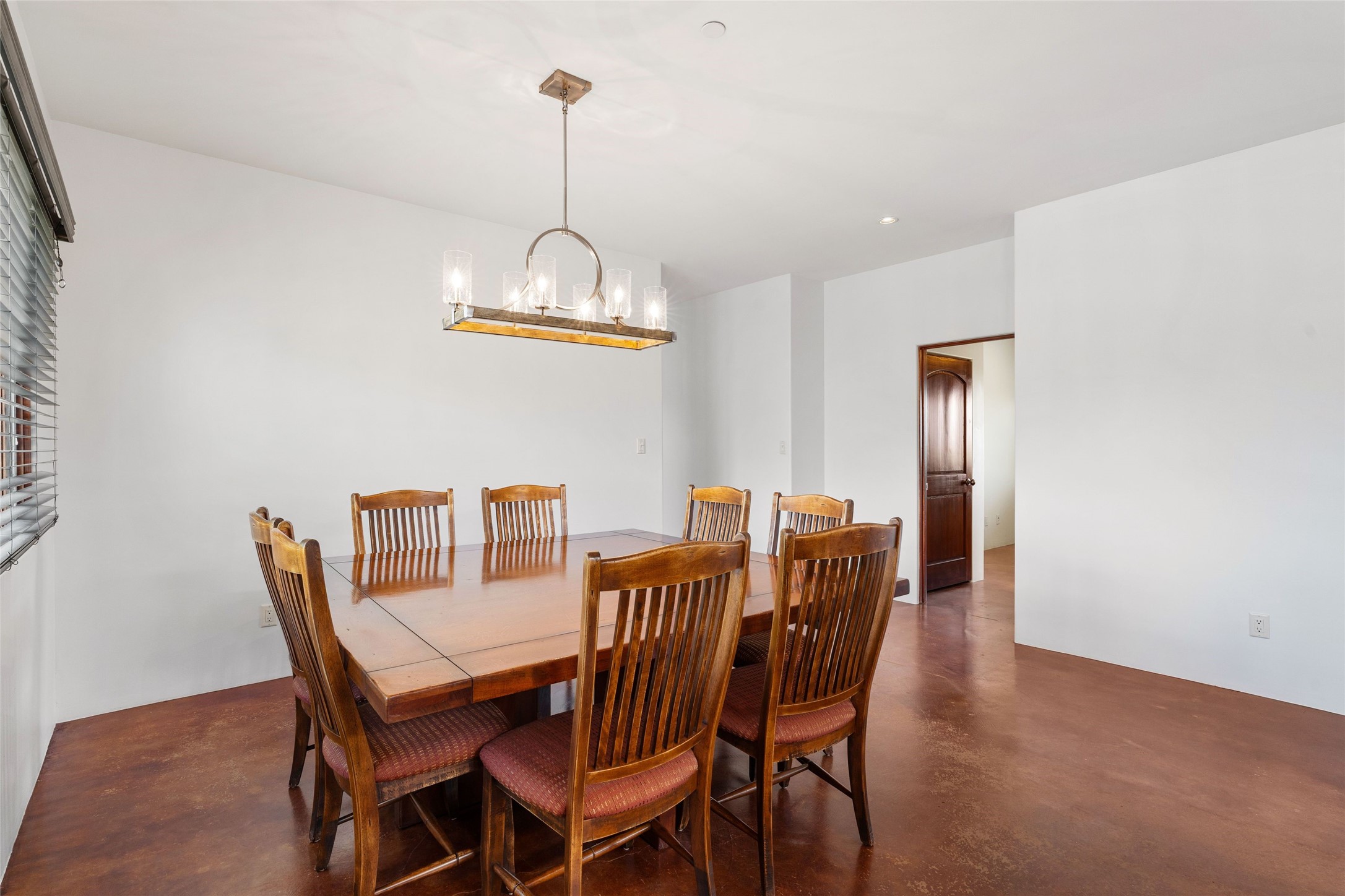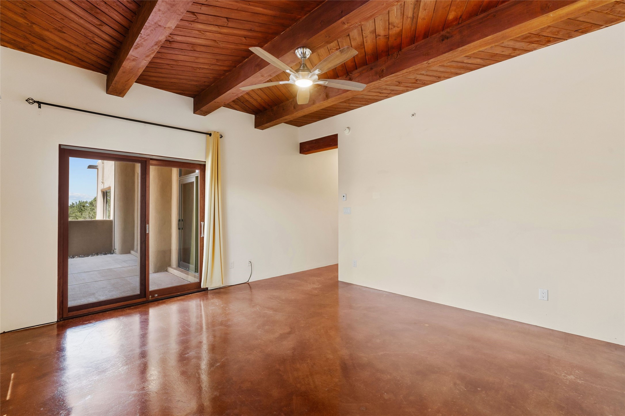 Heartstone community 3-bedroom, 3.5-bath soft contemporary home featuring sleek concrete floors, harmoniously paired with traditional Santa Fe elements, including iconic vigas and beams. Designed for convenience, this single-level property offers a spacious layout with no interior steps, making it accessible and easy to navigate. Enjoy the luxury of two living areas, ideal for relaxation and entertaining friends and family. The large kitchen and dining area provide the perfect backdrop for memorable gatherings. Step outside to the back portal, where a generous backyard awaits, offering sweeping views of the Jemez mountains that elevate outdoor living. In addition, enjoy Sangre de Cristo views from the front. Heartstone is characterized by half-acre lots, thoughtfully arranged around a shared meadow and many acres of permanently dedicated open space, fostering a connection to nature and tranquility. For those who enjoy an active lifestyle, the community is surrounded by a network of trails, granting access to the La Tierra Trails--a multi-use system featuring 25 miles of paths designed for hikers, cyclists, and equestrians alike. The community house serves as a venue for social gatherings and activities, complemented by exercise areas and a media room. Located in the desirable Tano Road area, this residence provides easy access to the vibrant Santa Fe Plaza, the artistic charm of Canyon Road, the Santa Fe's Farmer's Market, and the renowned Santa Fe Opera.