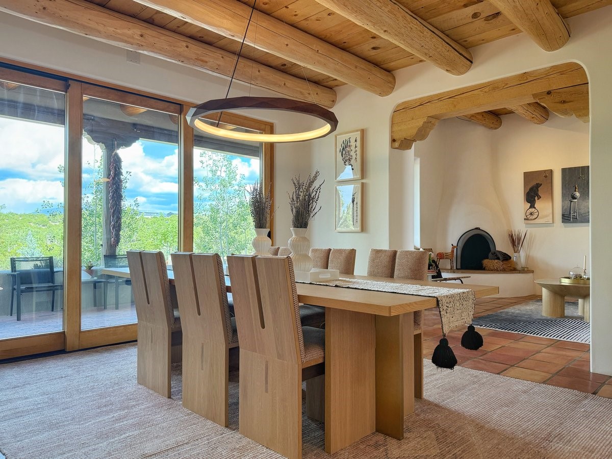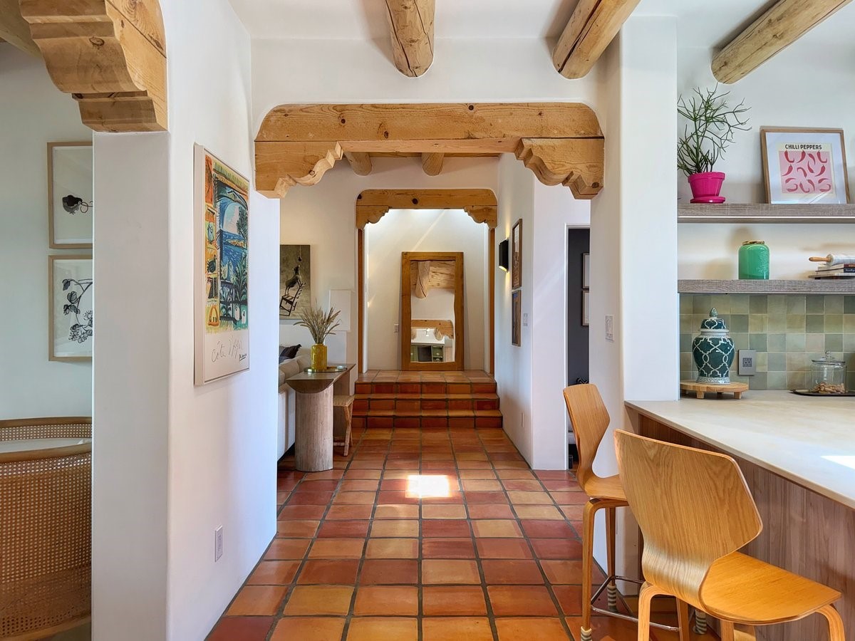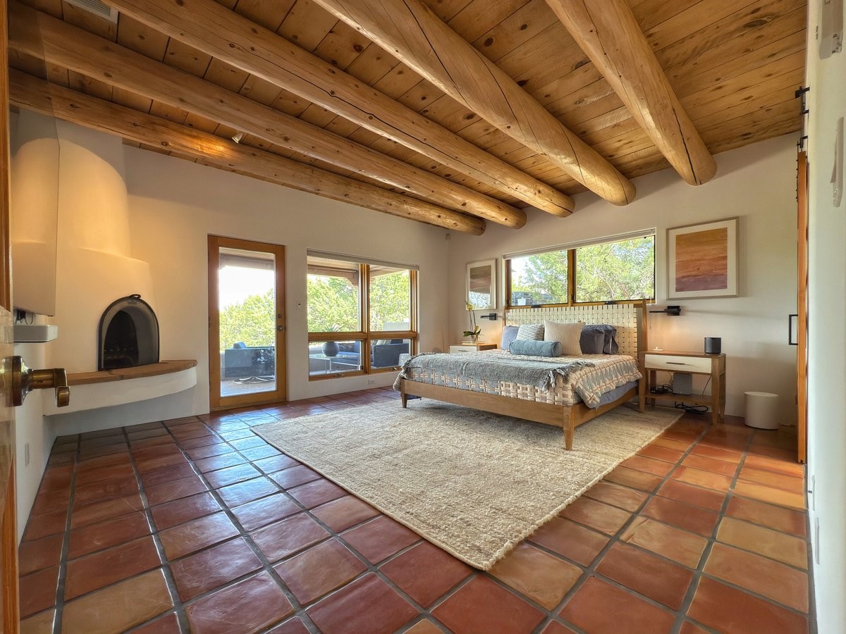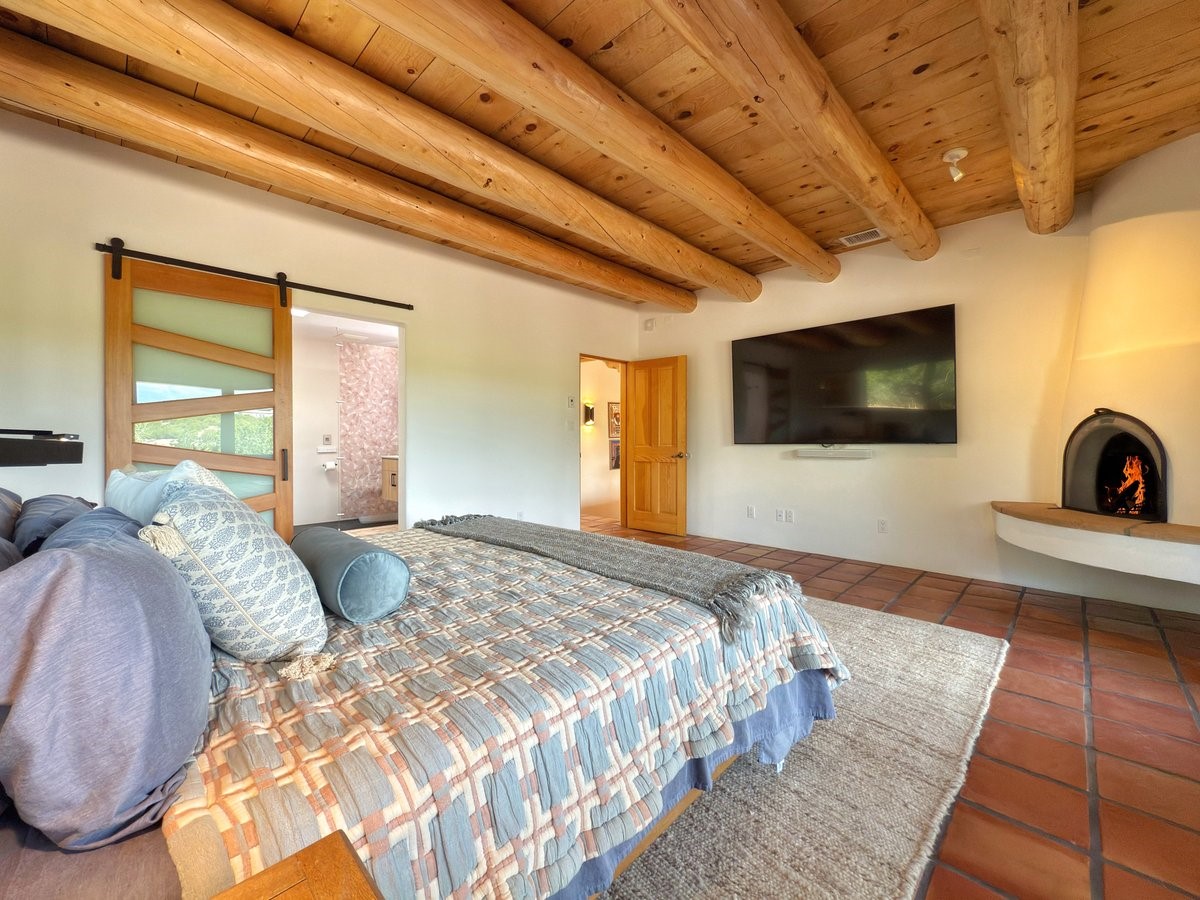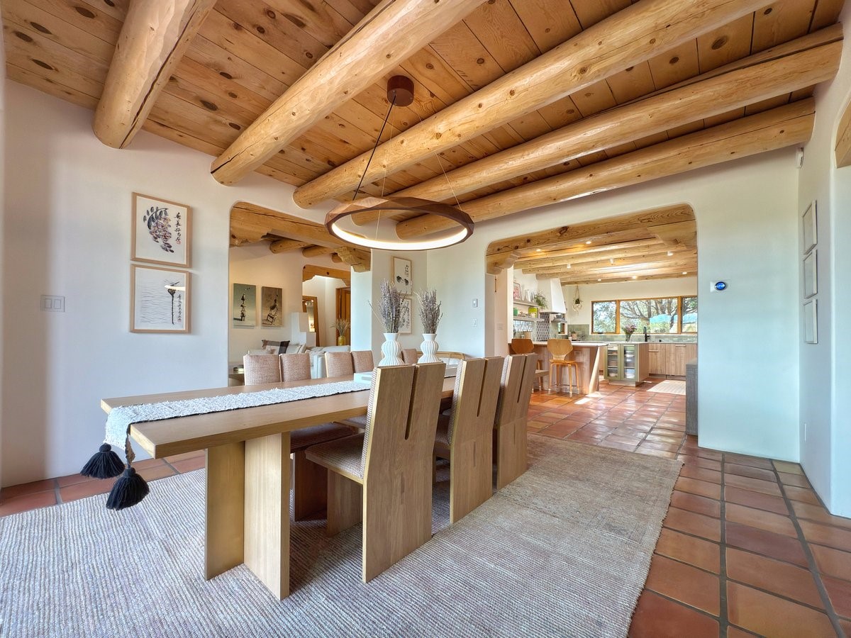 Inside, traditional elements like hand-adzed vigas, saltillo tile floors, and two cozy kiva fireplaces (one in the living room, one in the primary suite) provide that authentic Santa Fe warmth. But the heart of the home? It's the spectacular, magazine-featured kitchen. Thoughtfully remodeled by DMC Fine Cabinetry & Renovations and builder Eric Smith, this space has been showcased in Santa Fe Magazine, TREND, and more--and it shows. It's sleek, modern, and expertly designed for everyday ease and entertaining alike.