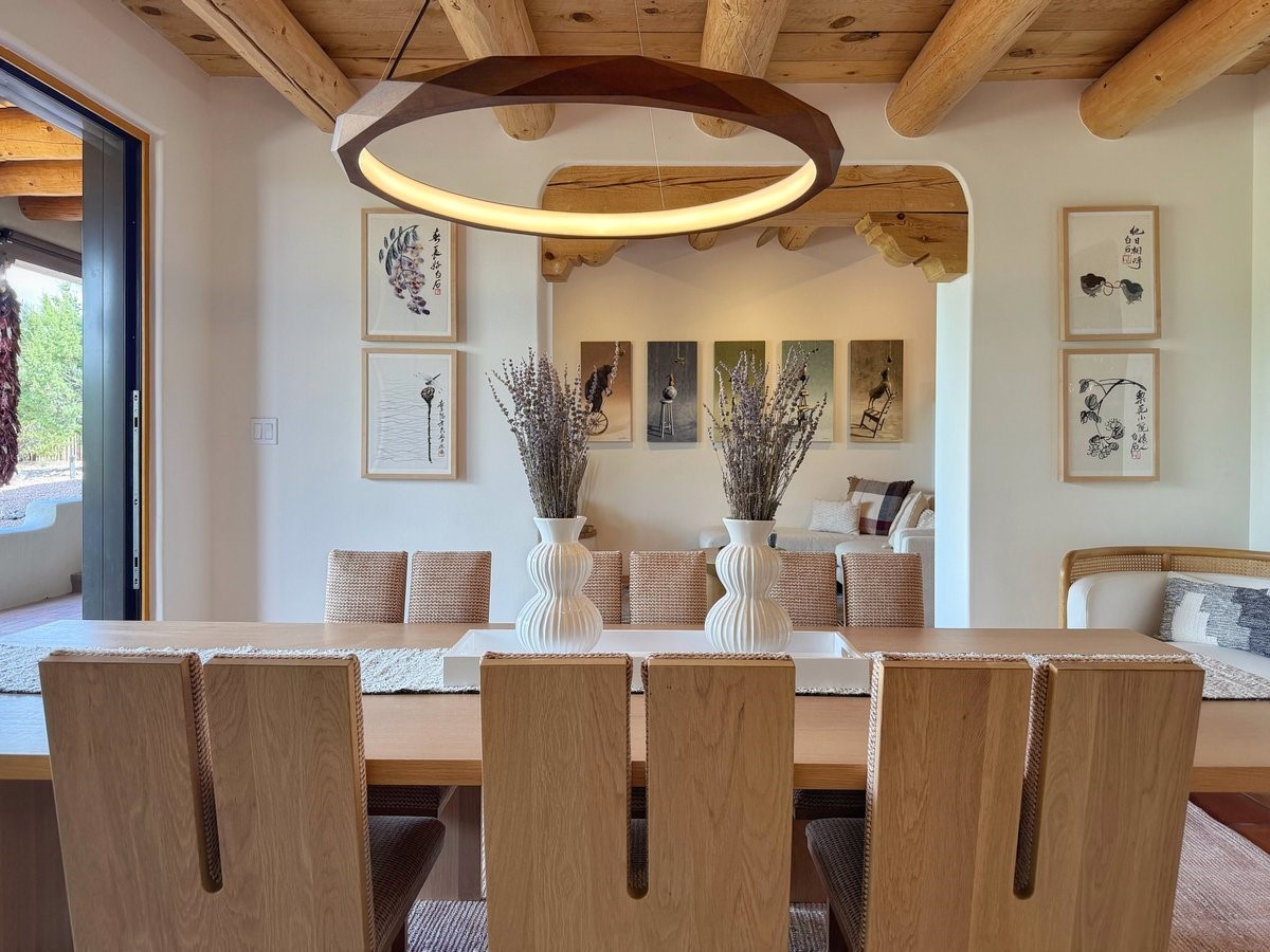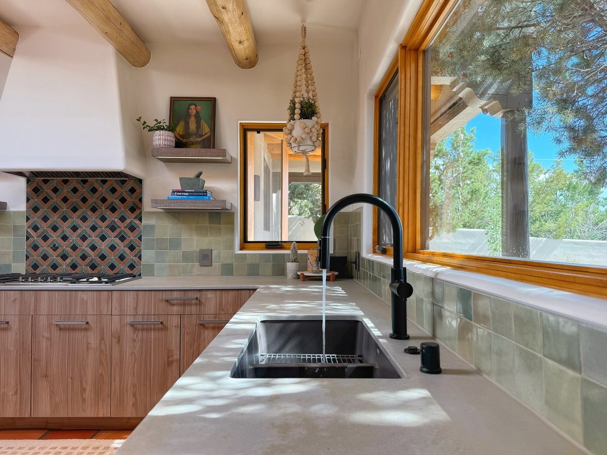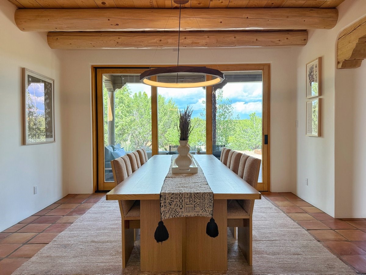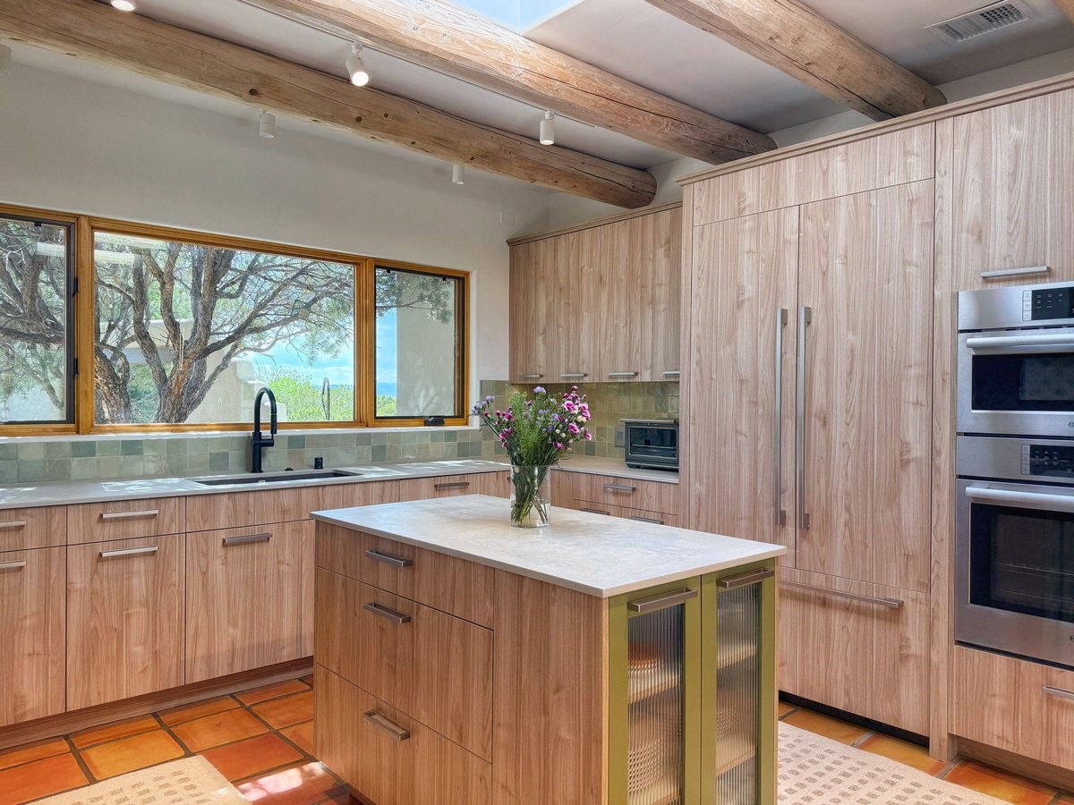 Inside, traditional elements like hand-adzed vigas, saltillo tile floors, and two cozy kiva fireplaces (one in the living room, one in the primary suite) provide that authentic Santa Fe warmth. But the heart of the home? It's the spectacular, magazine-featured kitchen. Thoughtfully remodeled by DMC Fine Cabinetry & Renovations and builder Eric Smith, this space has been showcased in Santa Fe Magazine, TREND, and more--and it shows. It's sleek, modern, and expertly designed for everyday ease and entertaining alike.