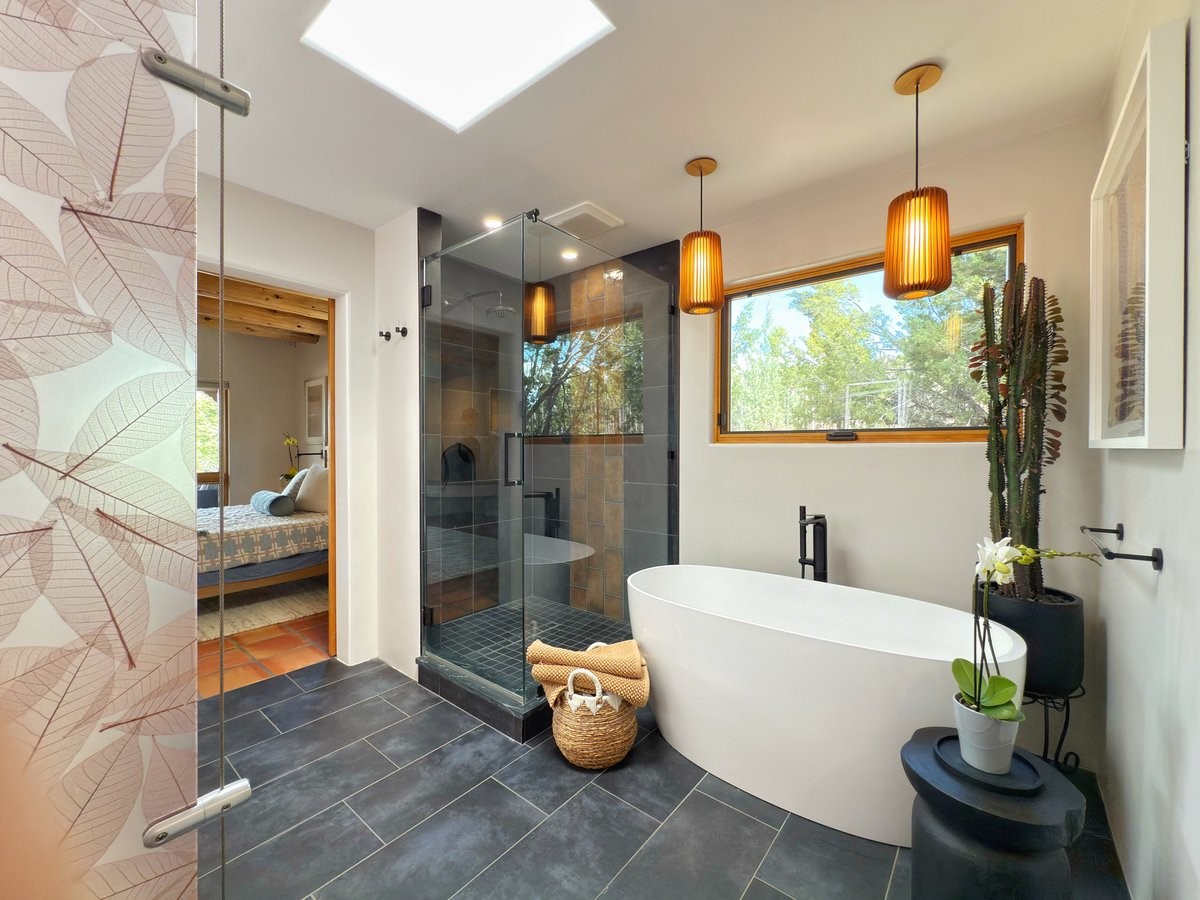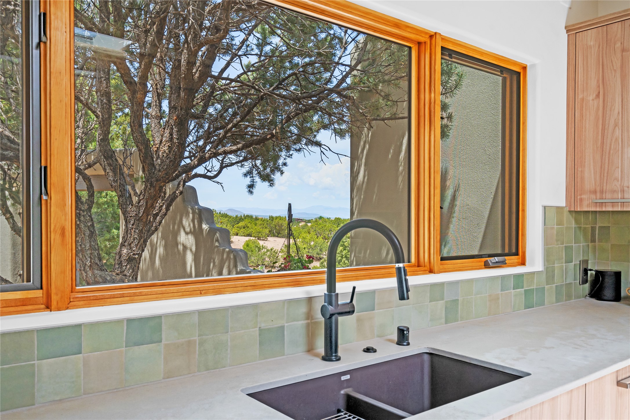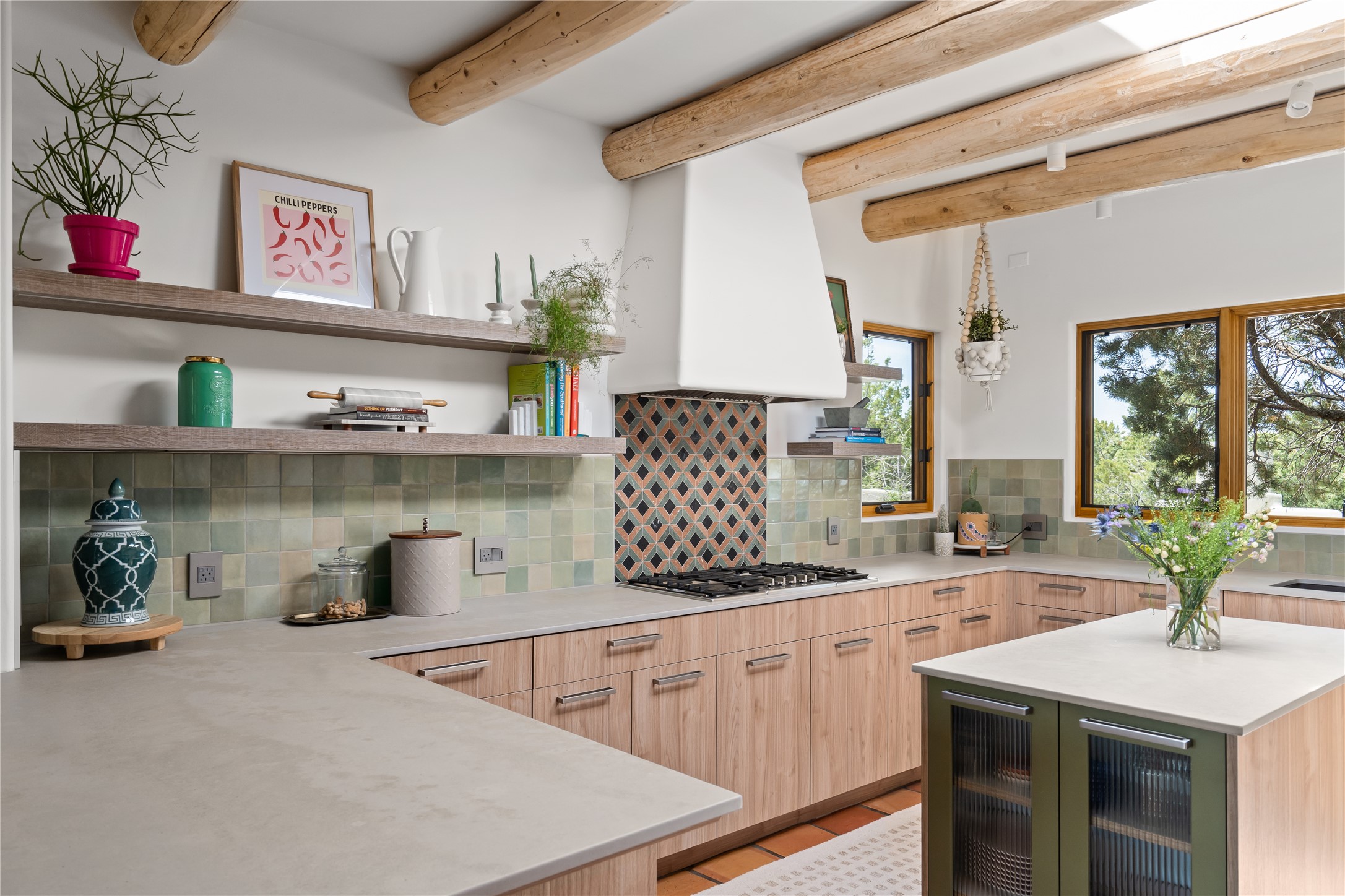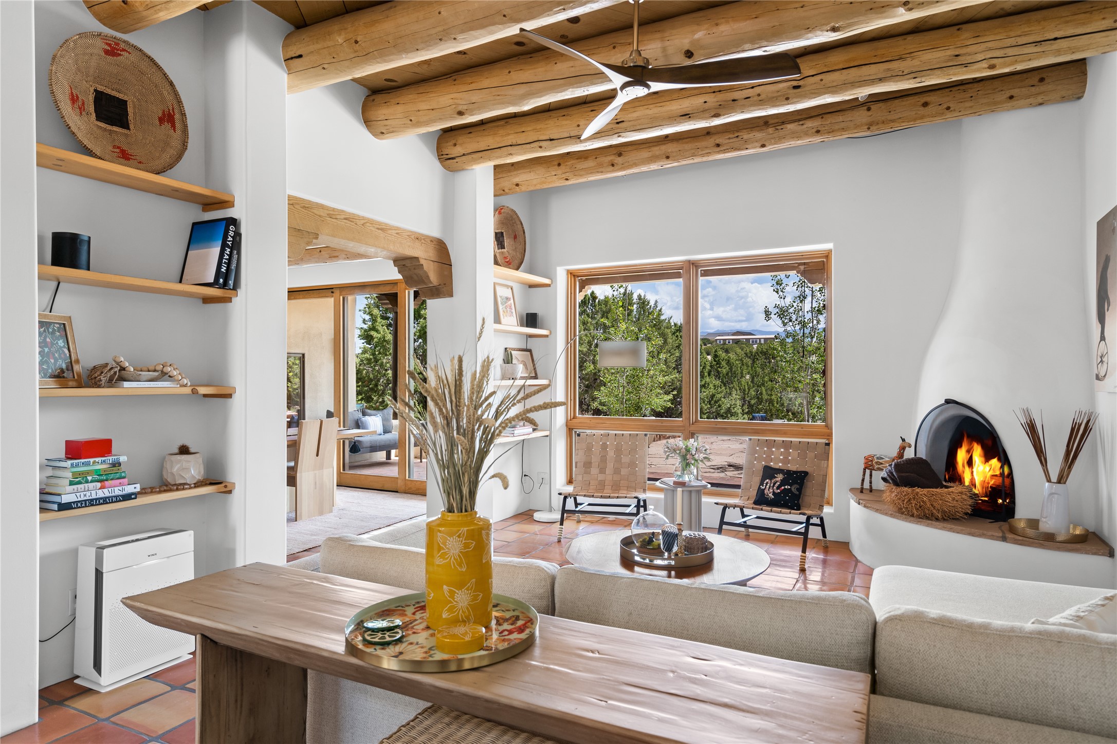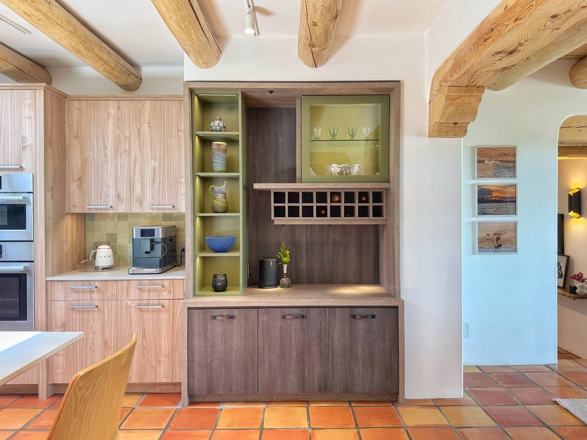 Inside, traditional elements like hand-adzed vigas, saltillo tile floors, and two cozy kiva fireplaces (one in the living room, one in the primary suite) provide that authentic Santa Fe warmth. But the heart of the home? It's the spectacular, magazine-featured kitchen. Thoughtfully remodeled by DMC Fine Cabinetry & Renovations and builder Eric Smith, this space has been showcased in Santa Fe Magazine, TREND, and more--and it shows. It's sleek, modern, and expertly designed for everyday ease and entertaining alike.