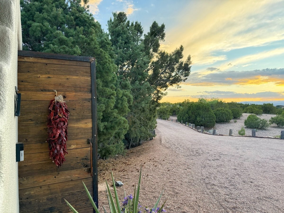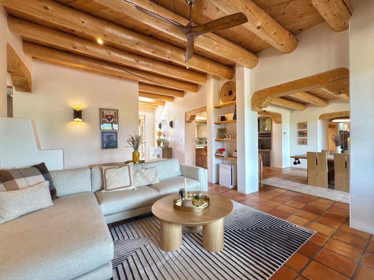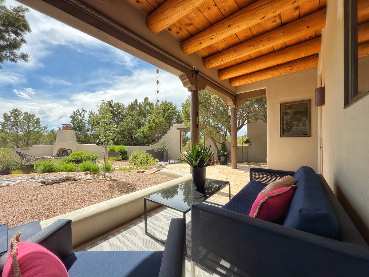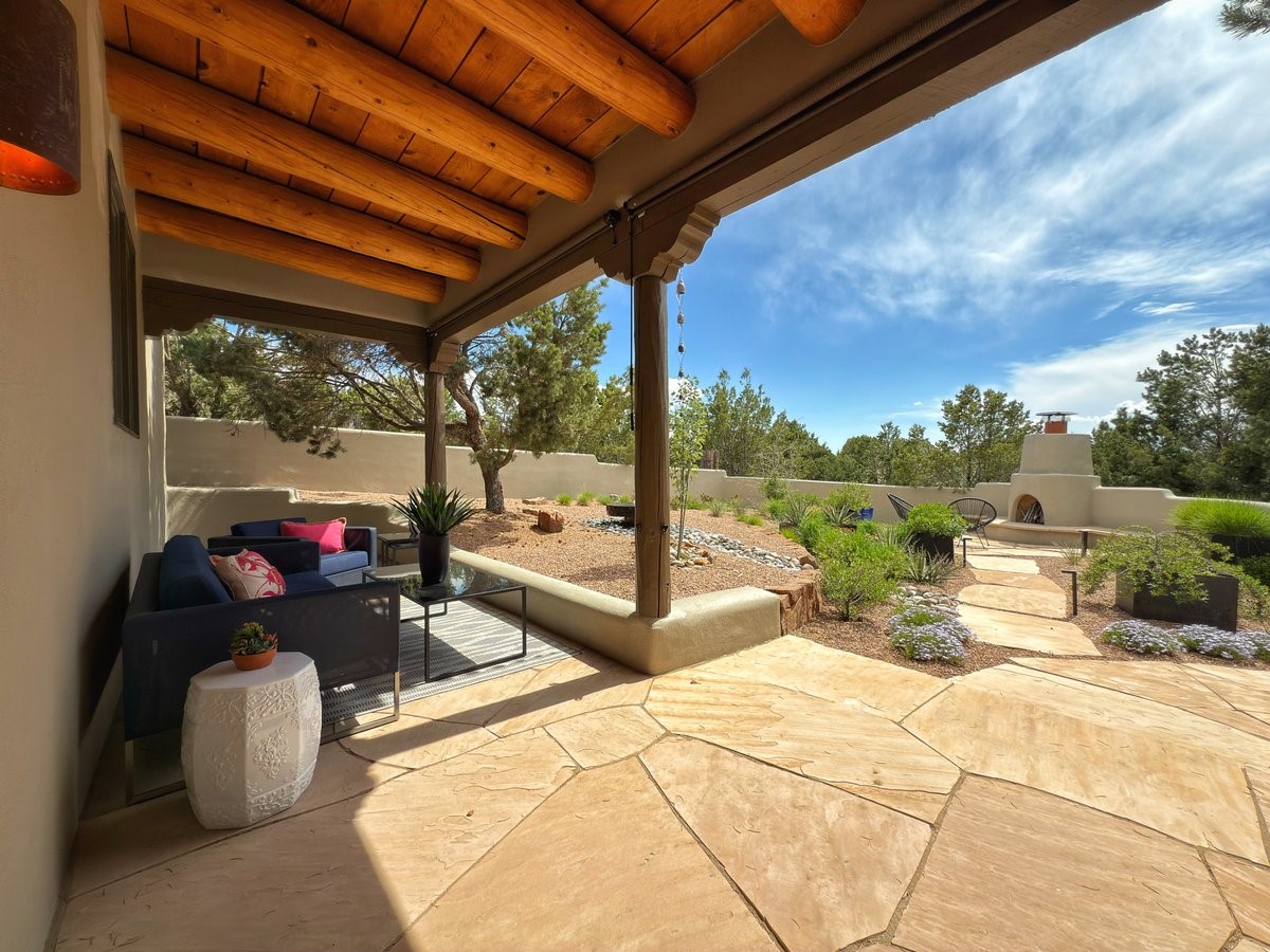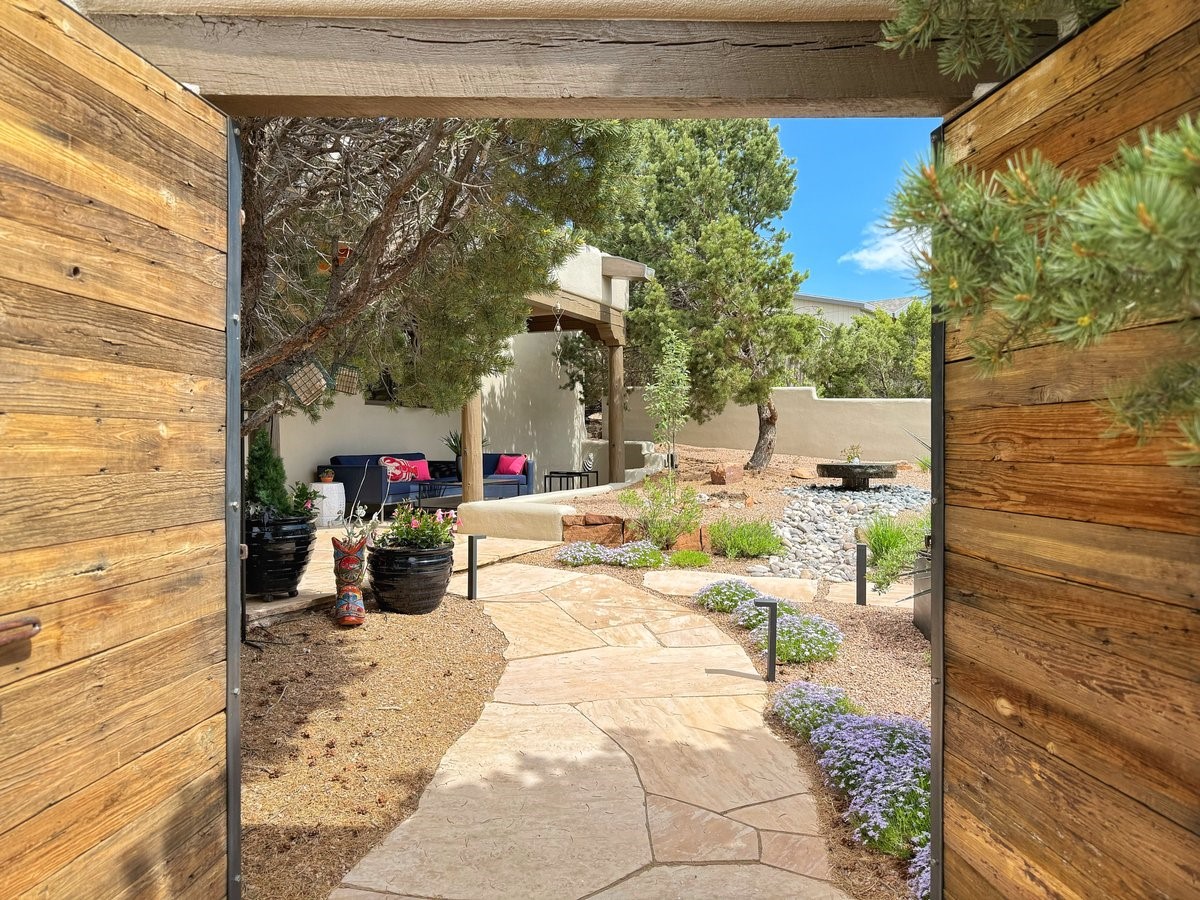 Perched on 2.5 serene acres with sweeping views of both the Jemez and Sangre de Cristo mountains, this 4-bedroom, 2-bath beauty brings together the best of Santa Fe style and mid-century design. From the moment you enter the front courtyard--complete with a kiva fireplace and peaceful water feature--you'll feel like you've stepped into your own private retreat where mid-century hip meets Santa Fe soul.