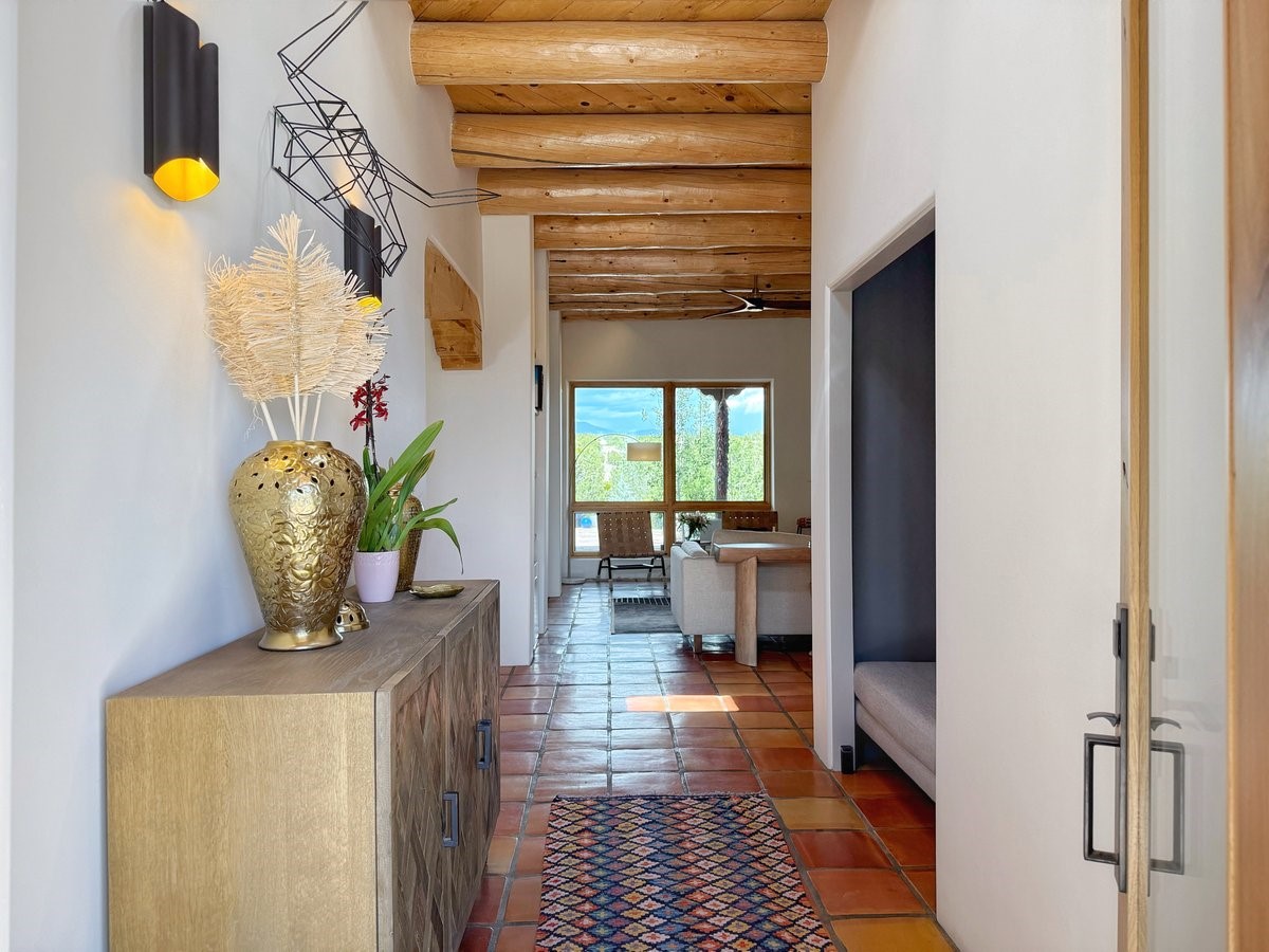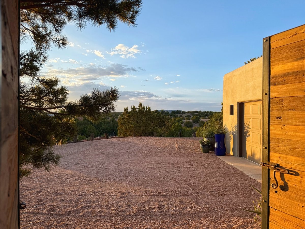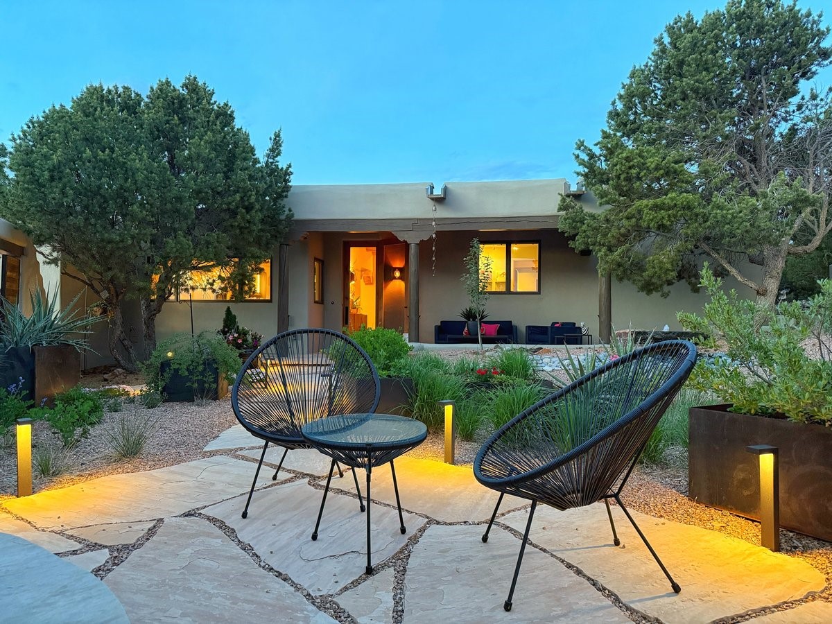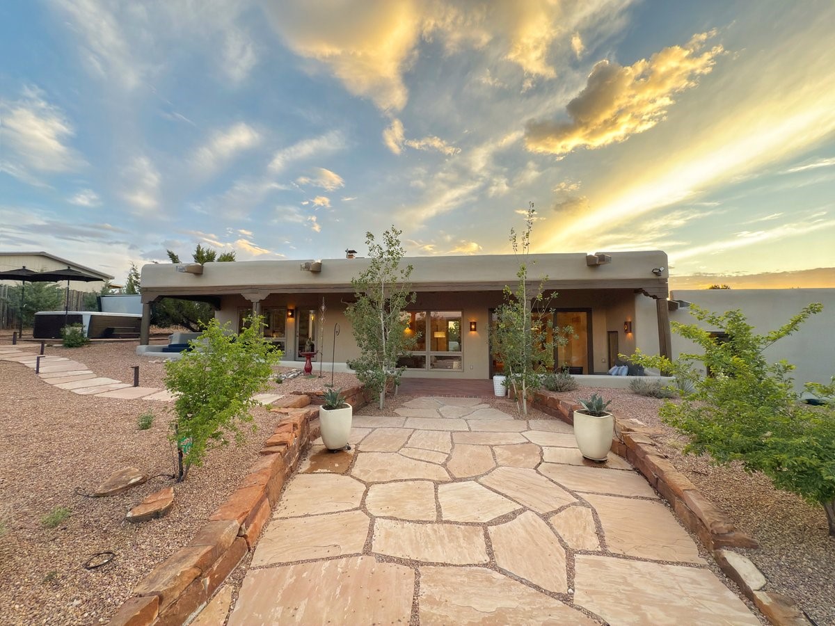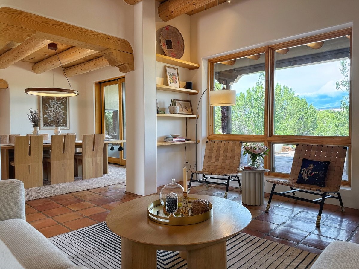 Perched on 2.5 serene acres with sweeping views of both the Jemez and Sangre de Cristo mountains, this 4-bedroom, 2-bath beauty brings together the best of Santa Fe style and mid-century design. From the moment you enter the front courtyard--complete with a kiva fireplace and peaceful water feature--you'll feel like you've stepped into your own private retreat where mid-century hip meets Santa Fe soul.