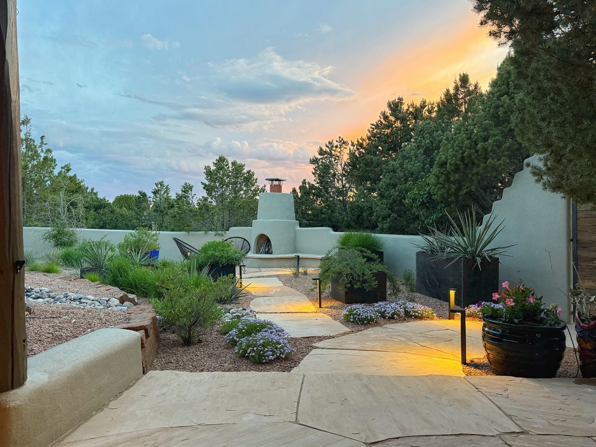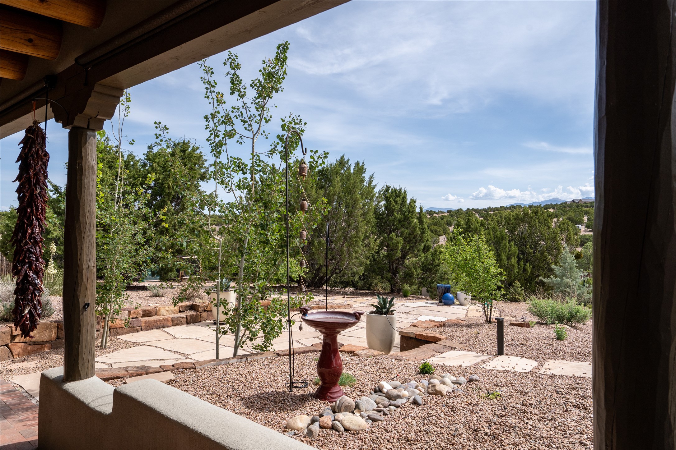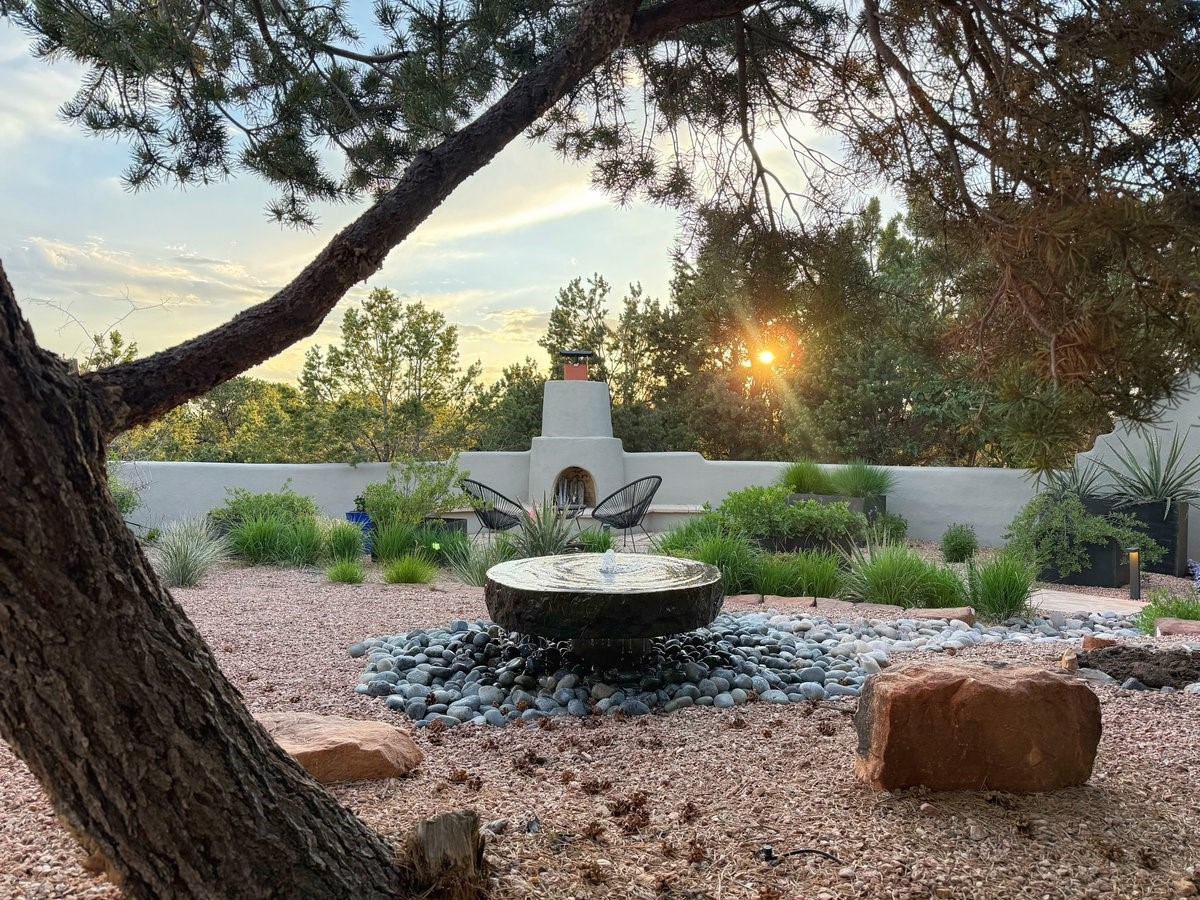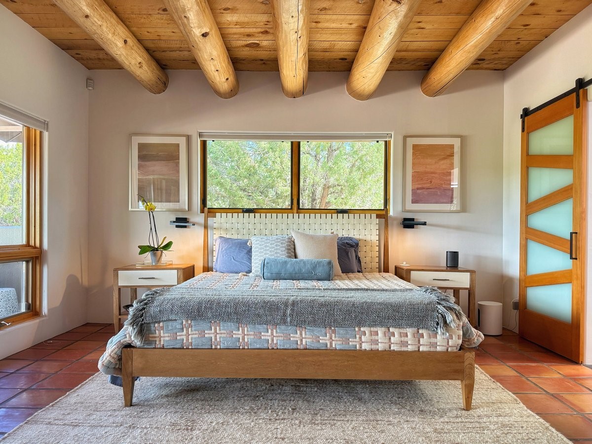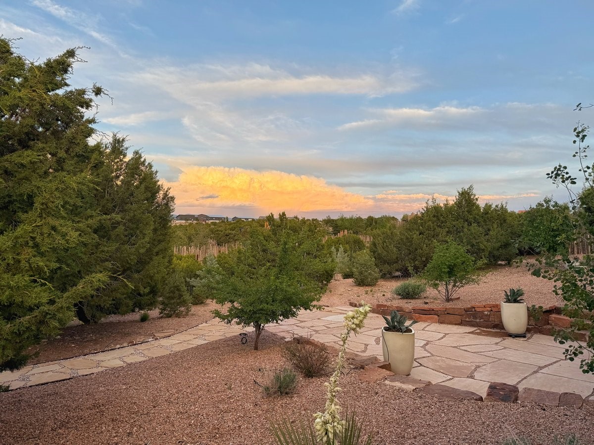 Perched on 2.5 serene acres with sweeping views of both the Jemez and Sangre de Cristo mountains, this 4-bedroom, 2-bath beauty brings together the best of Santa Fe style and mid-century design. From the moment you enter the front courtyard--complete with a kiva fireplace and peaceful water feature--you'll feel like you've stepped into your own private retreat where mid-century hip meets Santa Fe soul.